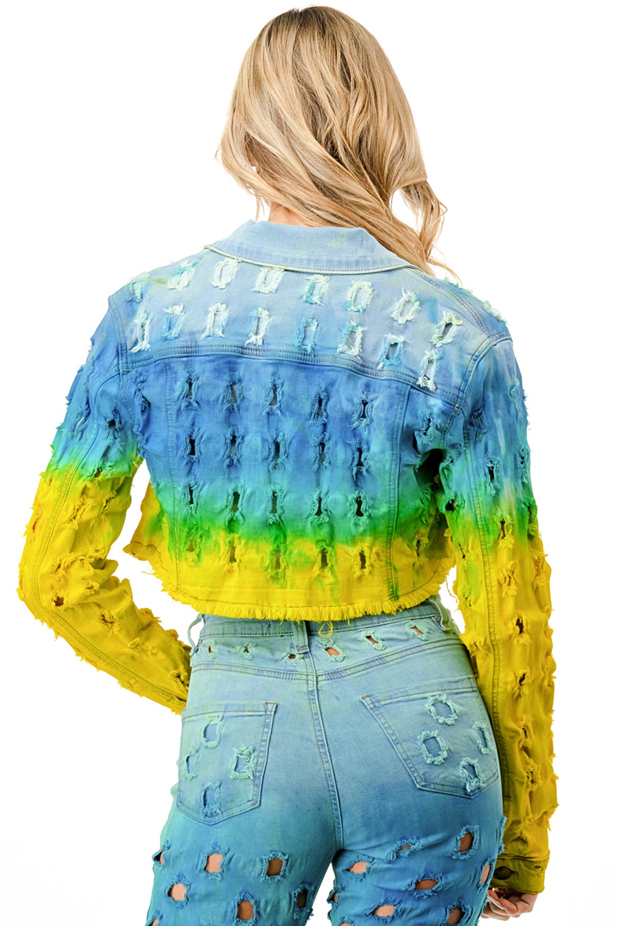 Unique, cropped denim jacket with a neon dip dye wash and unique, ripped holes distressing all around. Front button closure. Slim-fit silhouette with a comfortable stretch. Matching flares sold separately. This style is individually dyed and may have minor variations in color.