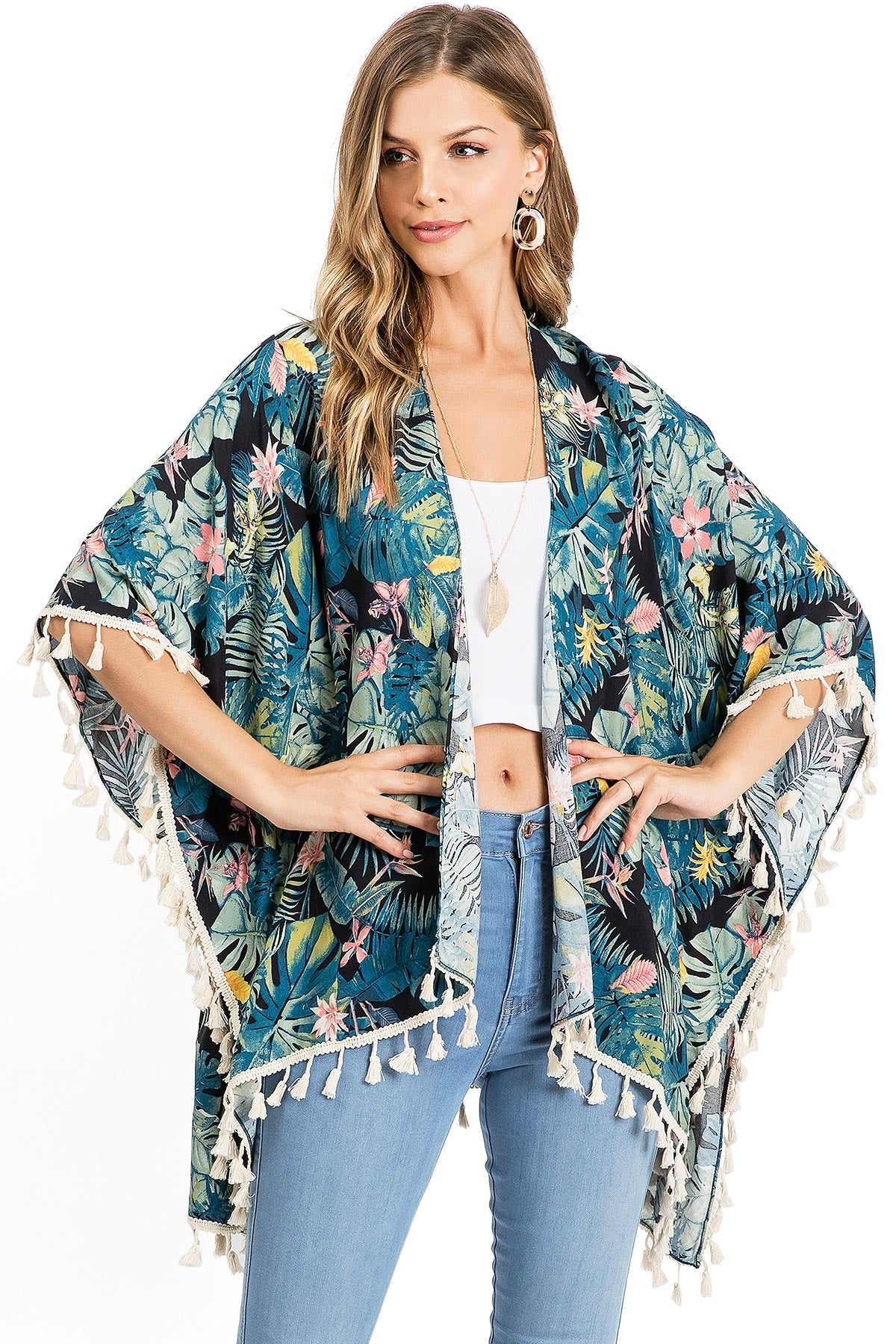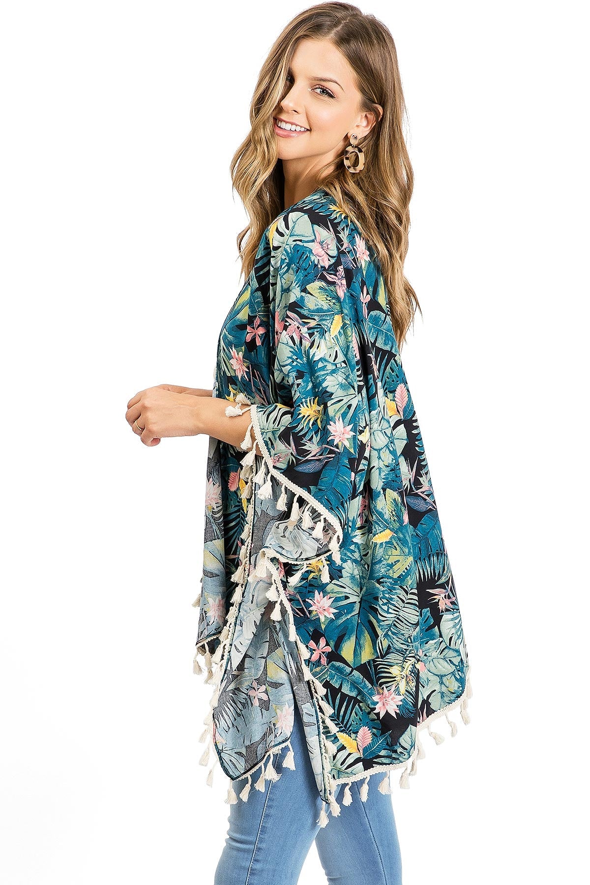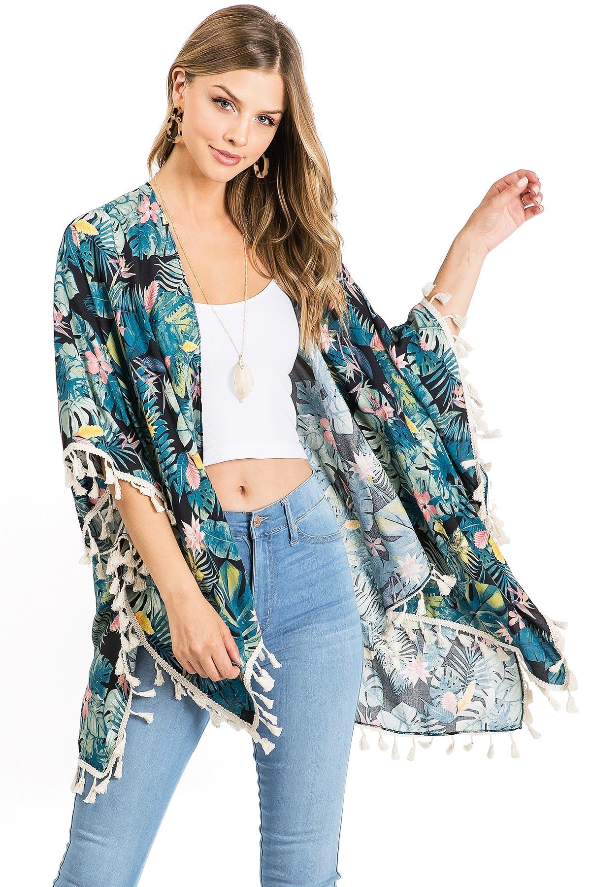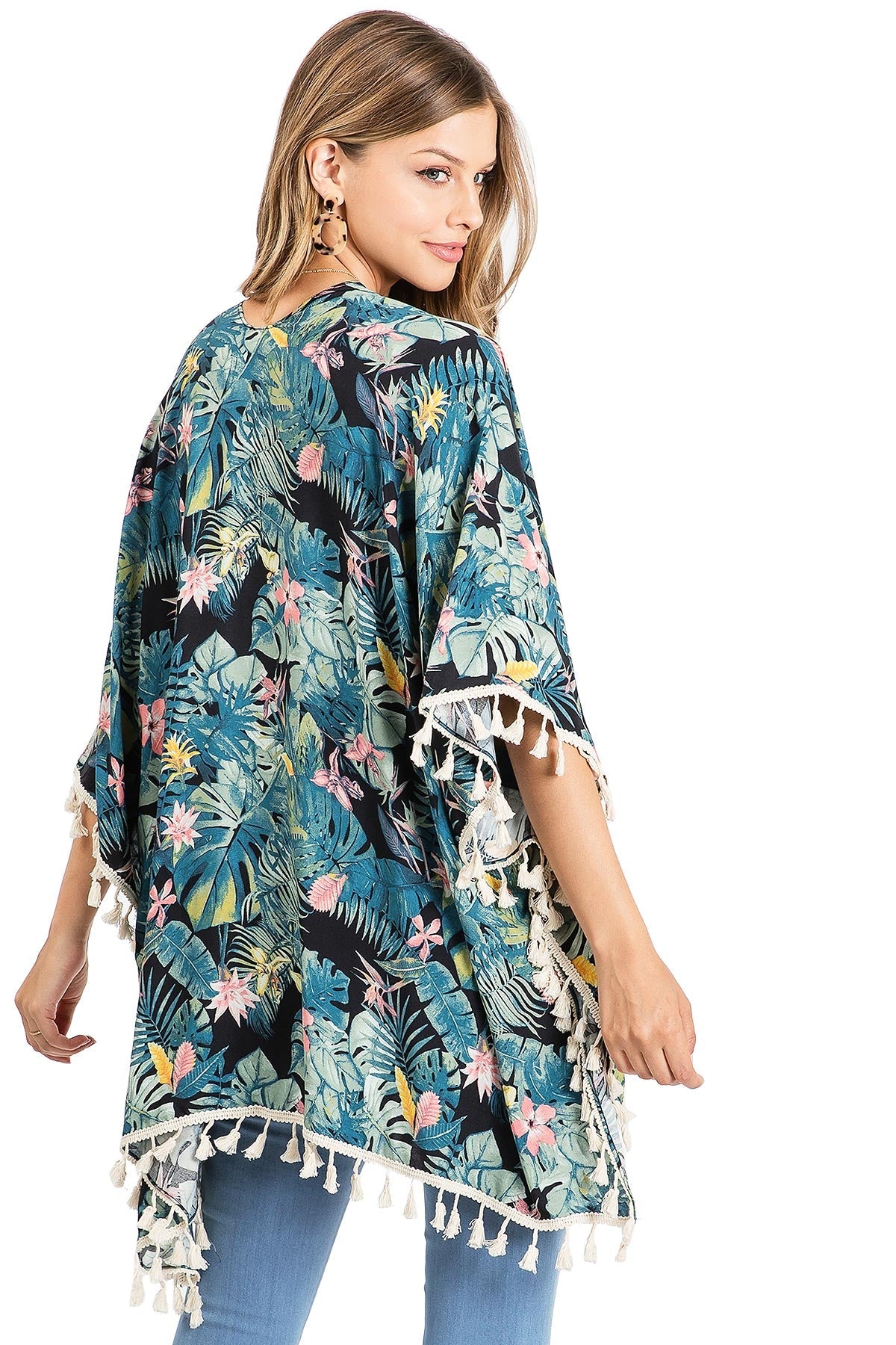 Kimono cardigan with a tropical floral and palm leaf?print and 1/2 length sleeves. Tassel trim along the edges.?Effortless silhouette, perfect for layering over casual outfits or over swimsuits.