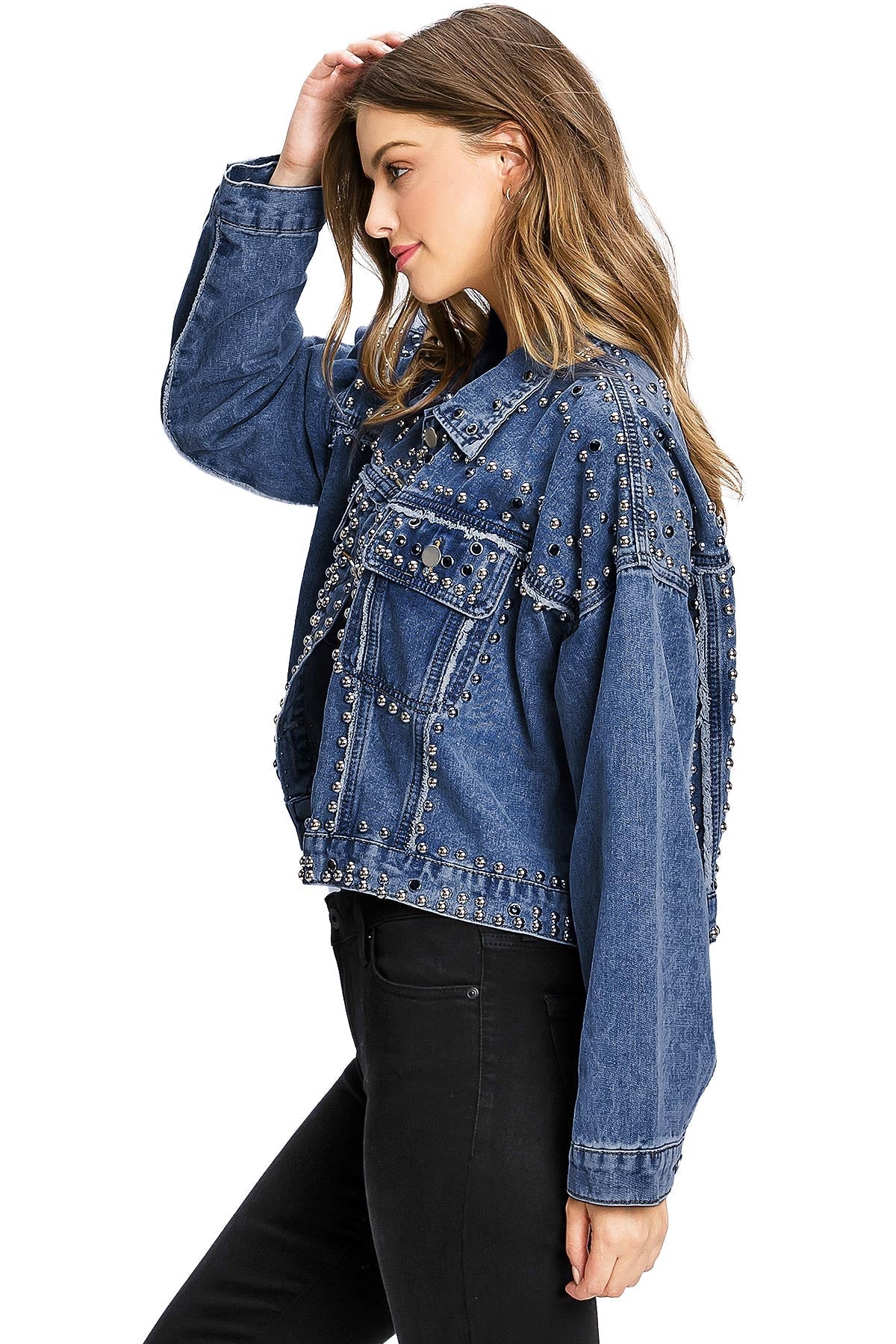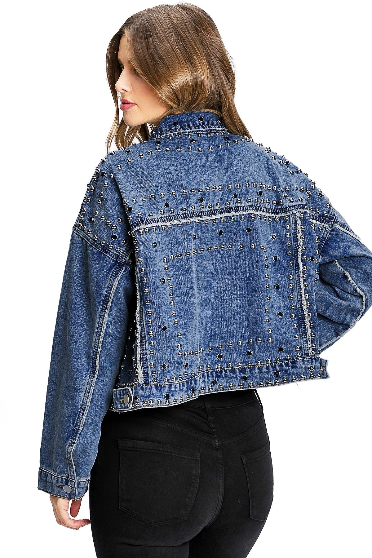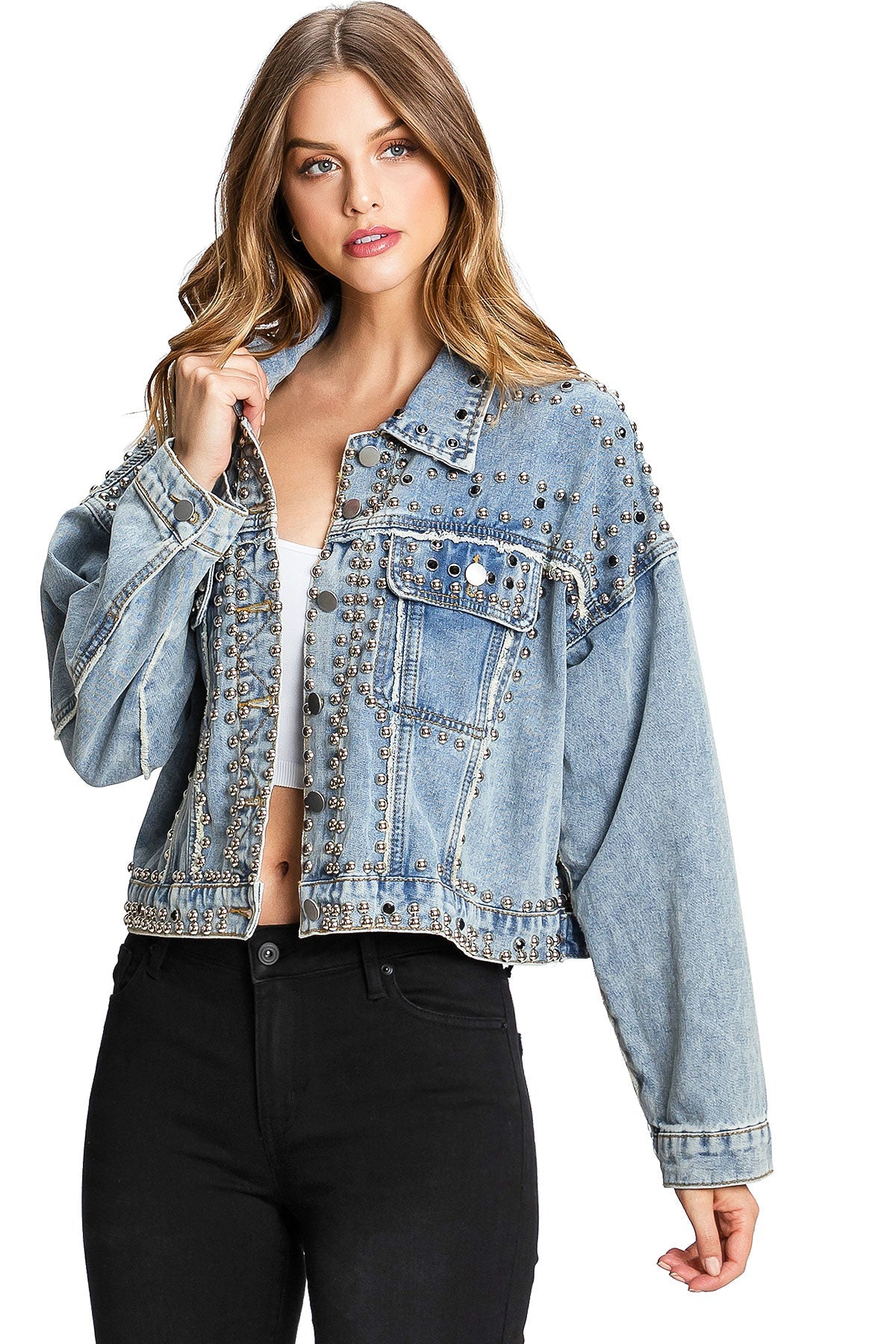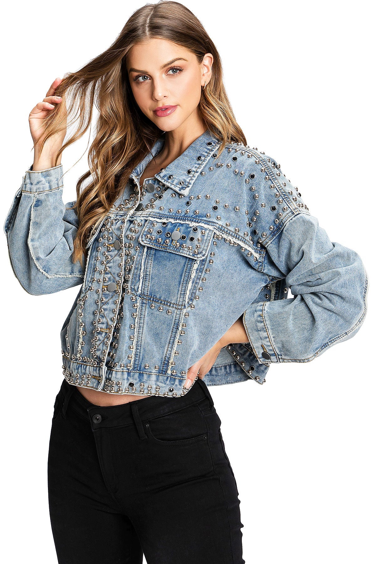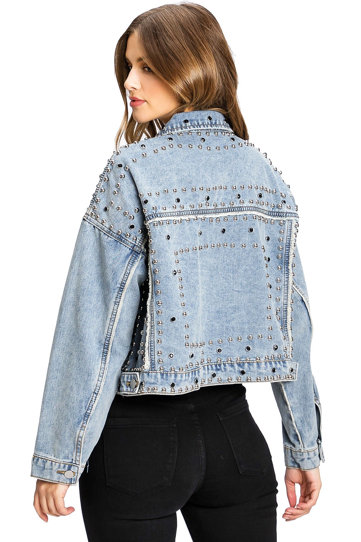 Traditional denim jacket embellished with studs and jewels all-over. Vintage wash with a baggy fit and cropped length. Patch pockets on the front and button up closure. No stretch in denim.