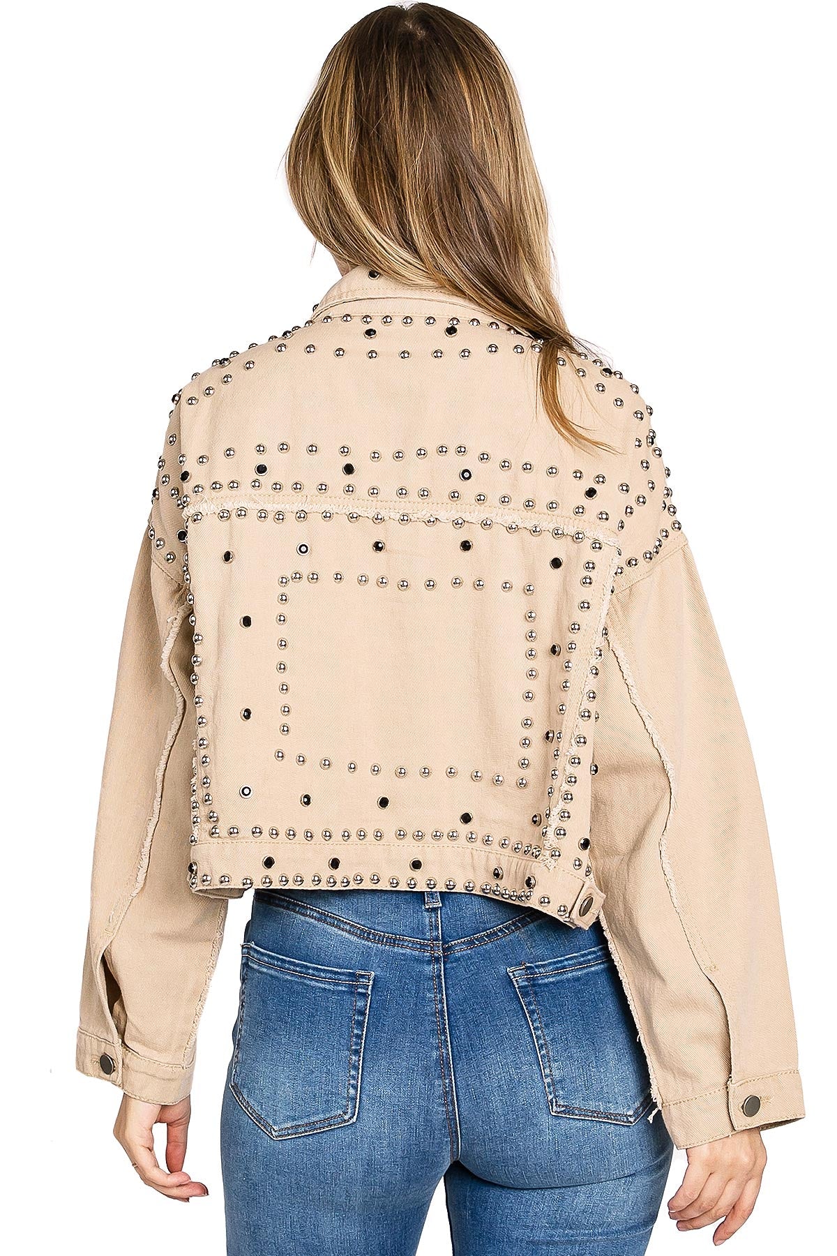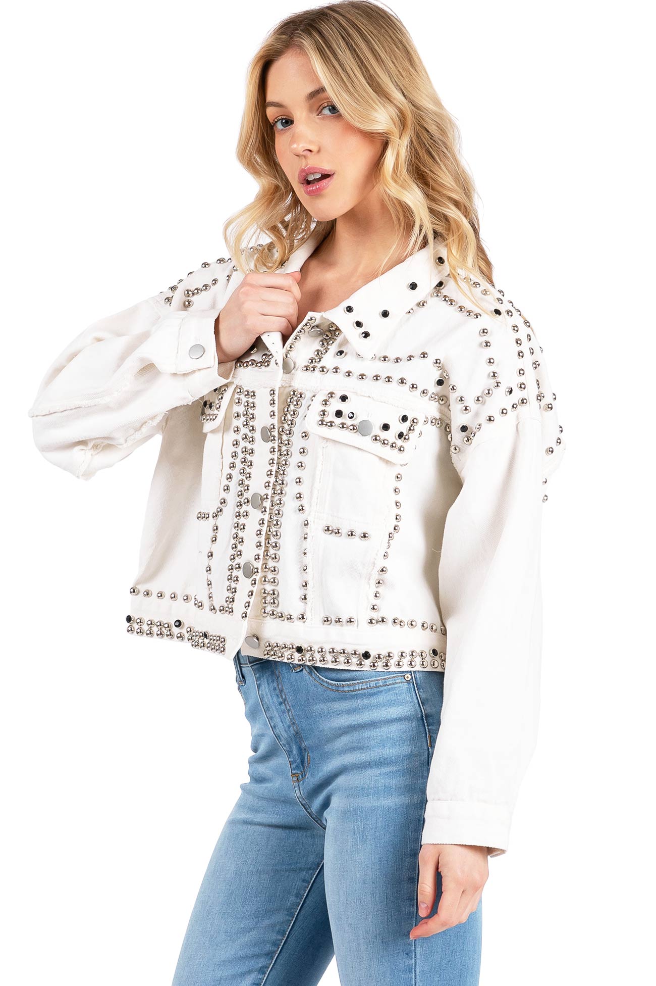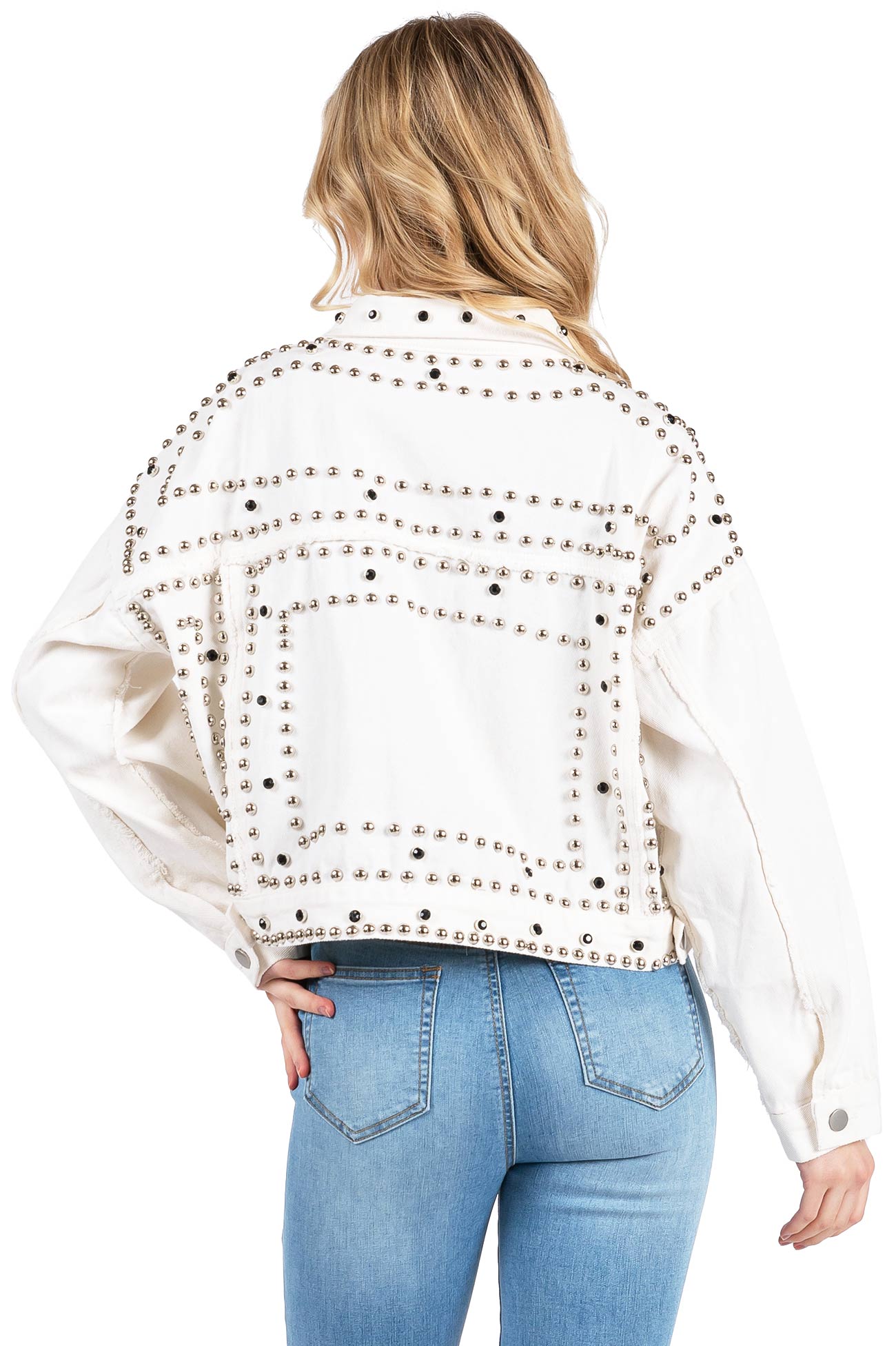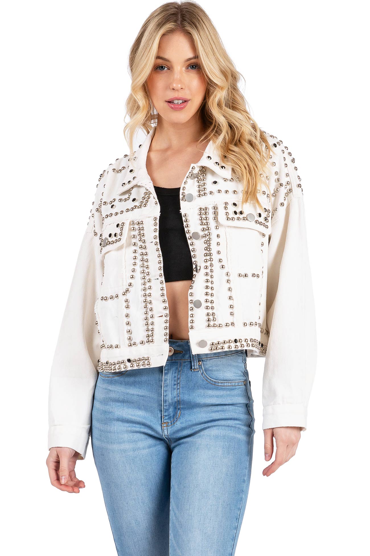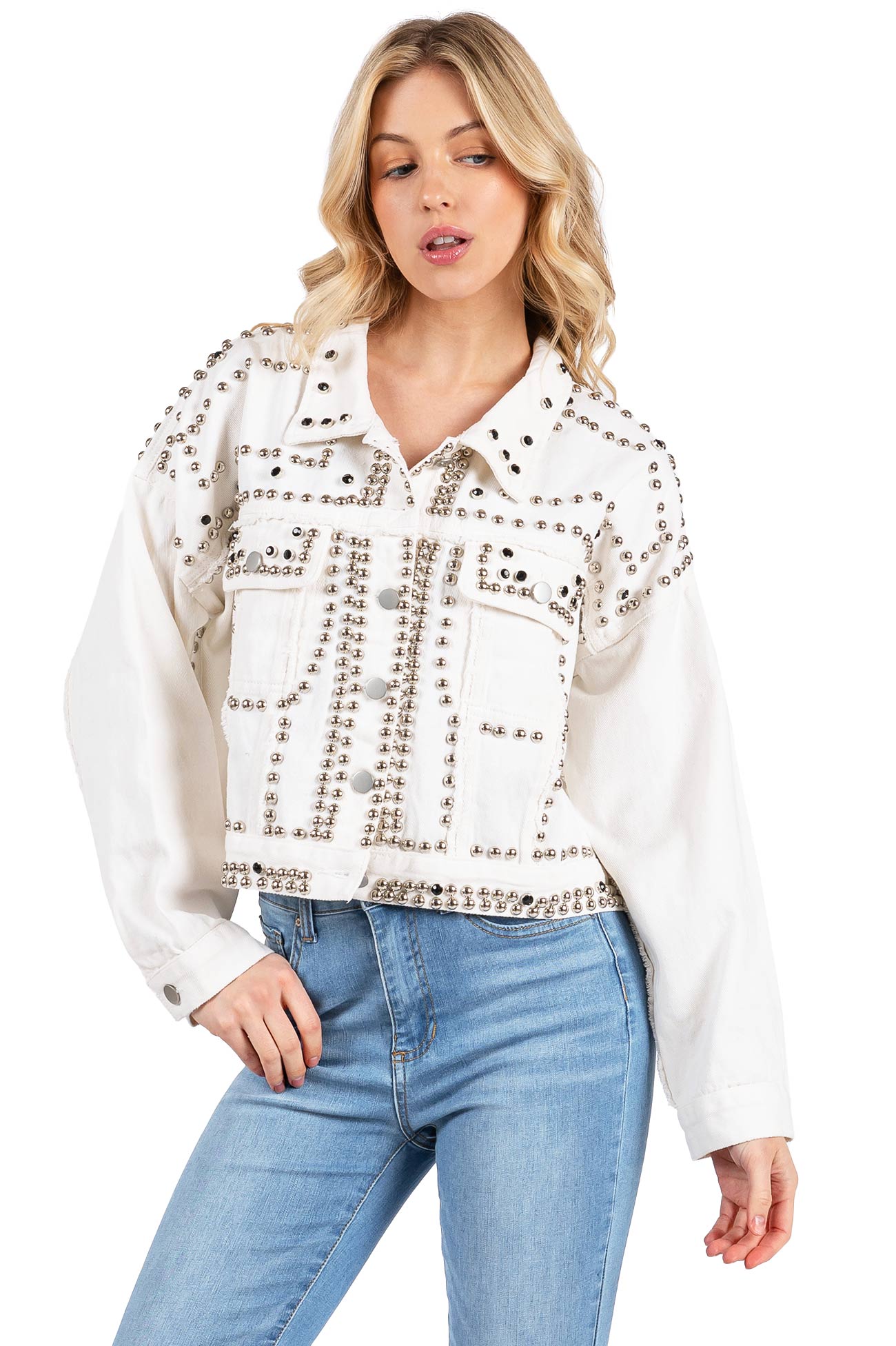 Traditional denim jacket embellished with studs and jewels all-over. Vintage wash with a baggy fit and cropped length. Patch pockets on the front and button up closure. No stretch in denim.