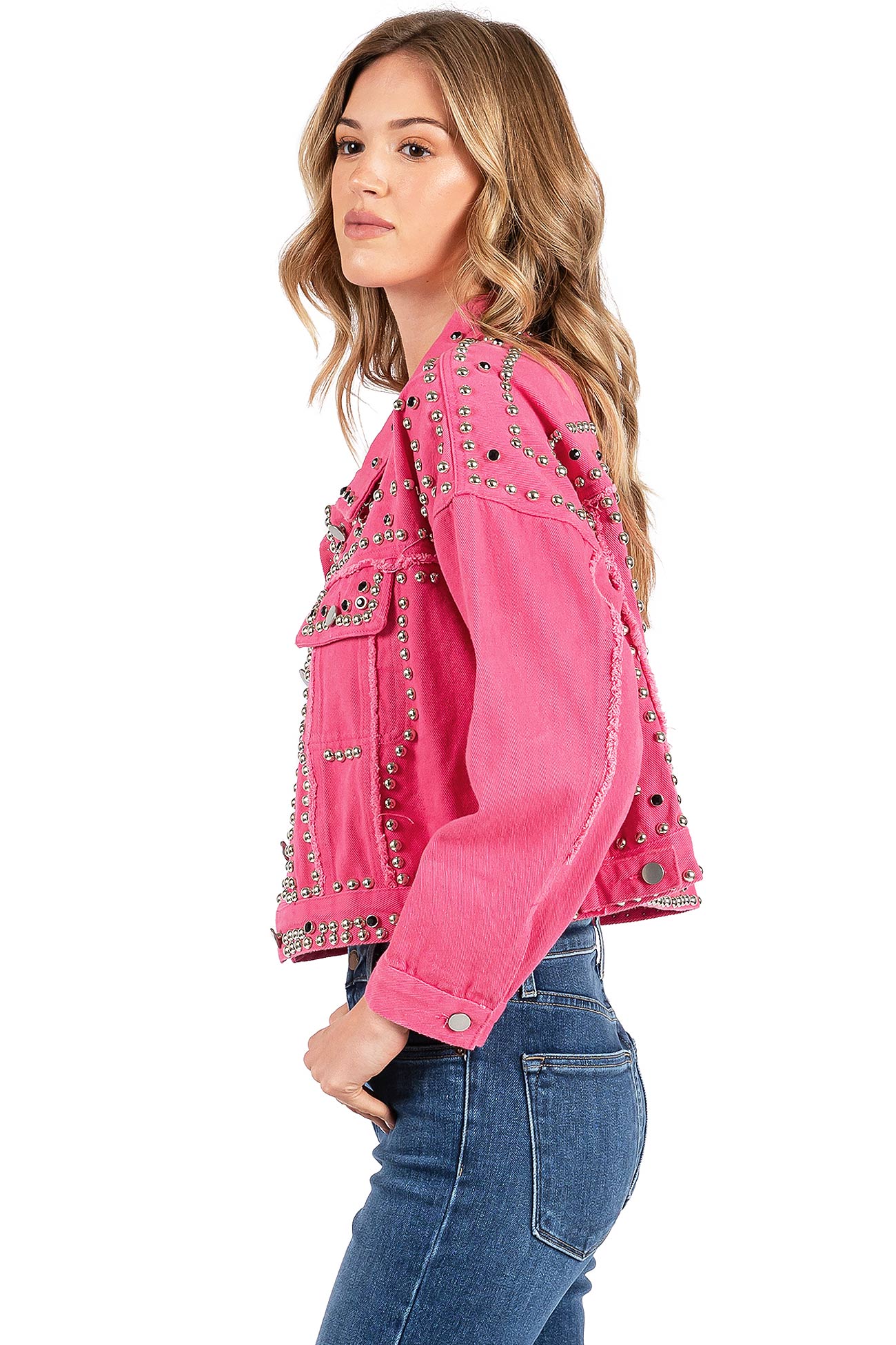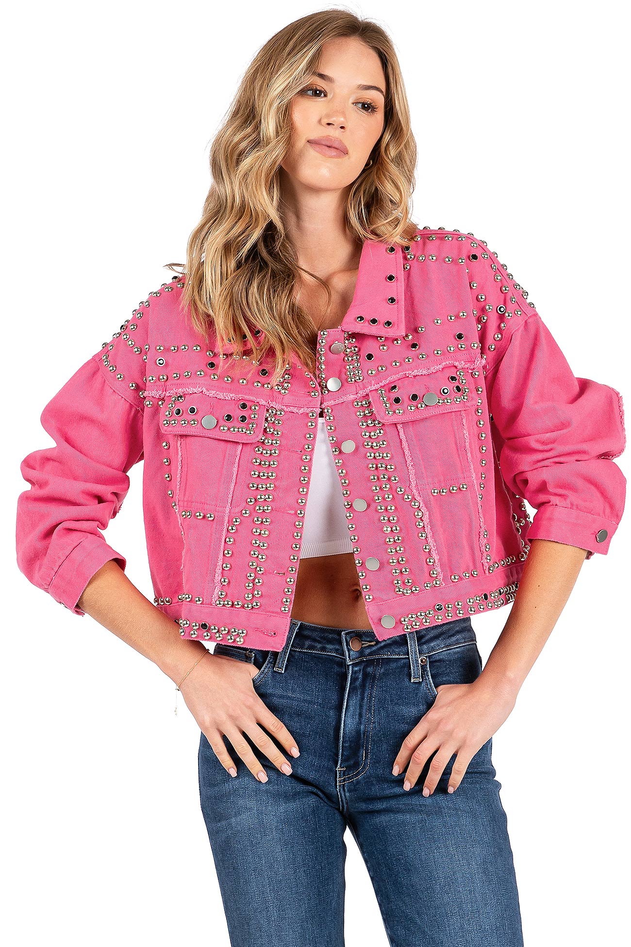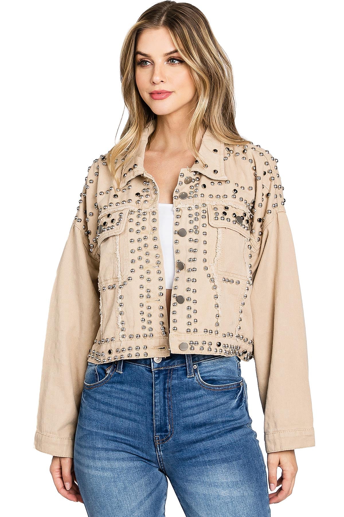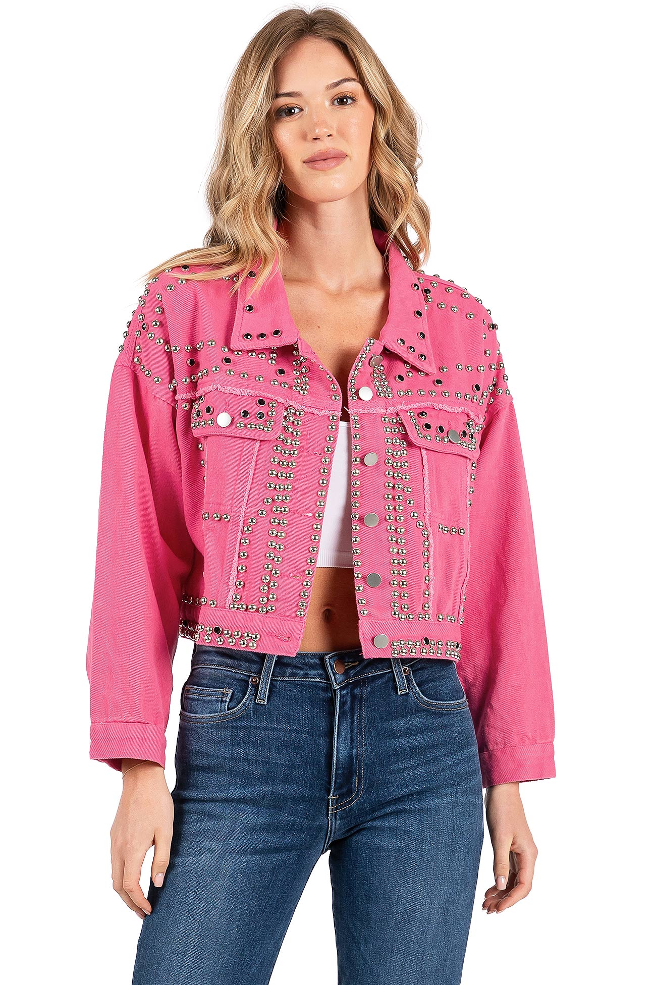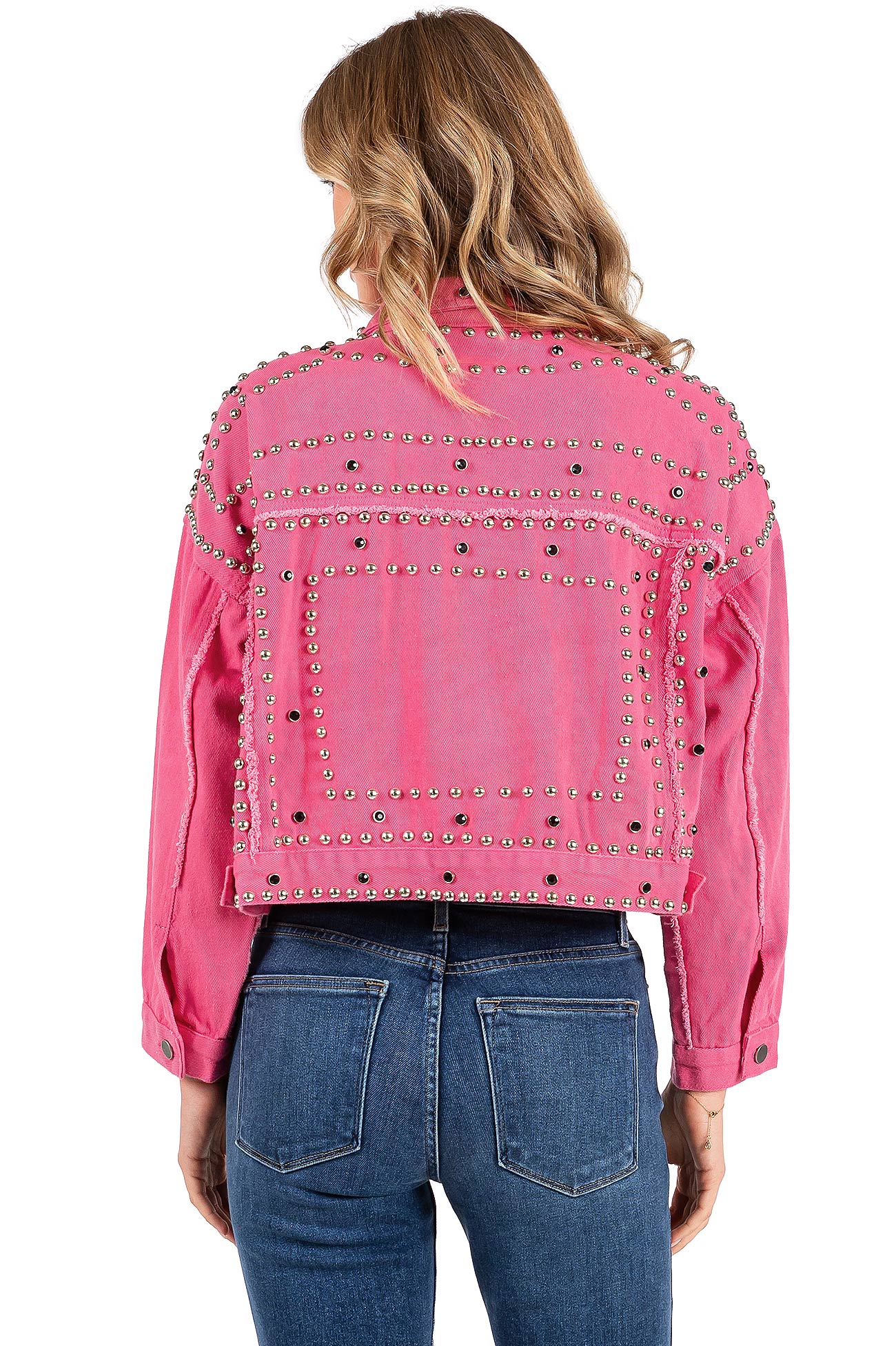 Traditional denim jacket embellished with studs and jewels all-over. Vintage wash with a baggy fit and cropped length. Patch pockets on the front and button up closure. No stretch in denim.