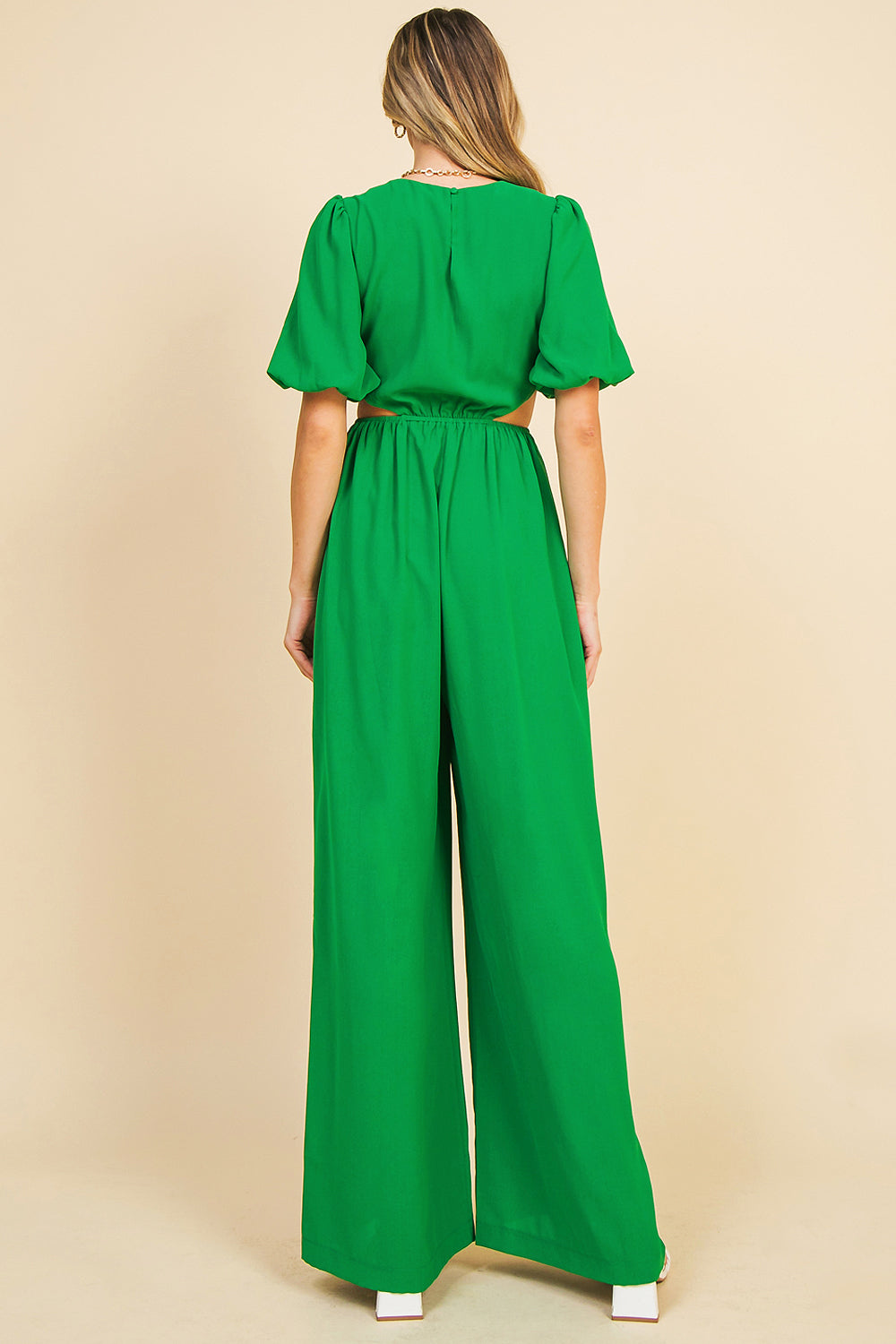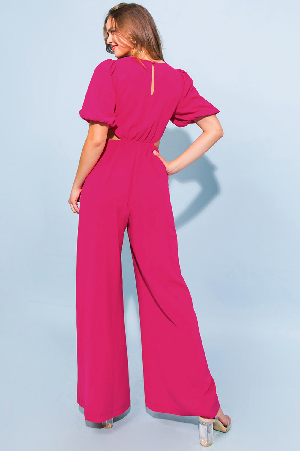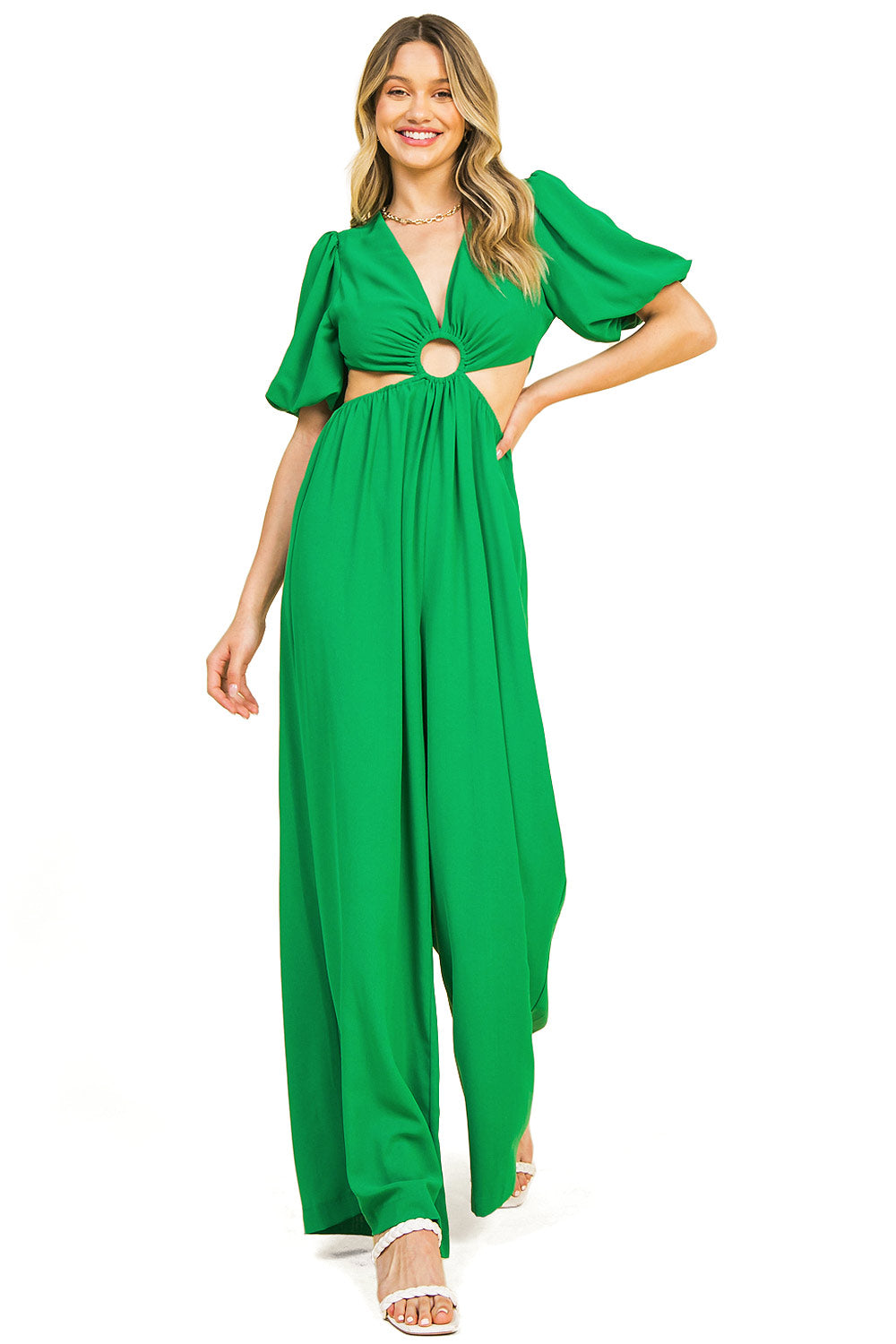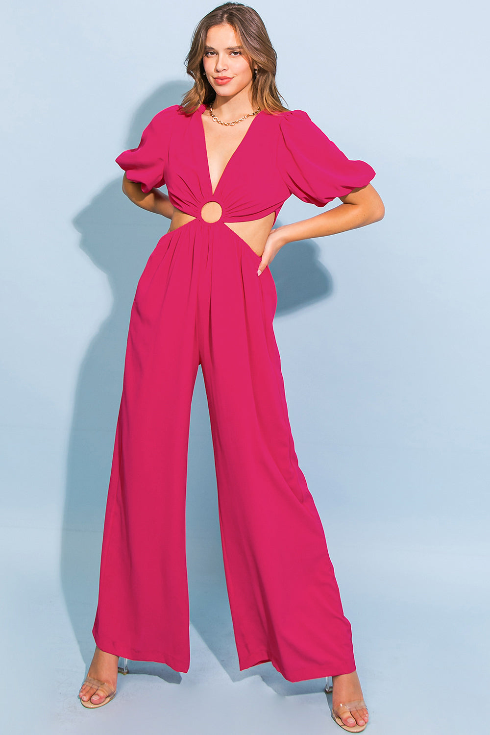 Bold one-piece, jumpsuit with a plunging V-neckline, short puff sleeves and a keyhole back with a button closure. Centered O-ring with cut outs on the sides. Wide leg pants. Light weight, breathable fabric. Top is double lined.