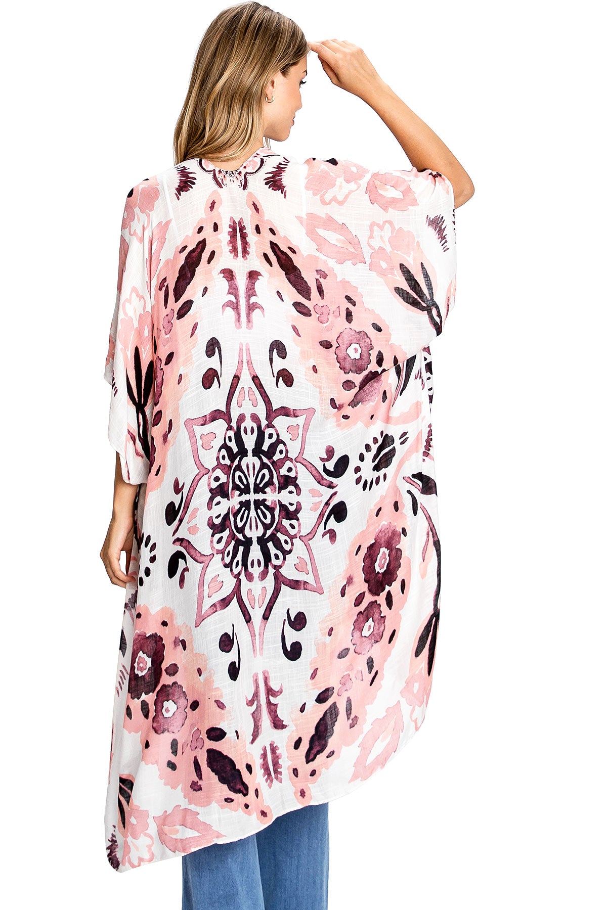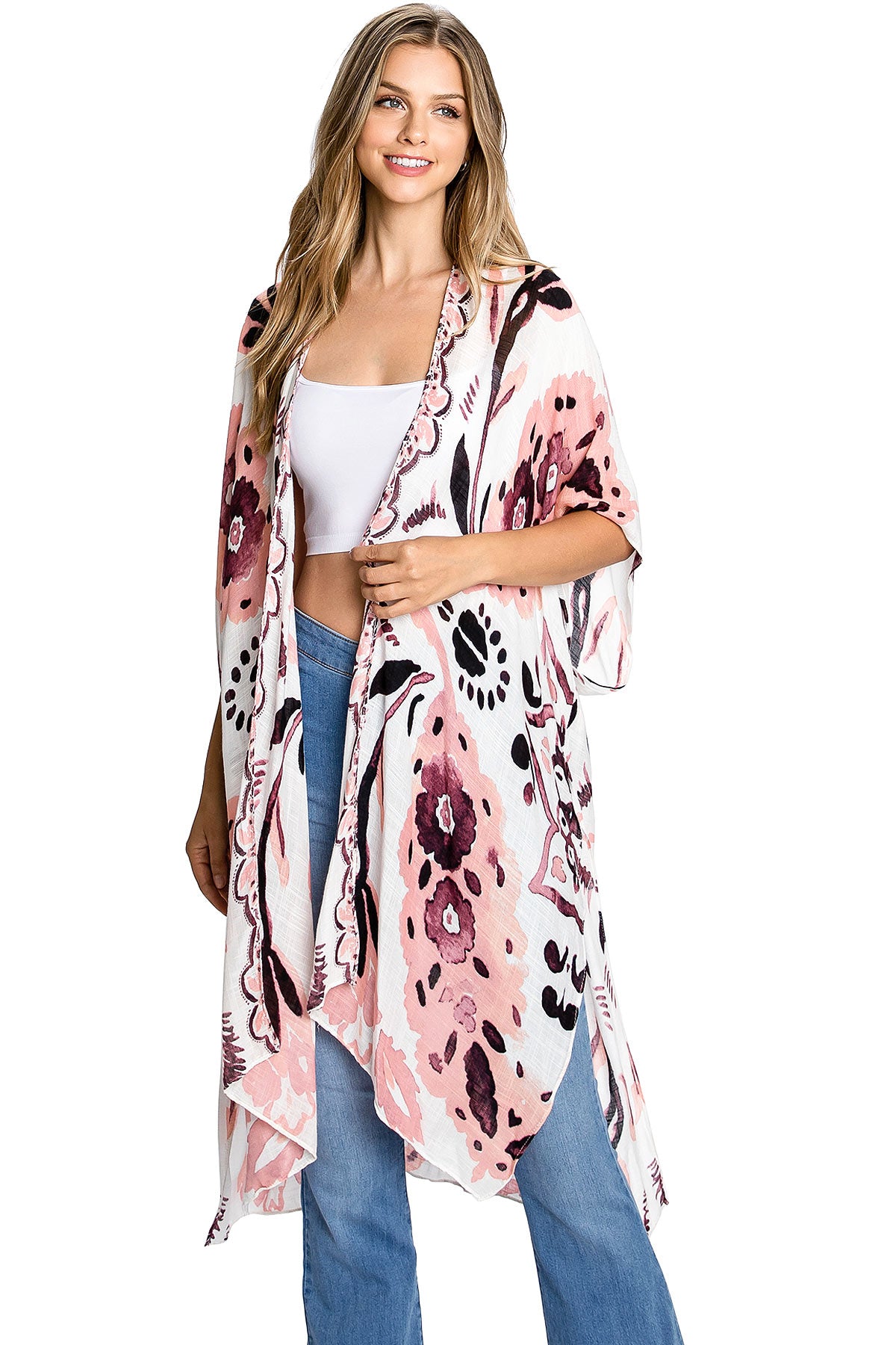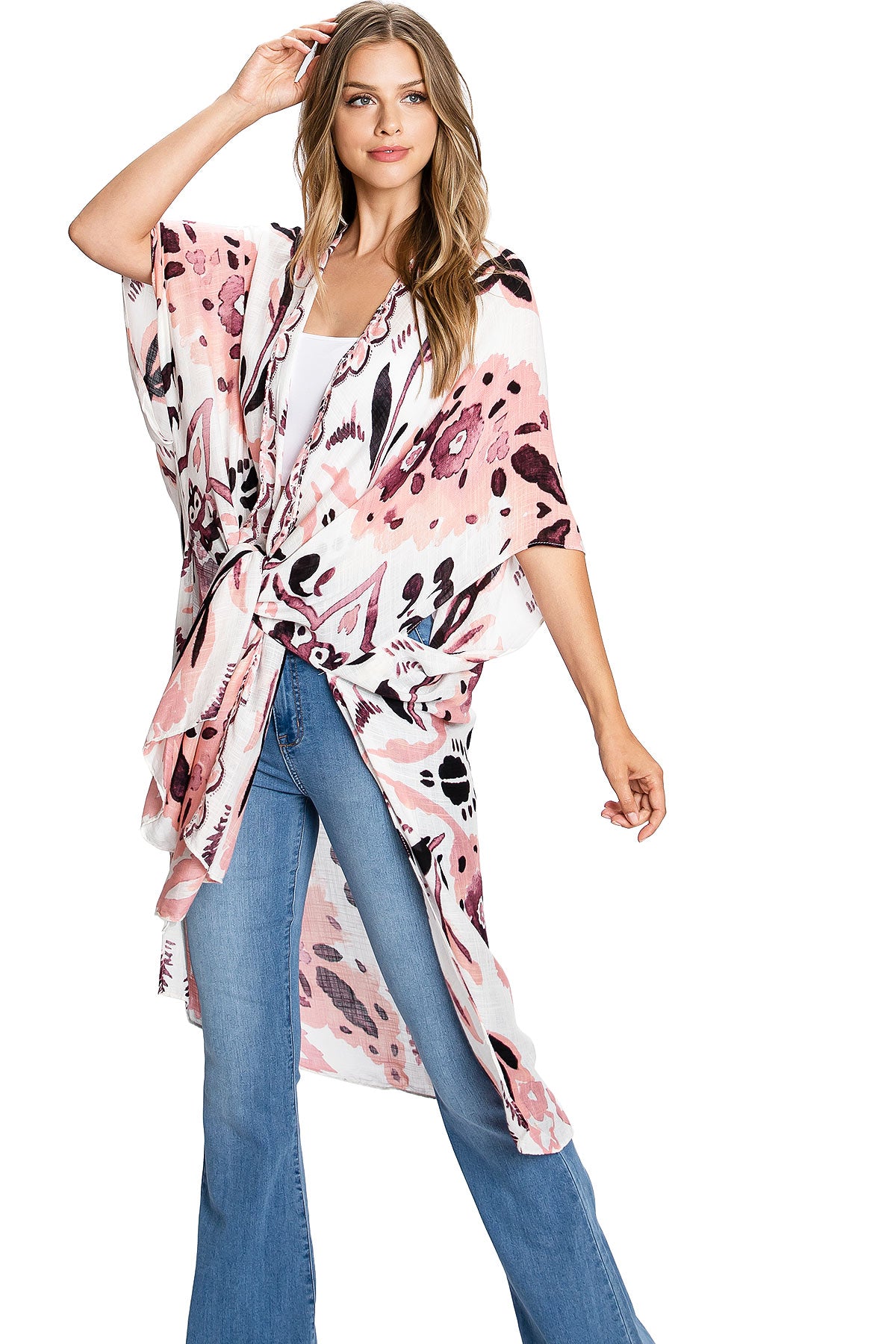 Effortless kimono silhouette with an ultra light scarf feel, 3/4 sleeves, an open-front and a watercolor floral print. Perfect for light layering over casual outfits!