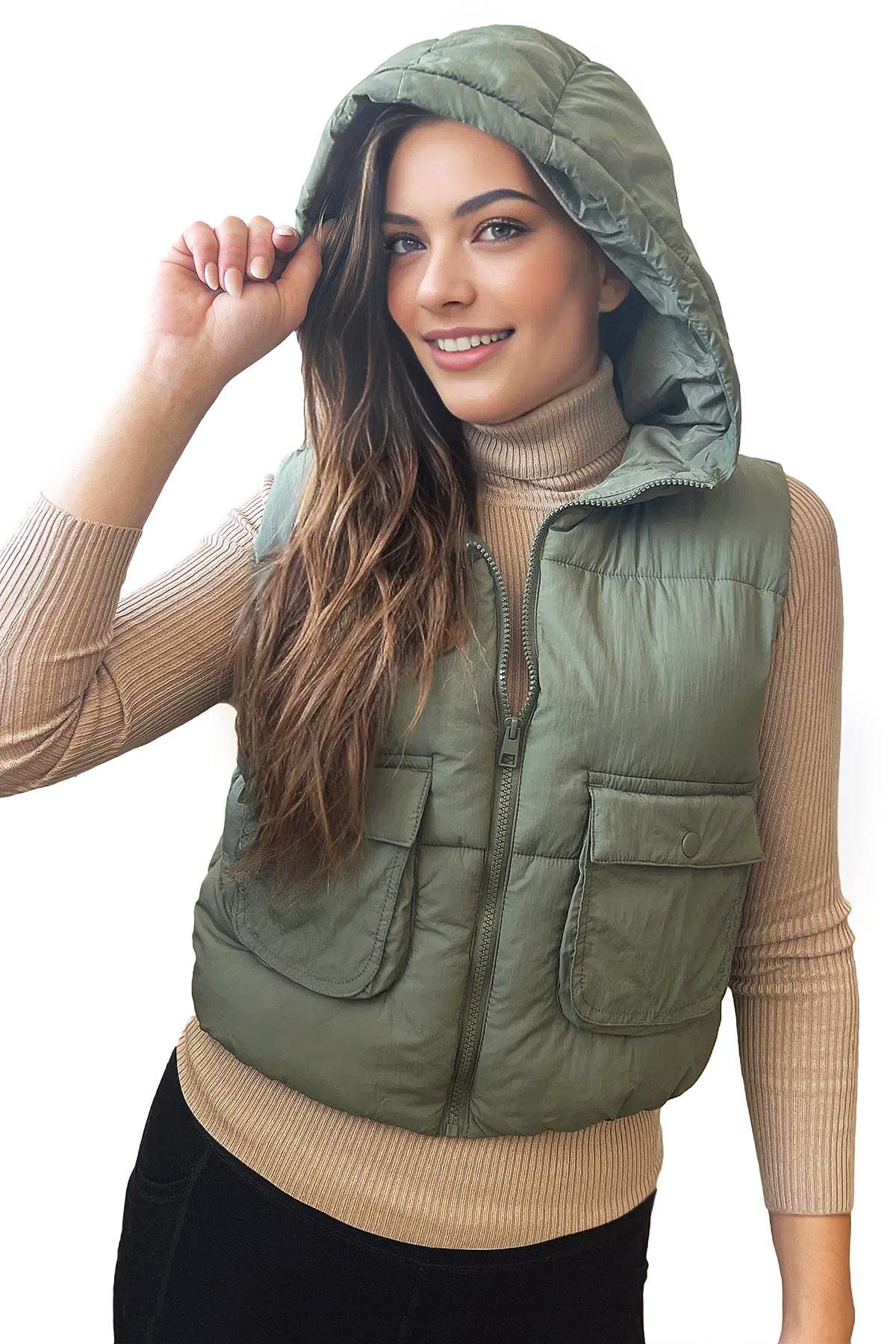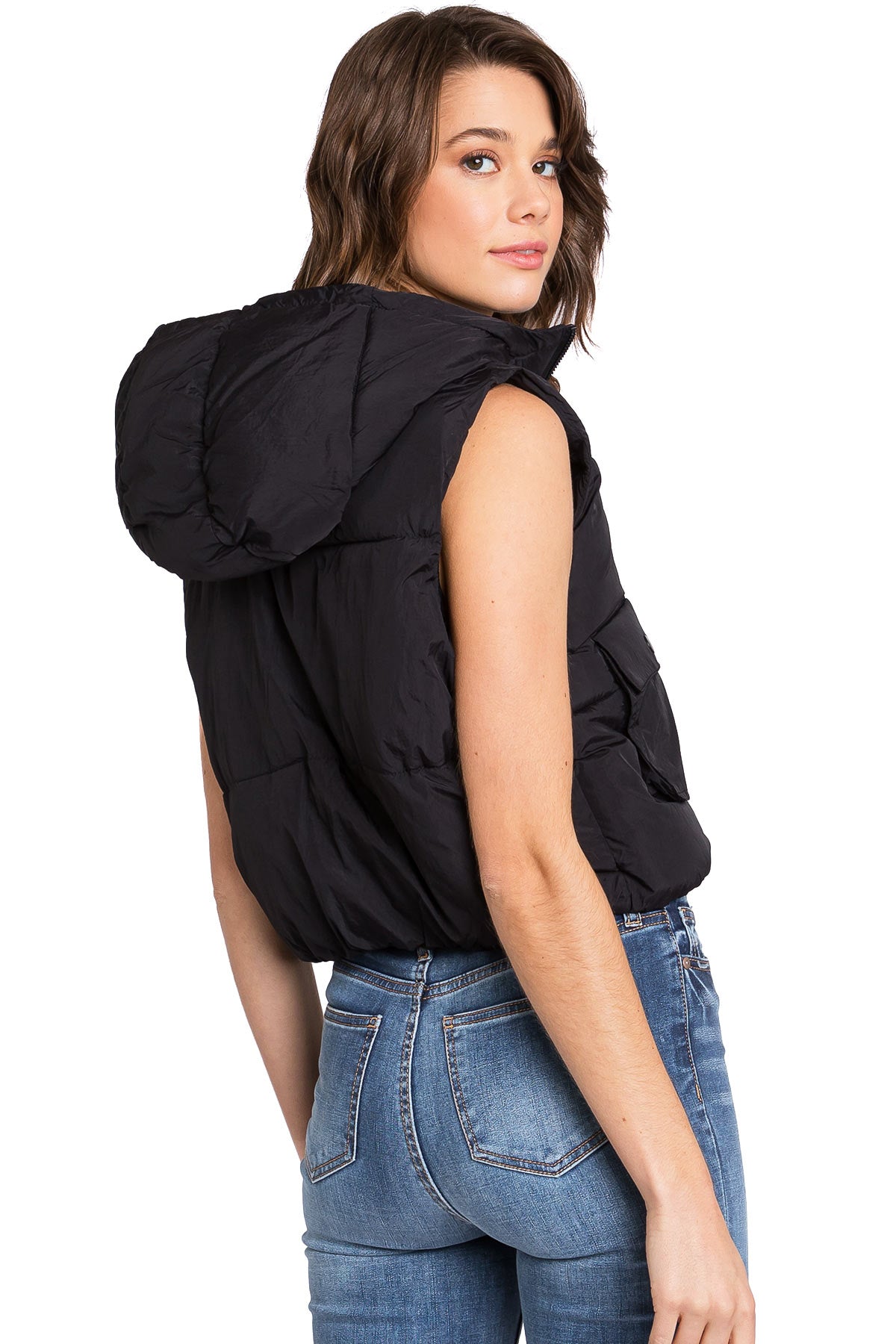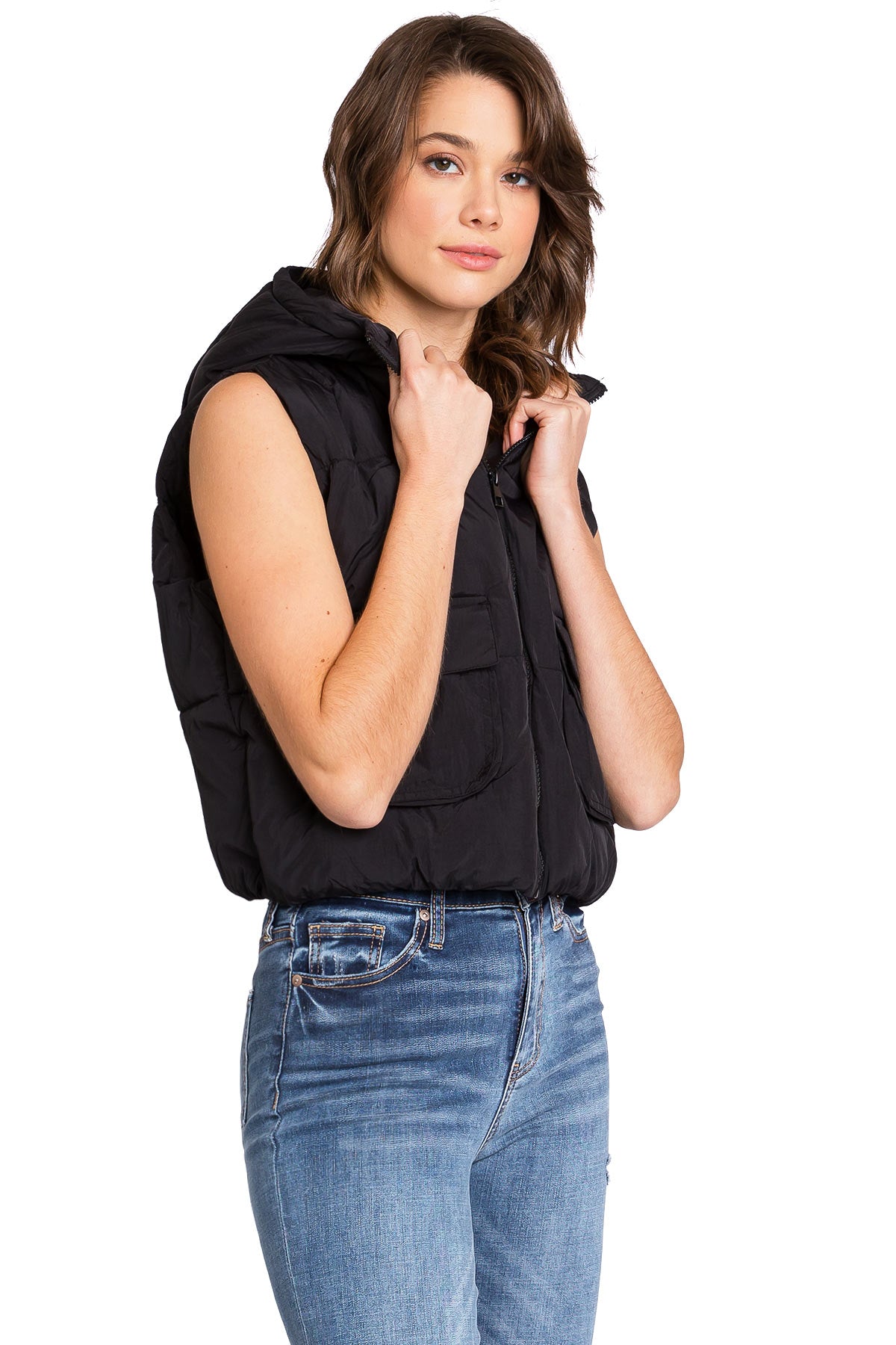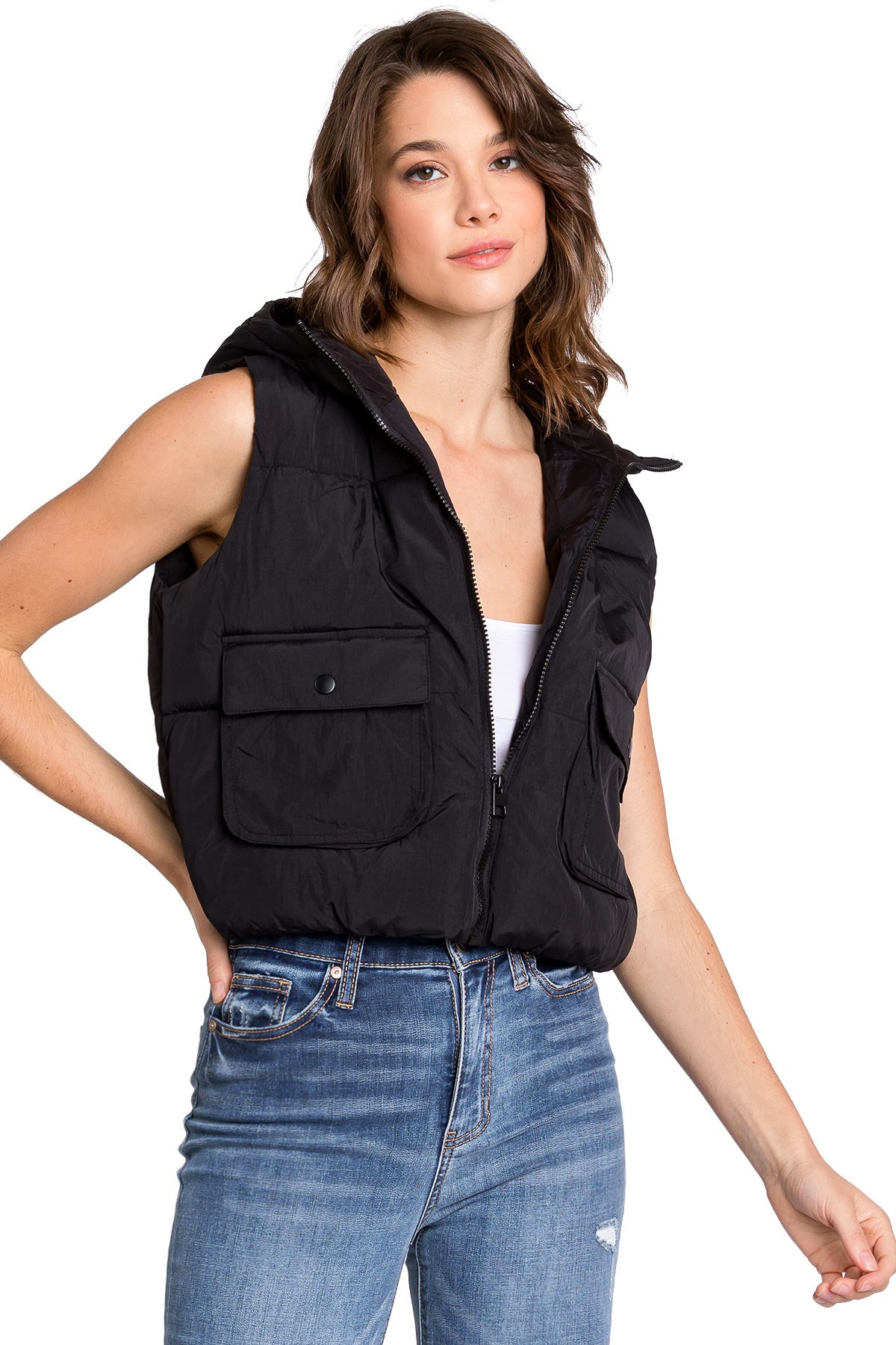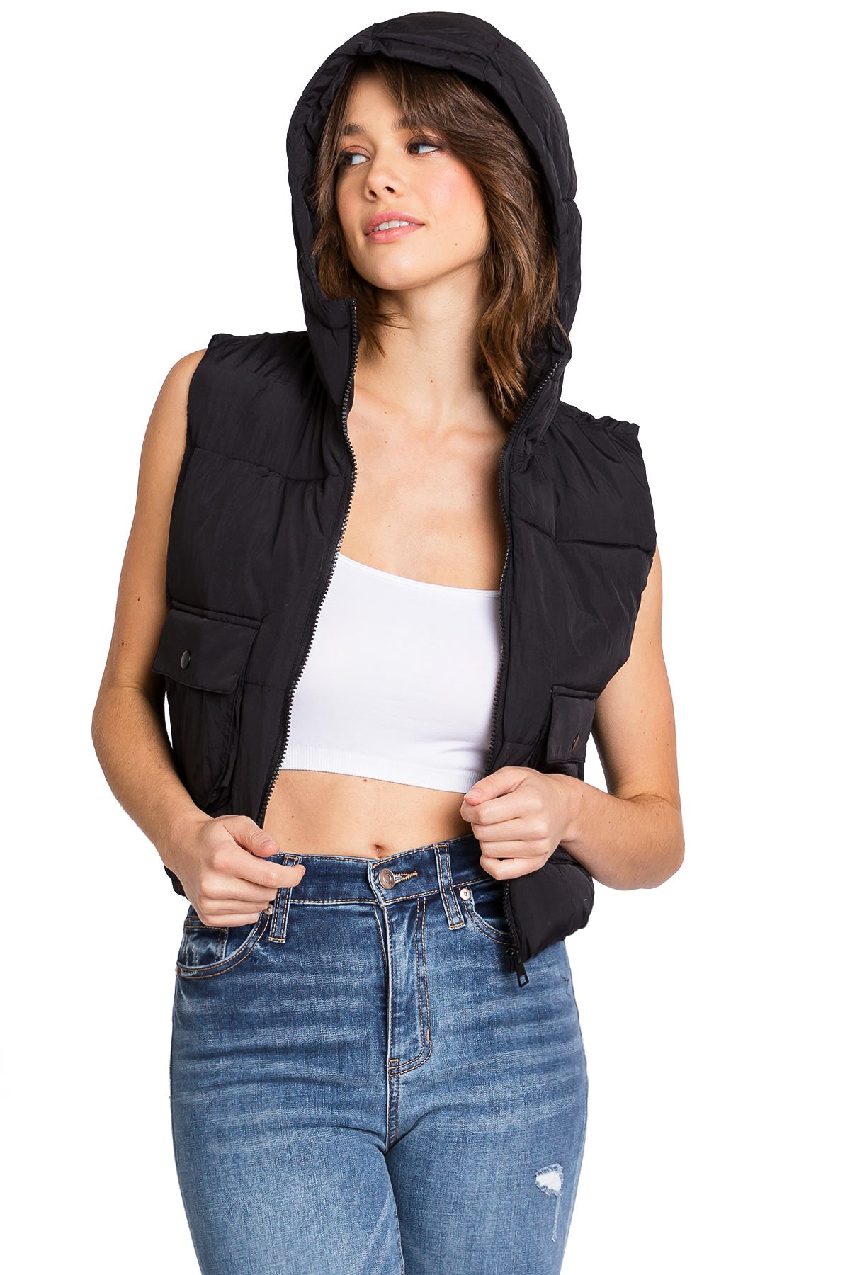 Hooded puffer vest with an ultra light-weight, synthetic down fill for ultimate warmth. Cropped fit with snap-button pockets down by the waist and a traditional zipper closure down the front.