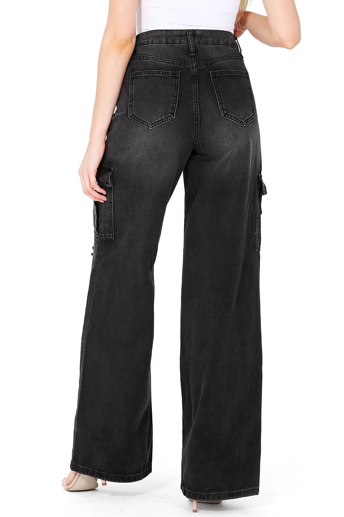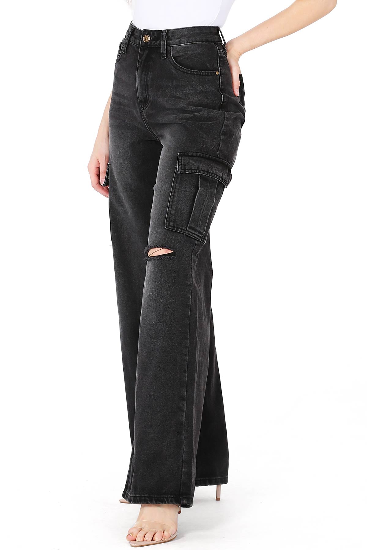 Wide-leg, jeans with a high-rise fit, cargo pockets on sides and light distressing. Traditional 5-pocket construction with a zip fly and button closure. Non-stretch denim.