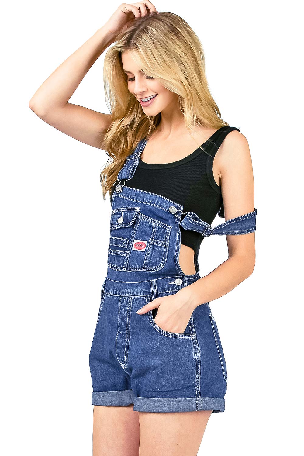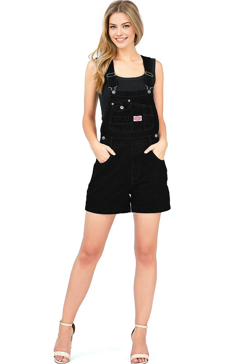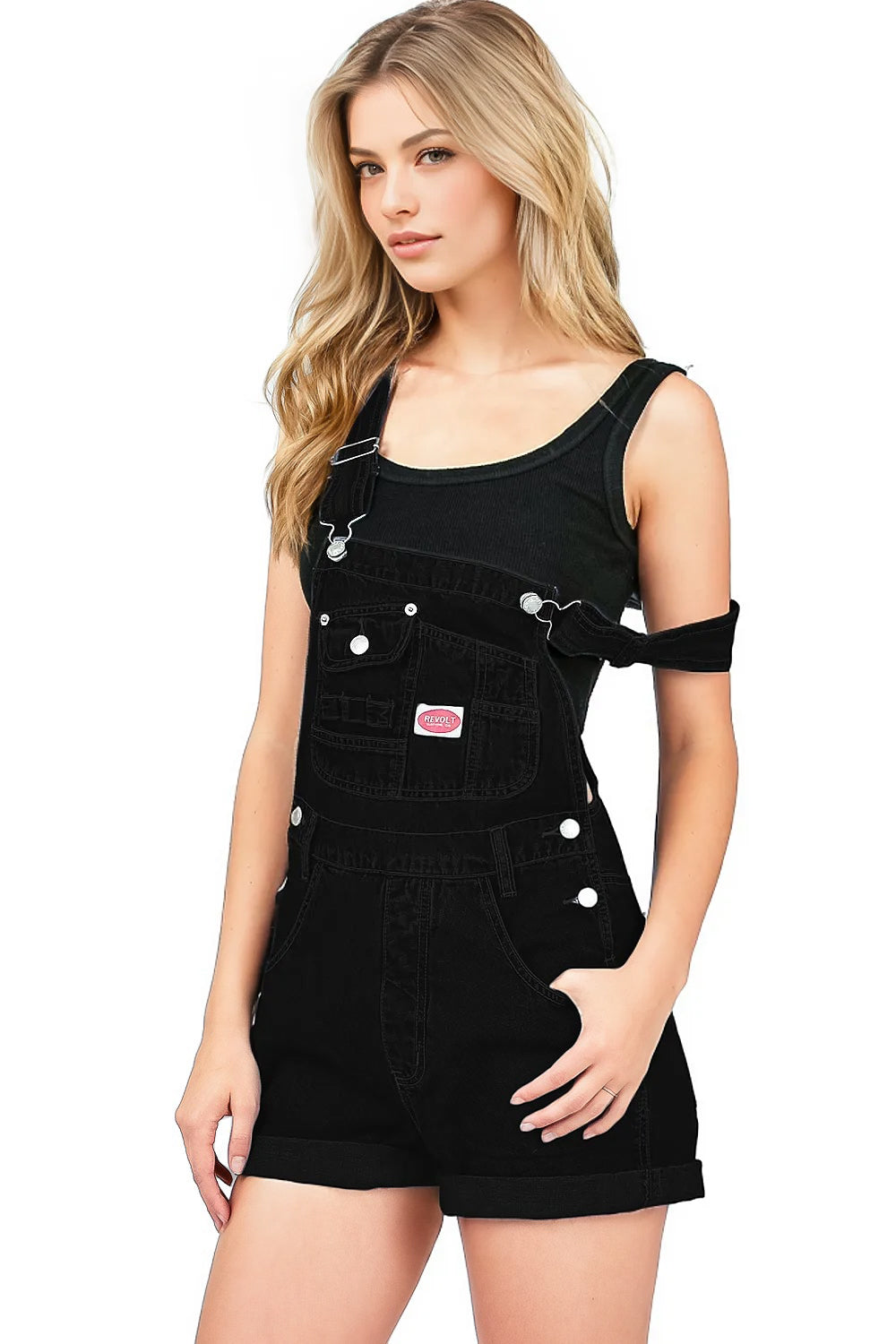 Twill short overalls with a multi pocket bib and logo patch detail. Traditional straps with clasp closures. Pockets on the front and back with button closures at the sides. Looks great paired with crop tops.