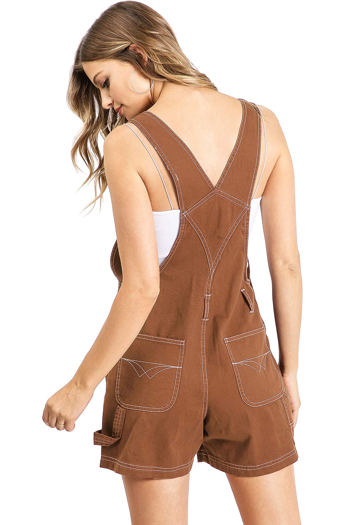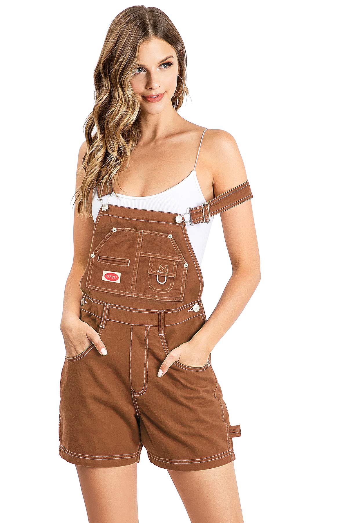 Twill canvas short overalls with a multi pocket bib and logo patch detail. Traditional straps with clasp closures. Pockets on the sides and back with button closures at the sides. Looks great paired with crop tops.