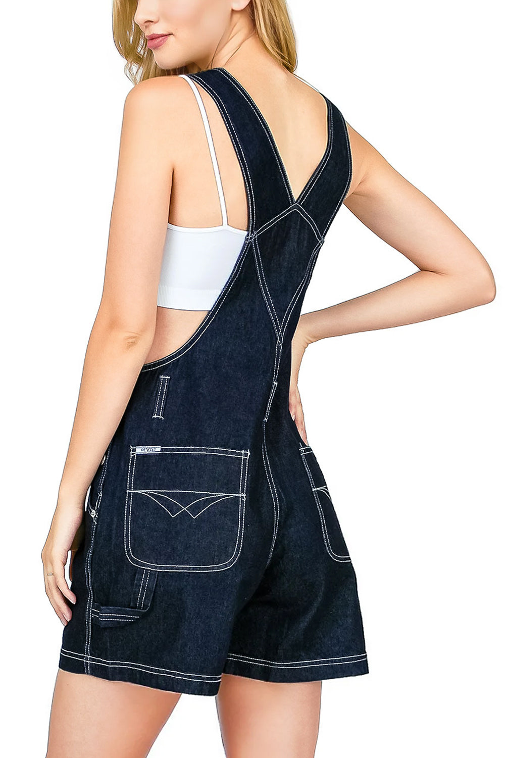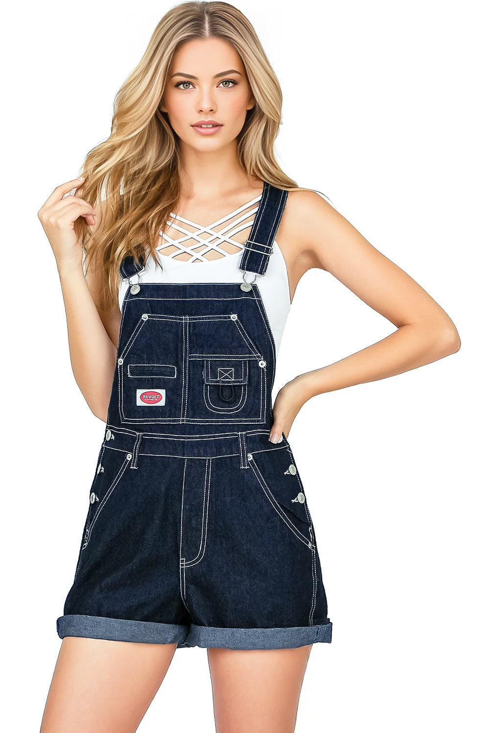 Denim short overalls with a multi pocket bib and logo patch detail. Traditional straps with clasp closures. Pockets on the sidesand back with button closures at the sides. Looks great paired with crop tops.