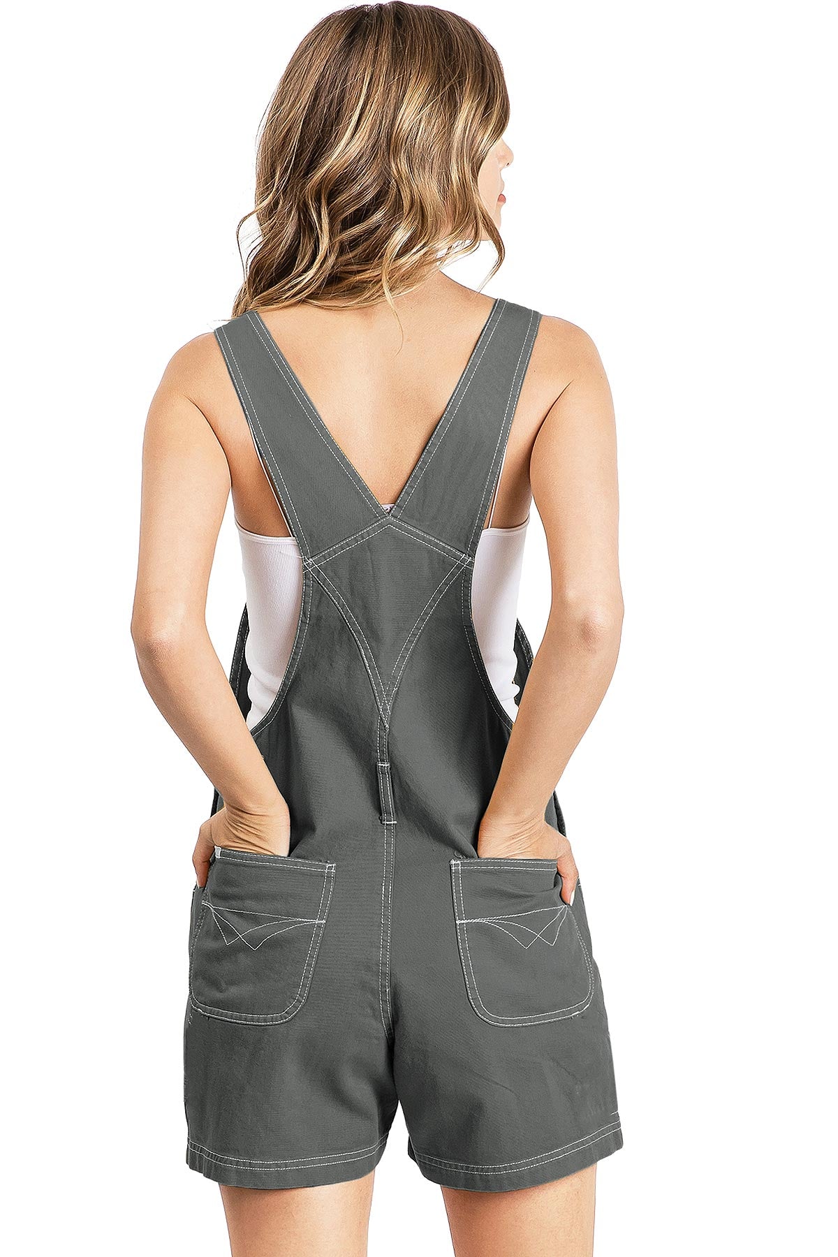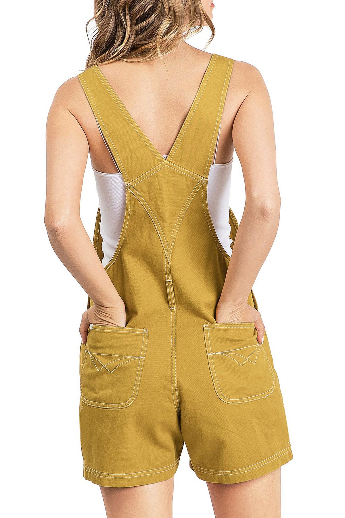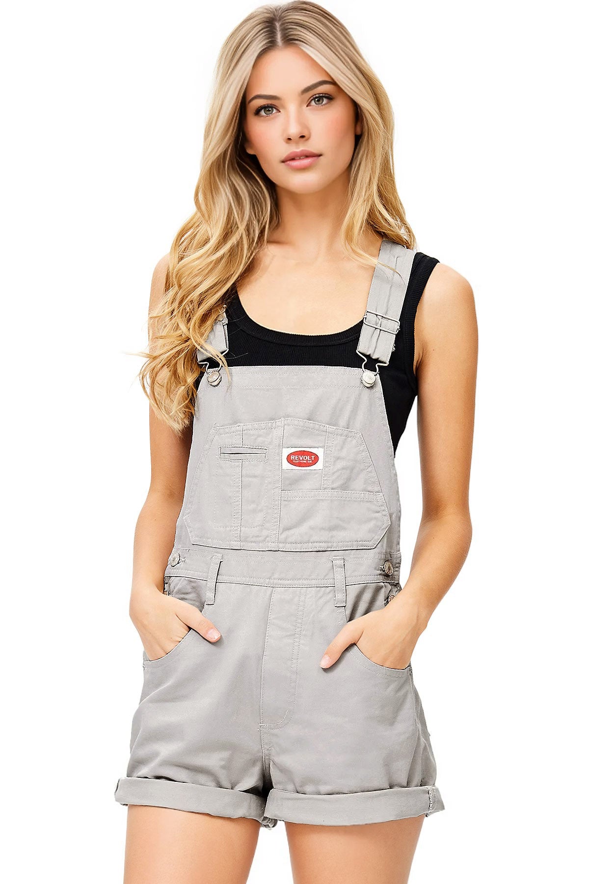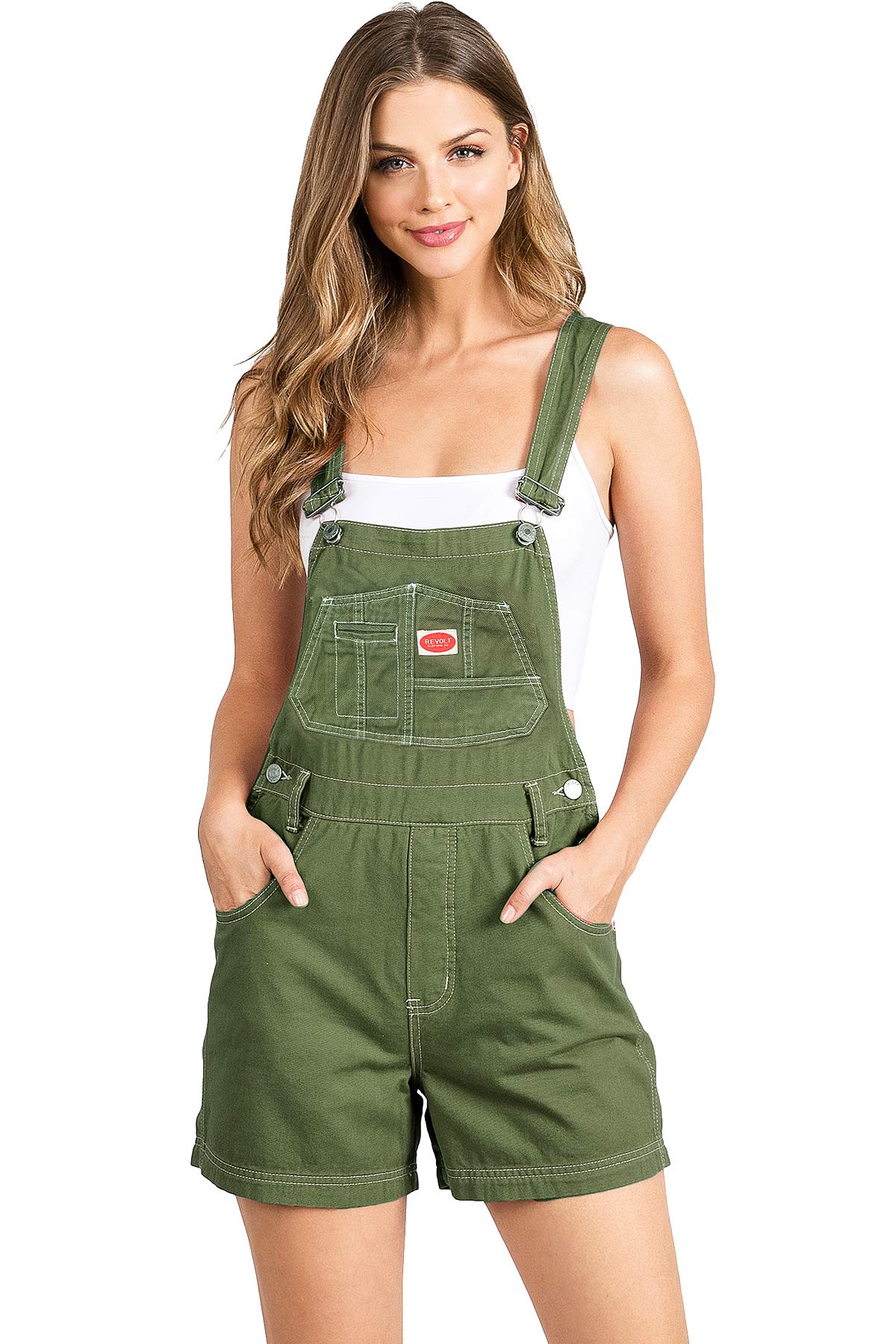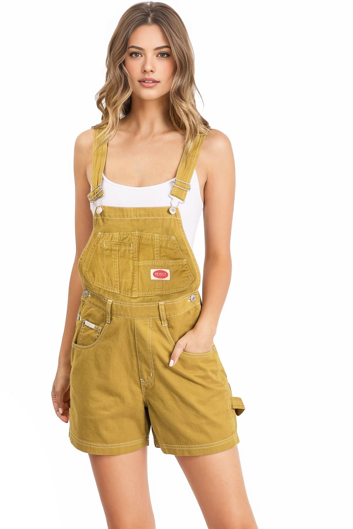 Twill canvas short overalls with a multi pocket bib with logo patch. Traditional straps with clasp closures. Pockets on the sides and back with button closures at the sides. Looks great paired with crop tops.