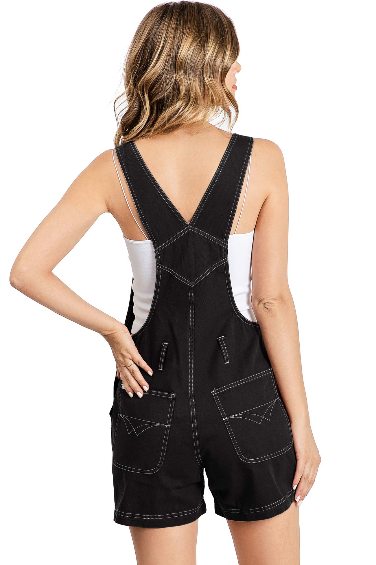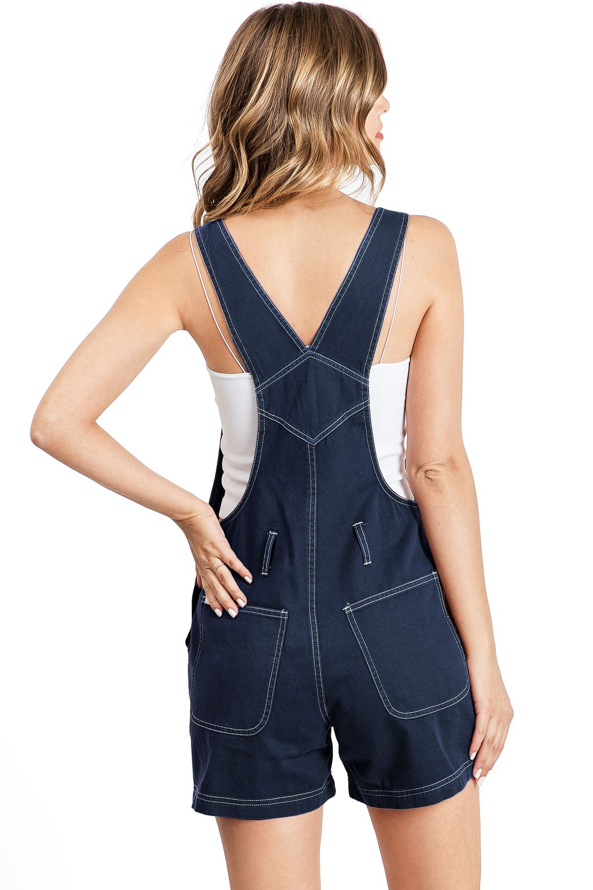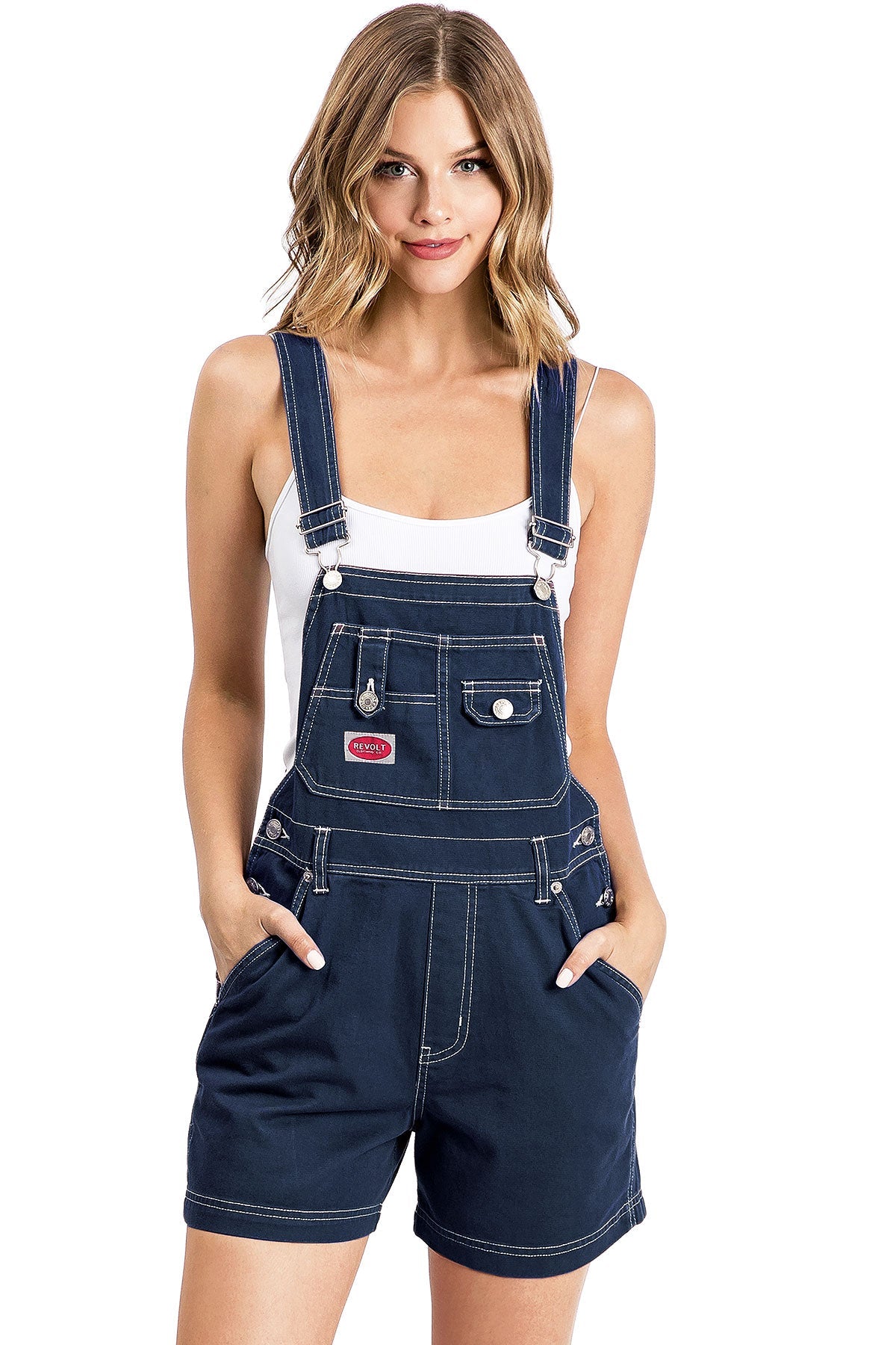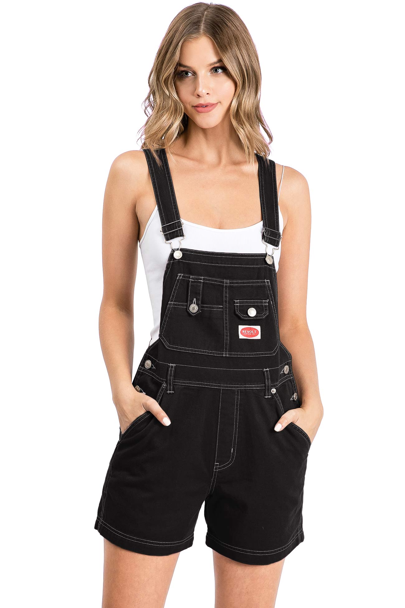 Twill canvas short overalls with a multi pocket bib and logo patch detail. Traditional straps with clasp closures. Pockets on the sides and back with button closures at the sides. Looks great paired with crop tops. No stretch.