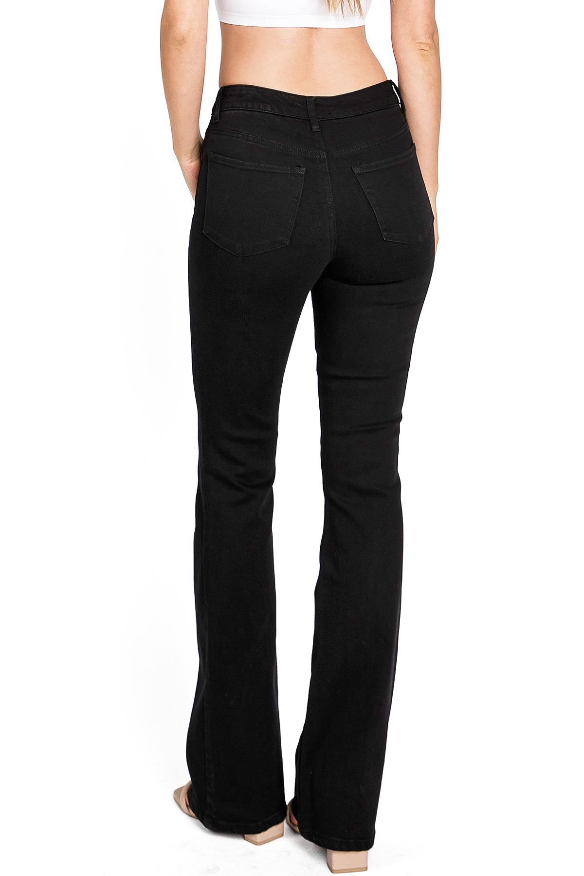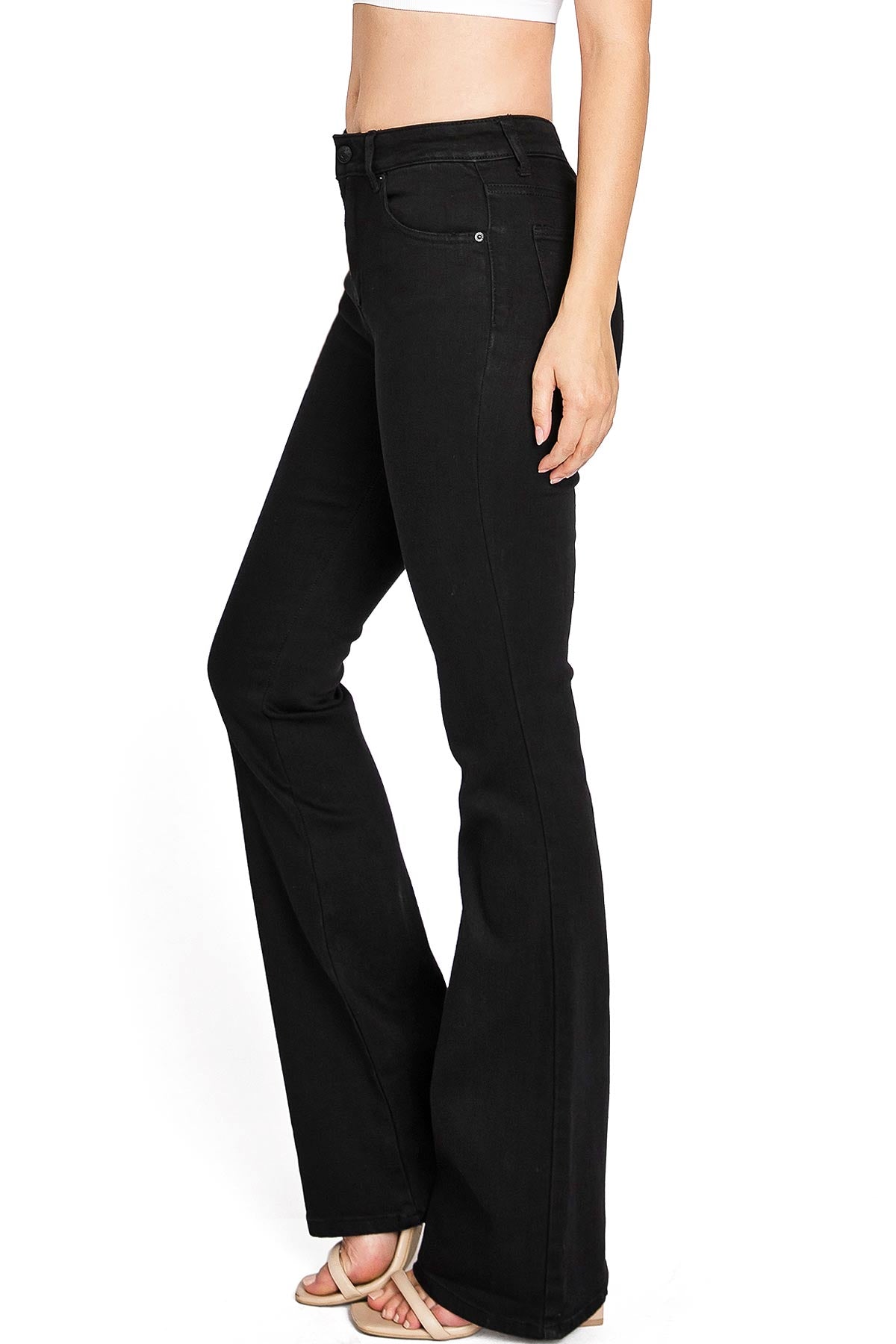 High rise, bell bottom flares with traditional 5-pockets construction and zip fly and button closure. Comfortable, stretchy denim.
