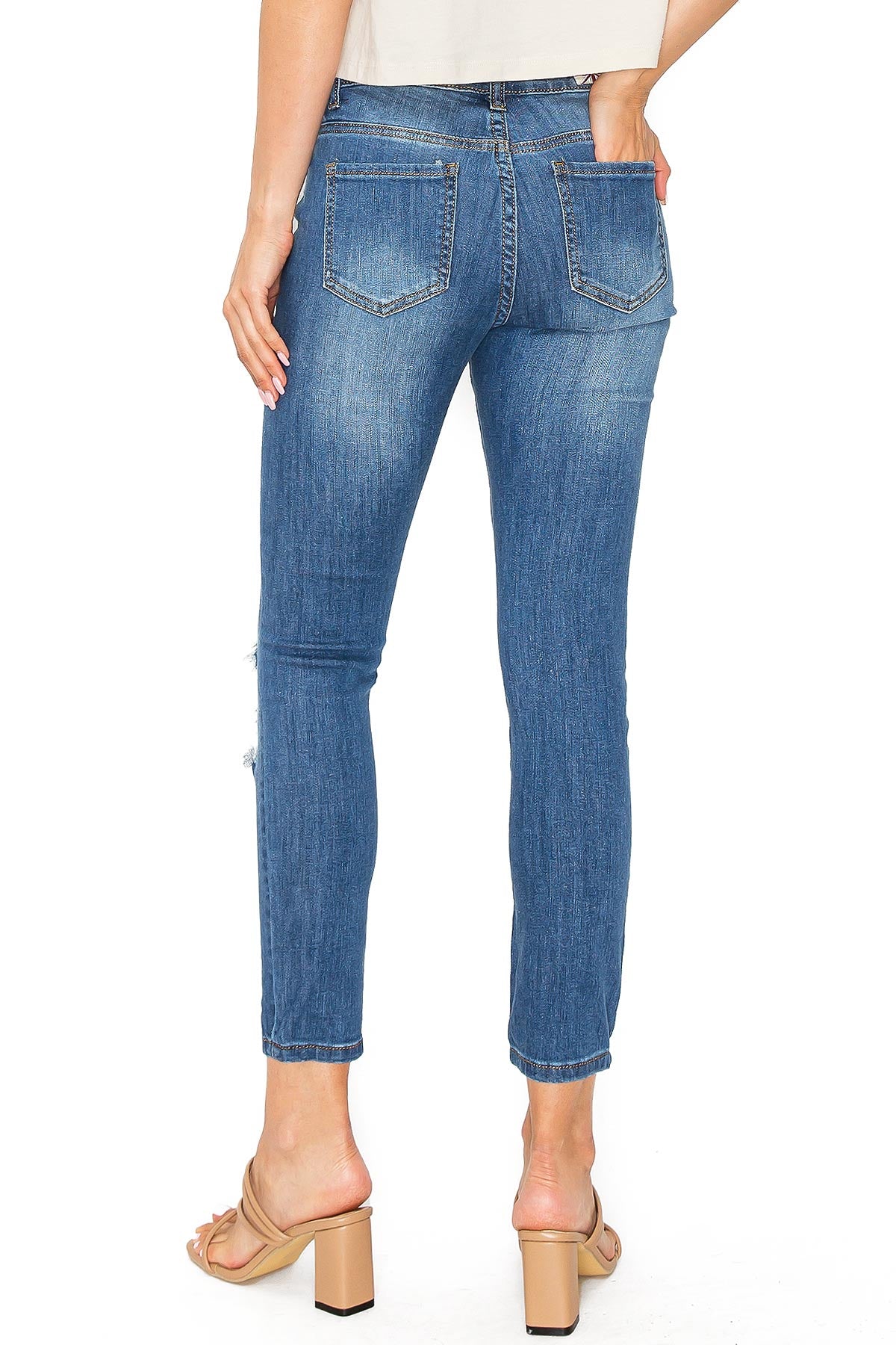Mid-rise skinny jeans with a slim-fit and distressing down the front. Traditional 5-pocket construct with a zip fly and button closure. Decent stretch for a comfortable feel. Size up recommended.