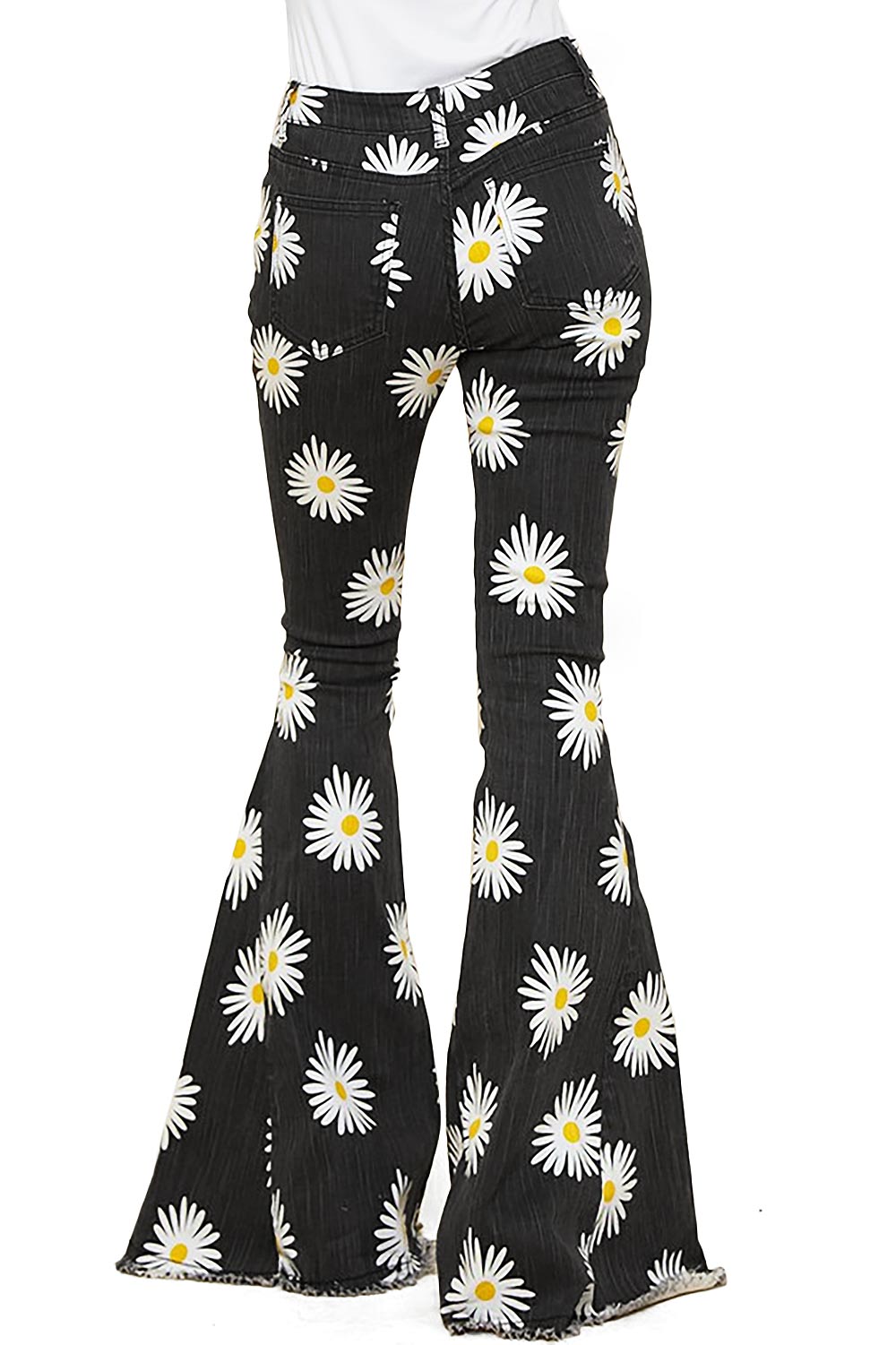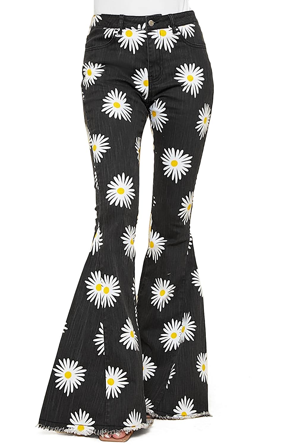 High-rise premium pants with a bold daisy print and a dramatic flare with a frayed hem. Stretchy and light jegging fit with pocket at the front and back with zipper fly and button closure.