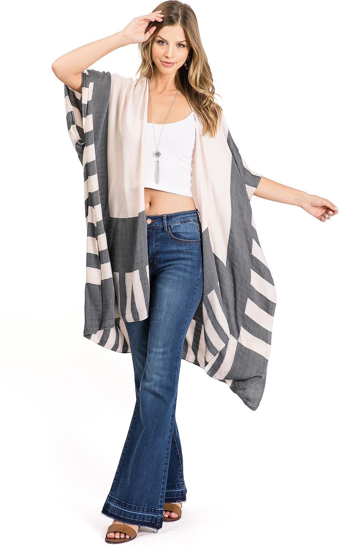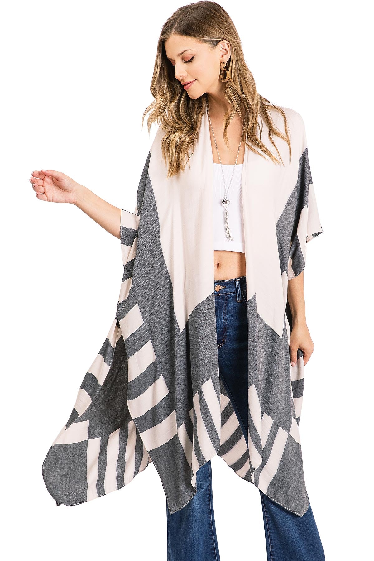 Beautiful kimono cardigan with an open-front and 3/4 length sleeves. Soft woven fabric with a color block pattern. Perfect for light layering over casual outfits!