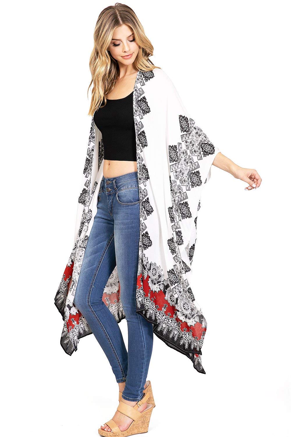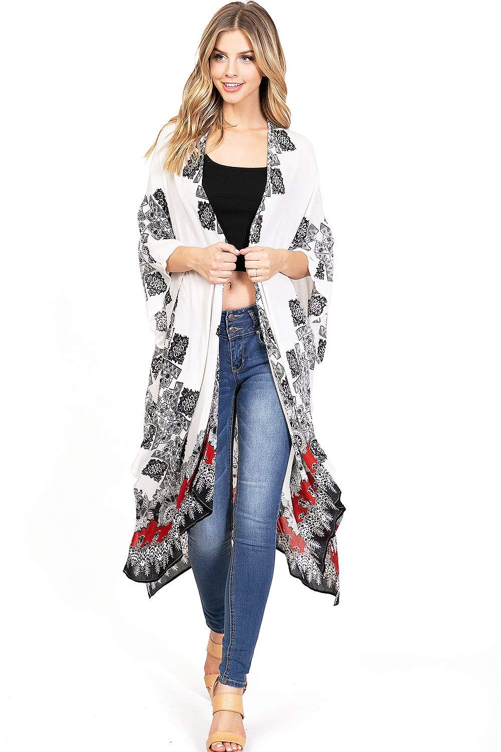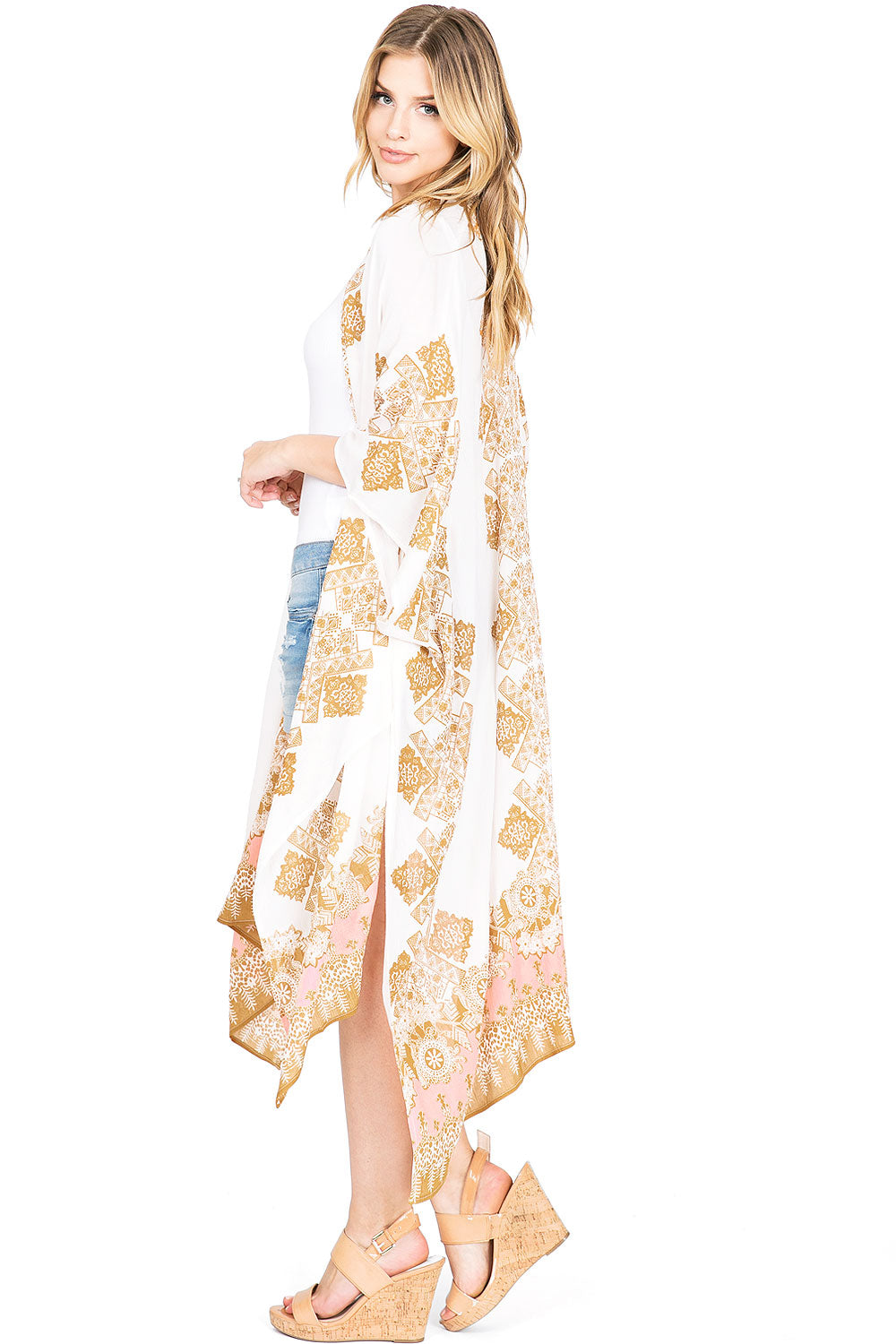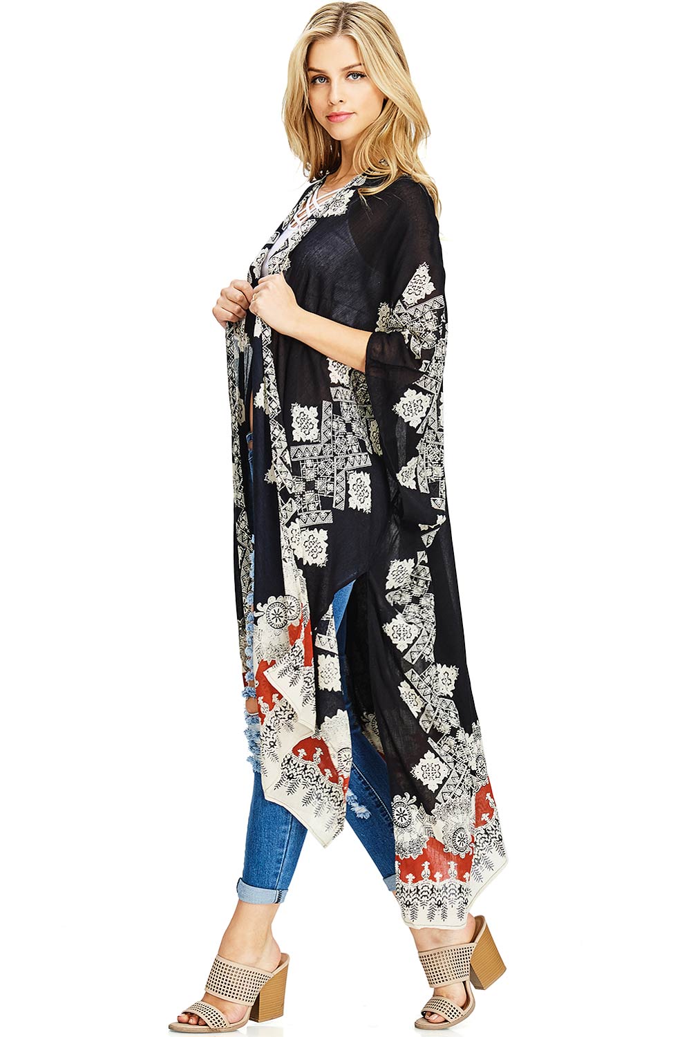 Long bohemian printed caftan cardigan with an open-front and draping sleeves. Light thin fabric is great for festivals!