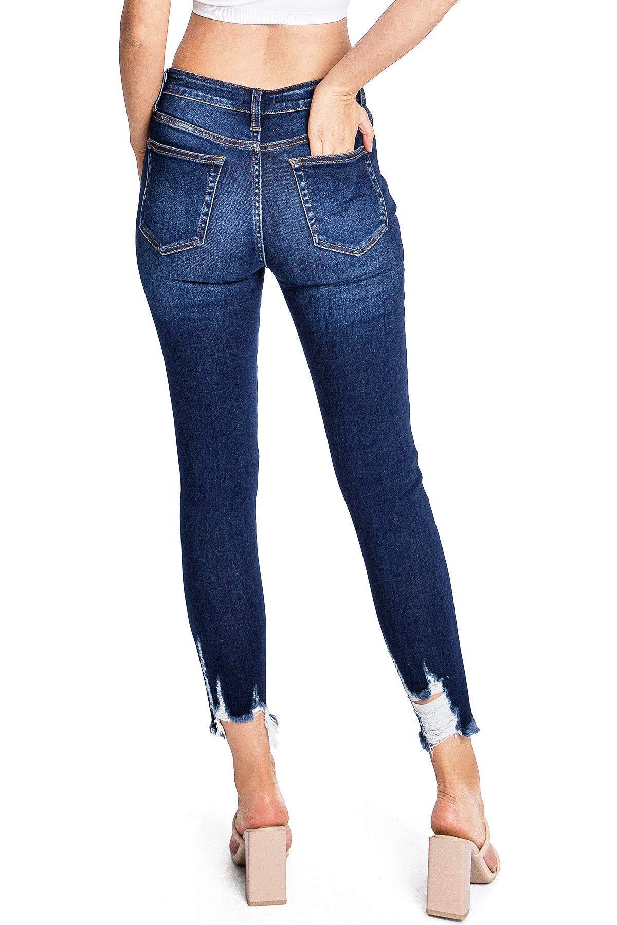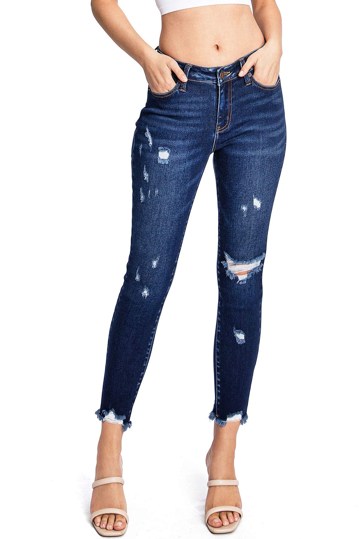 Premium mid-rise cropped skinnys with a super stretchy and soft wash denim feel. Scattered distressing down the front and fraying ankle hems. Traditional 5- pocket construction with a zip fly and button closure.