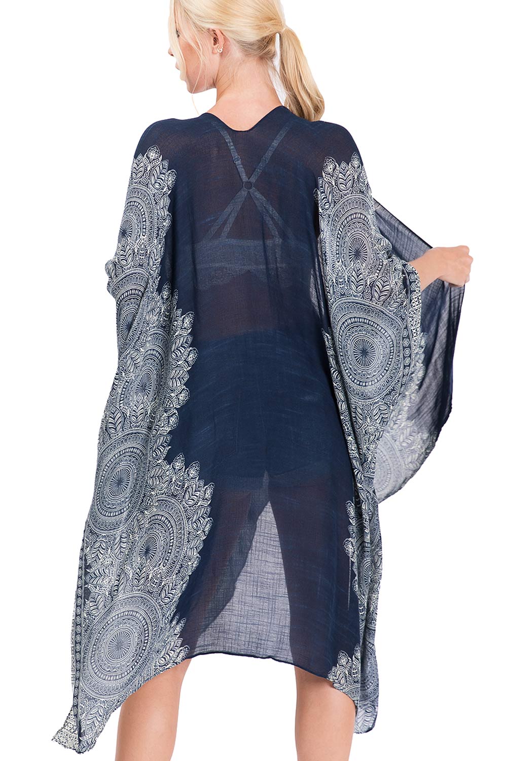 Kimono cardigan with an ultra light feel and an intricate bohemian print. Perfect for layering over casual outfits or over swimsuits.