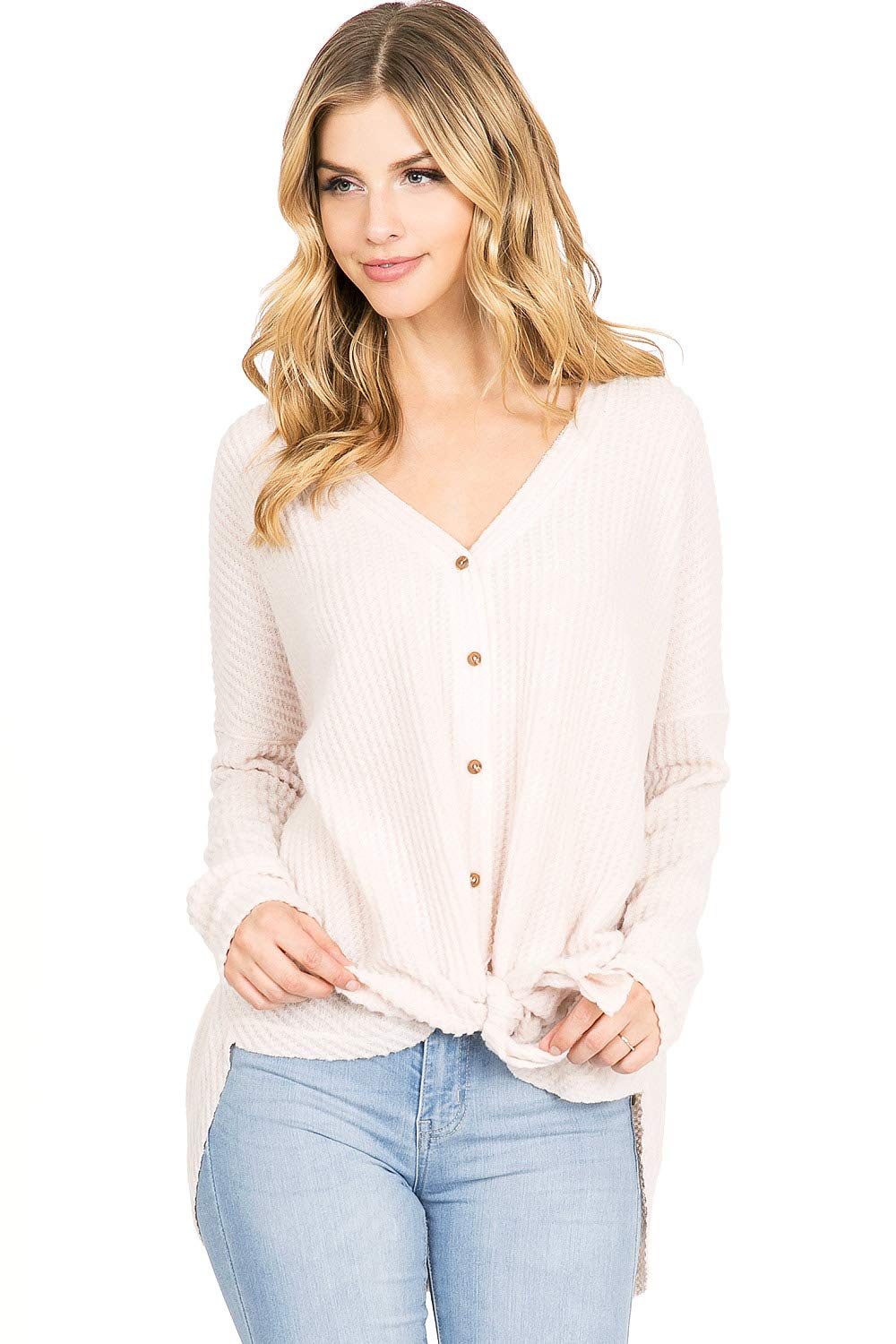 Long sleeve oversize knit top with a low cut v-neckline, a button down closure and self-tie knot at the bottom. Lightweight and super soft waffle texture with a slight oversized fit. Perfect to layer over any top and pairs with skinny or wide leg jeans.