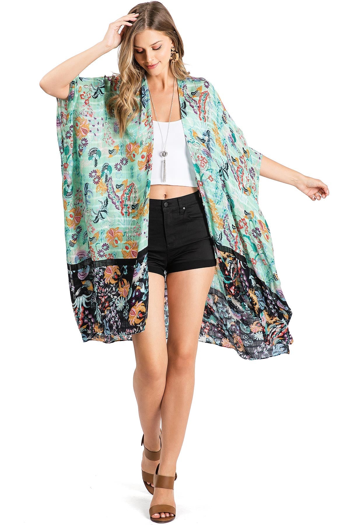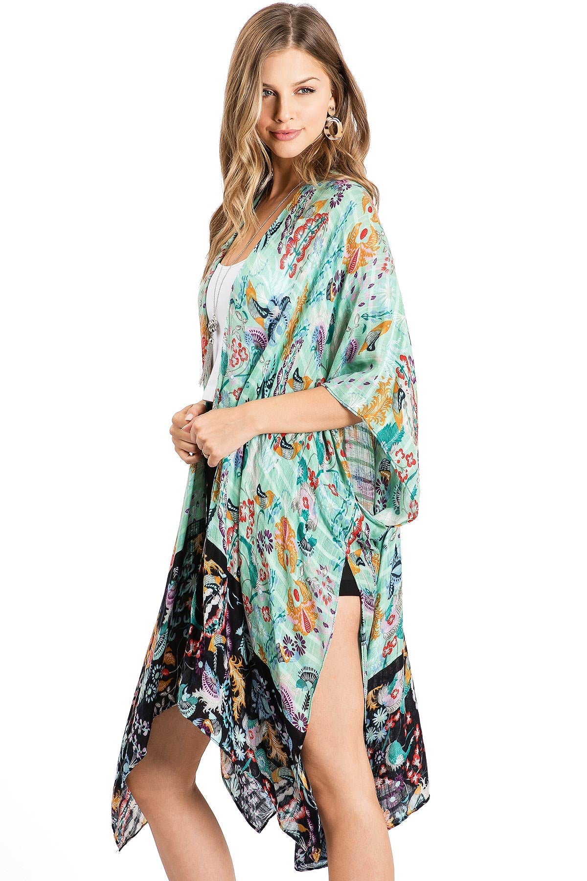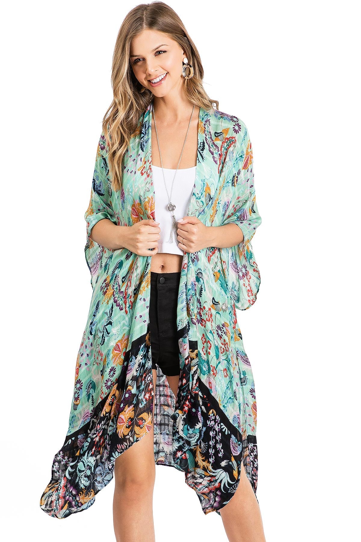 Beautiful kimono cardigan with an open-front and 3/4 length sleeves. Soft woven fabric with colorful boho and geometric floral prints. Perfect for light layering over casual outfits!