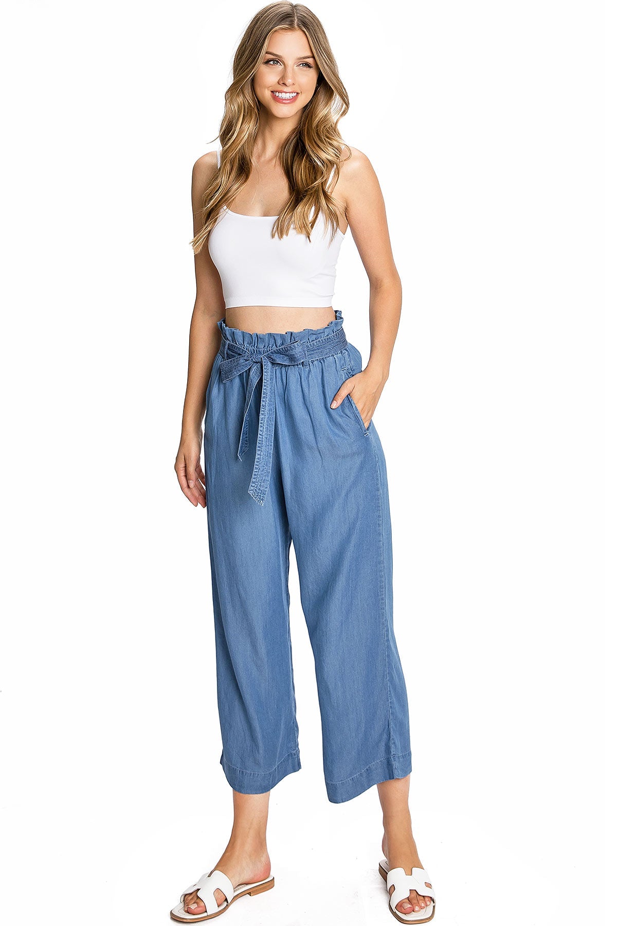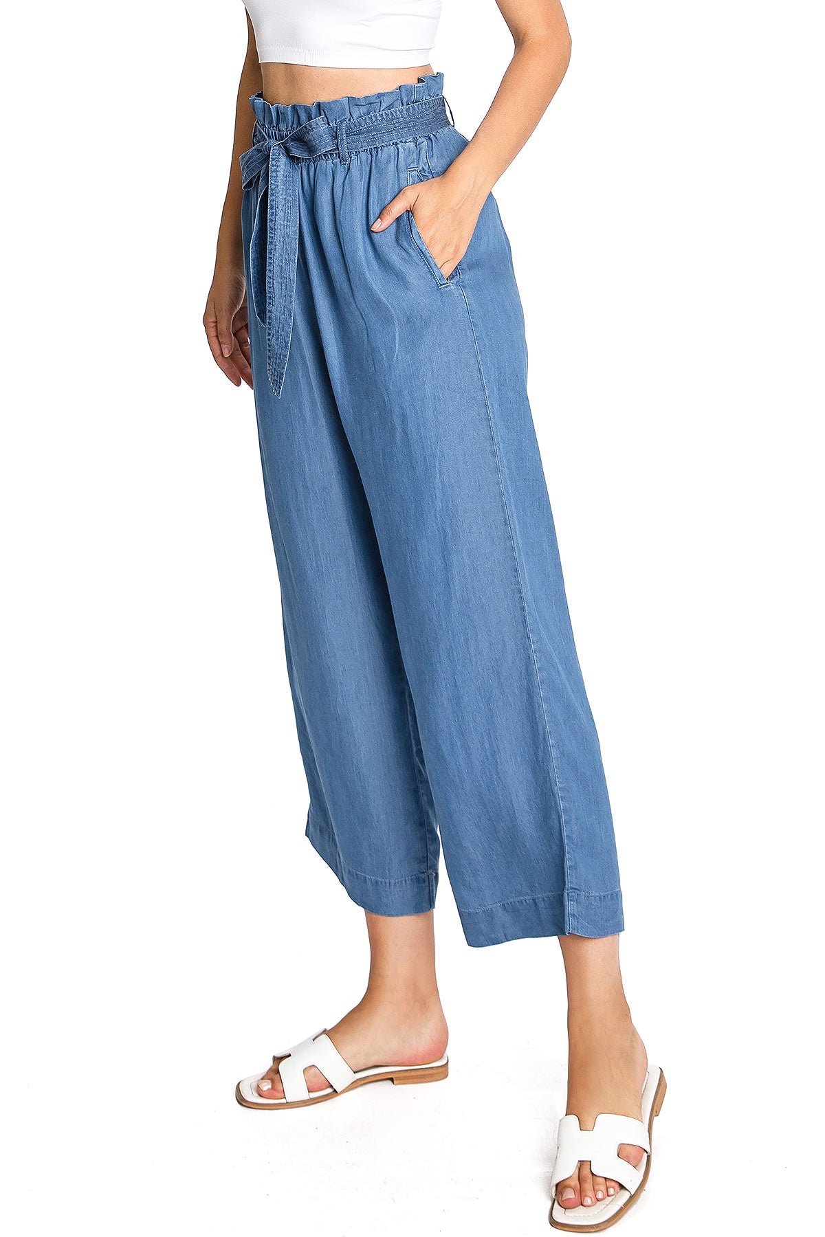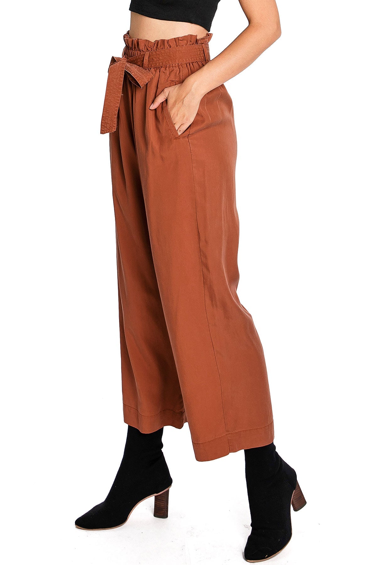 These high rise culottes feature a sophisticated paper-bag waist with a self-tie belt. With pleating at the top and convenient pockets to the sides, these culottes combine classic design with modern functionality. Whether you're dressing up for a night out or keeping it casual for a day at the office, these culottes effortlessly transition from day to night.