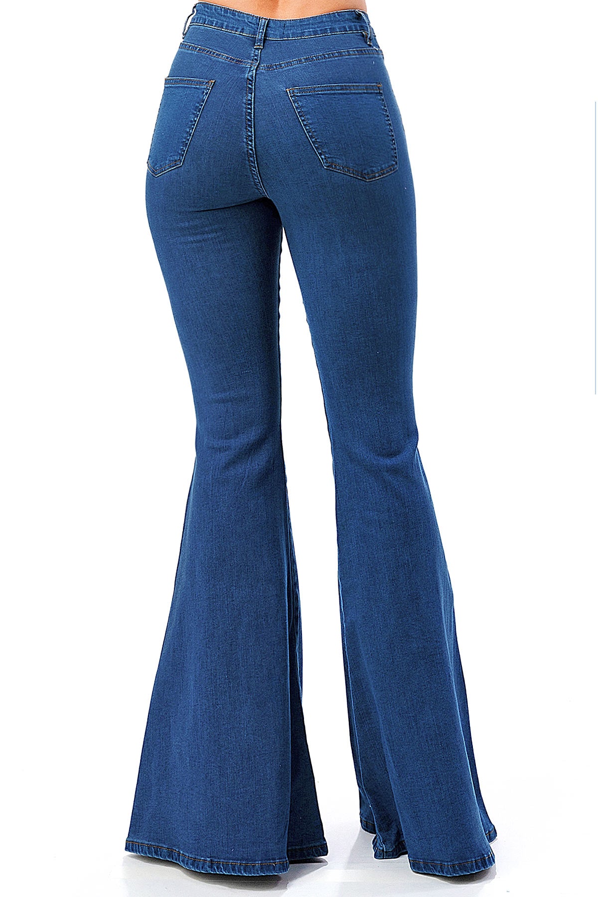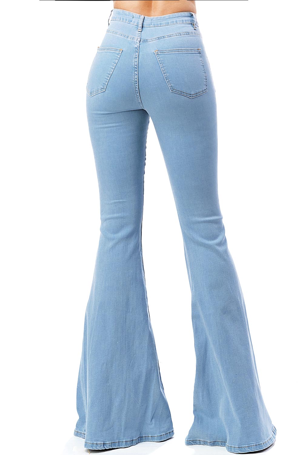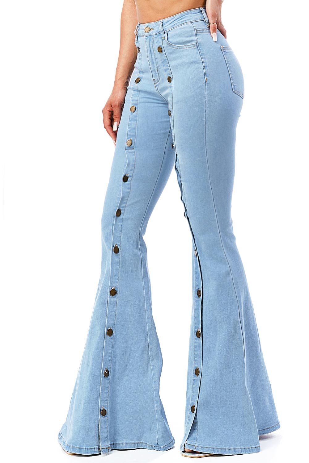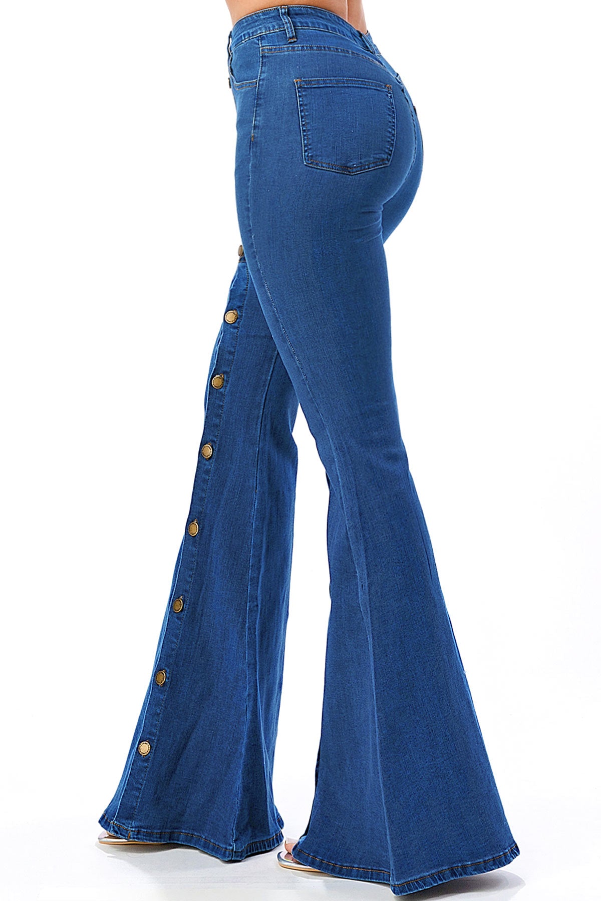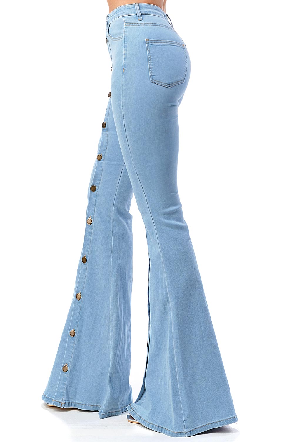 High-rise, bell bottom jeans with a button down design down the front on the legs. Adjust the look by buttoning or unbuttoning as many as you choose! Traditional 5-pocket construction with a zip fly and button closure. Slim fit silhouette with a comfortable stretch.