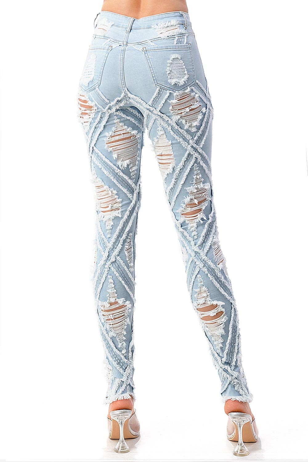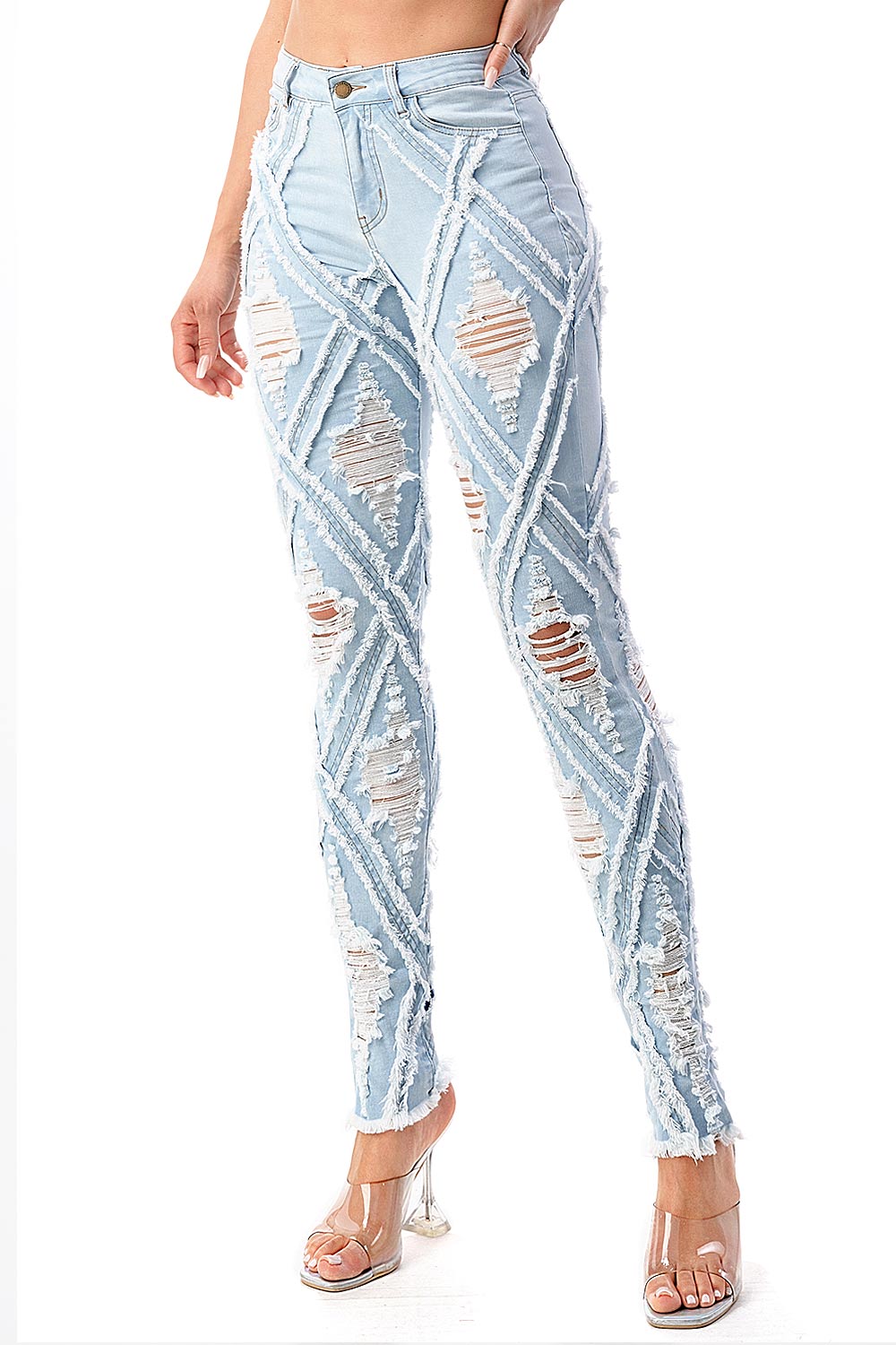 High-rise, skinny jeans with extreme distressing and fraying design. Traditional 5-pocket construction with a zip fly and button closure. Slim fit silhouette with a comfortable stretch. This style is truly one of a kind. However as with any distressed jeans, some minor flaws may be present such as torn fringe tassels or cuts and uneven colors. Each item is inspected for quality.