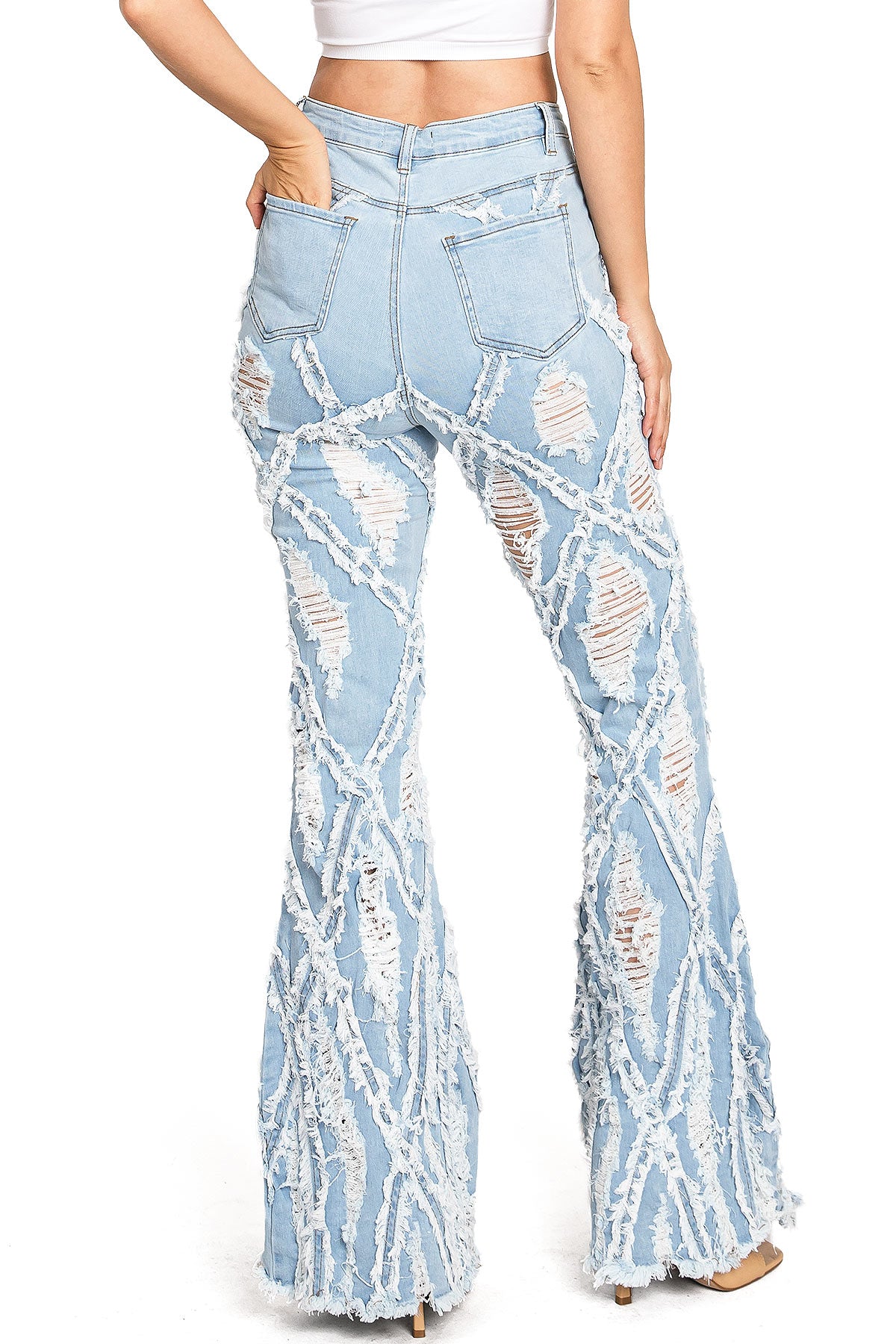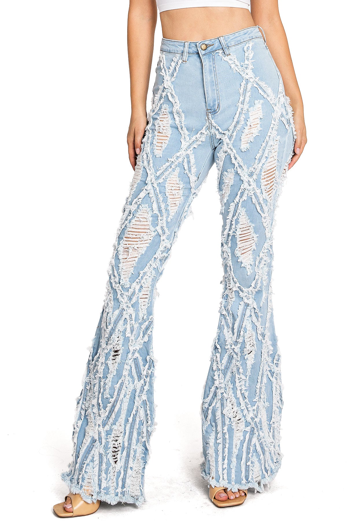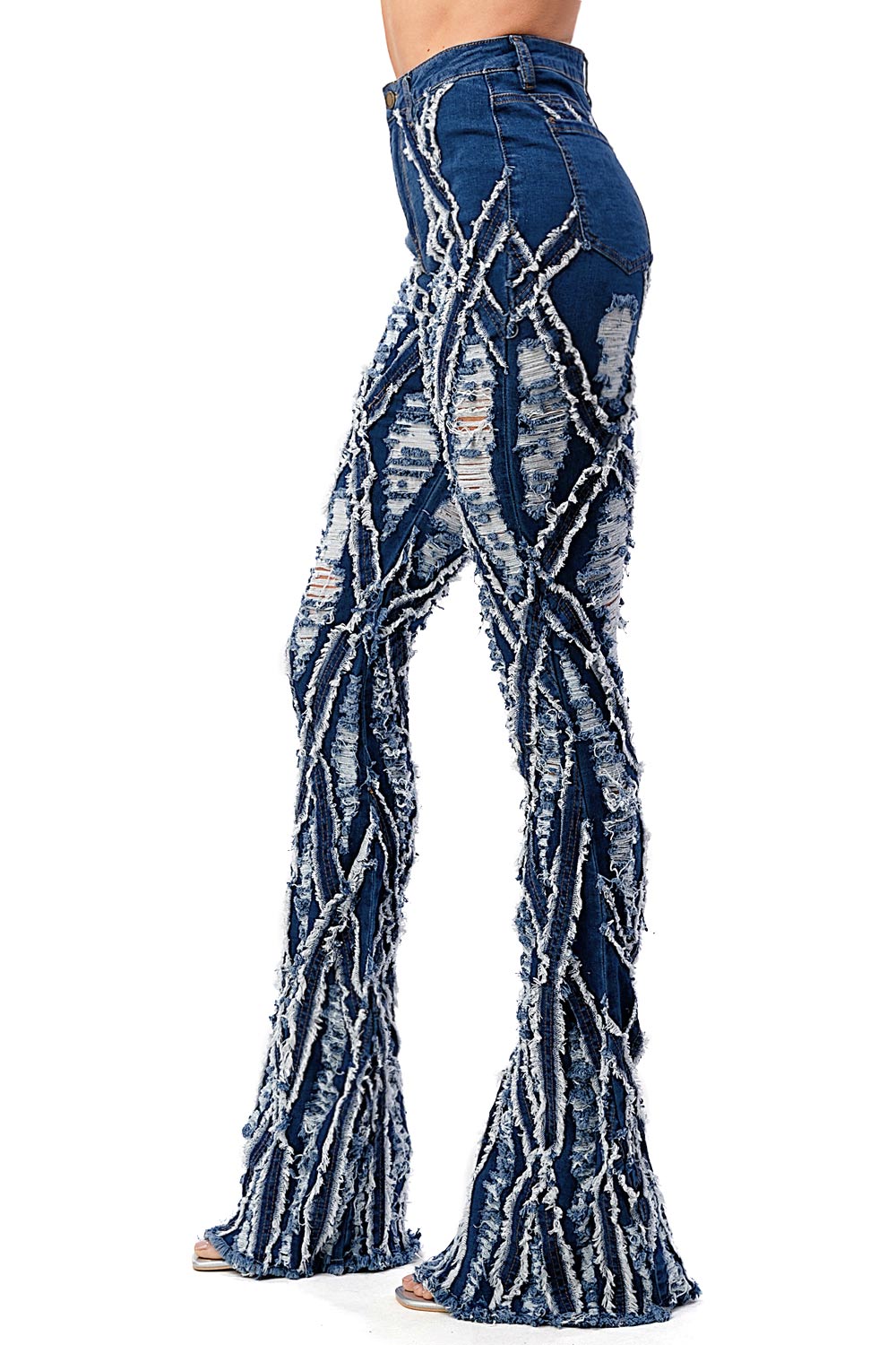 High-rise, bell bottom jeans with extreme distressing and fraying design. Traditional 5-pocket construction with a zip fly and button closure. Slim fit silhouette with a comfortable stretch. This style is truly one of a kind. However as with any distressed jeans, some minor flaws may be present such as torn fringe tassels or cuts and uneven colors. Each item is inspected for quality.