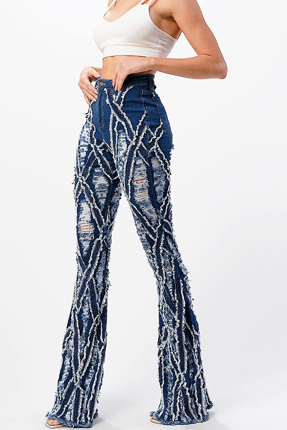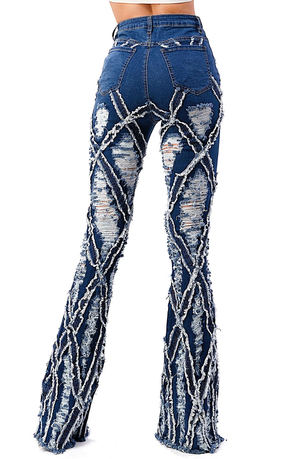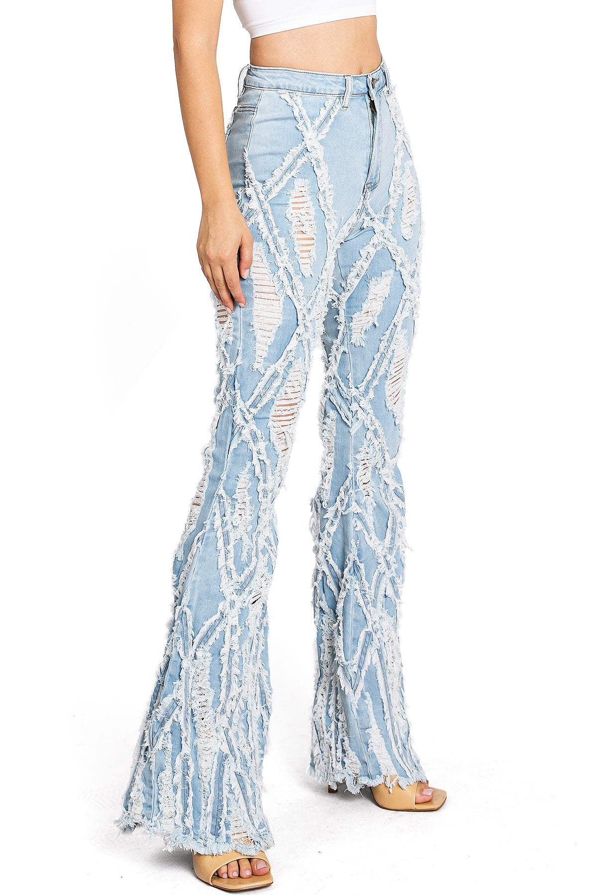 High-rise, bell bottom jeans with extreme distressing and fraying design. Traditional 5-pocket construction with a zip fly and button closure. Slim fit silhouette with a comfortable stretch. This style is truly one of a kind. However as with any distressed jeans, some minor flaws may be present such as torn fringe tassels or cuts and uneven colors. Each item is inspected for quality.