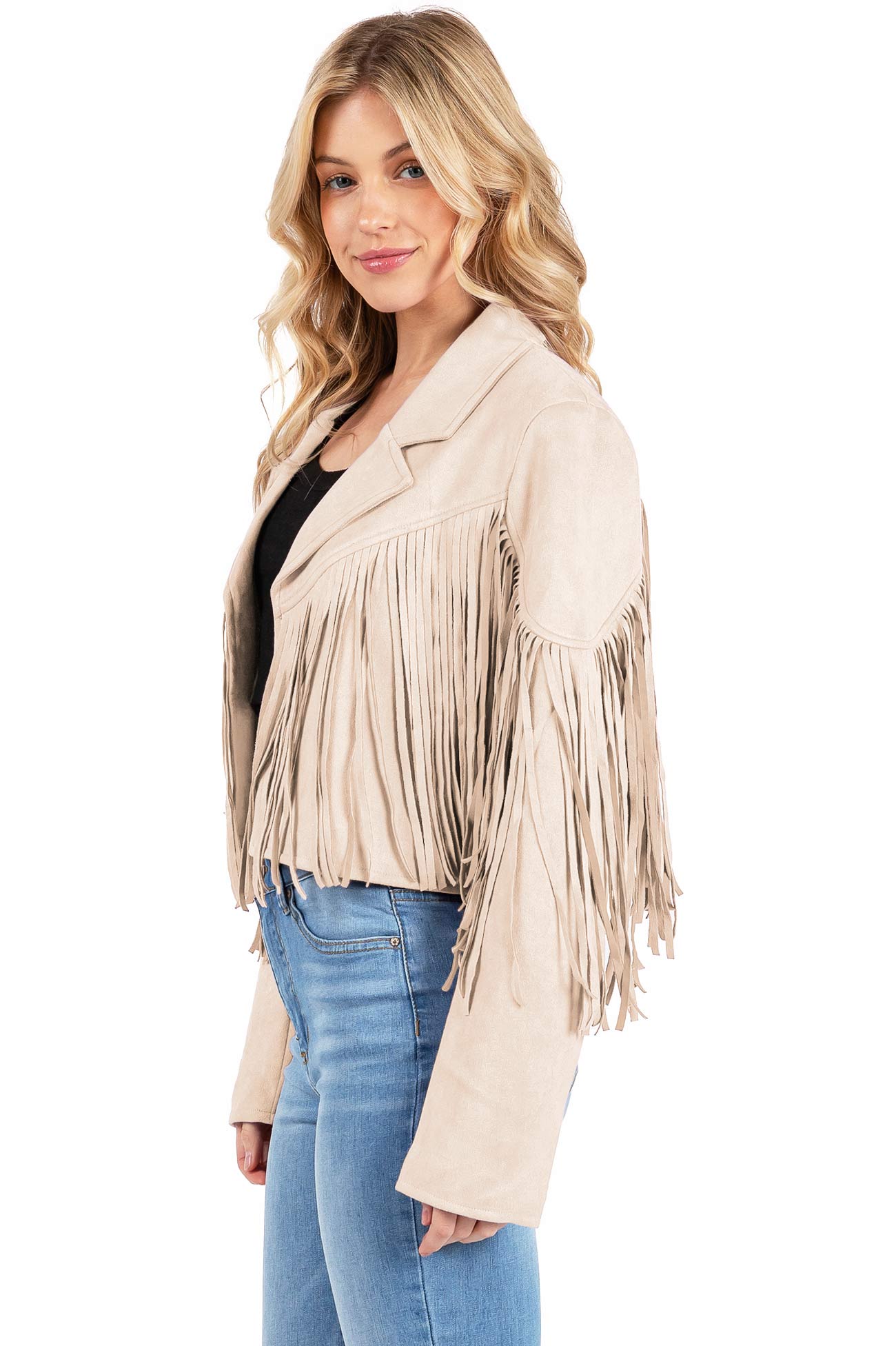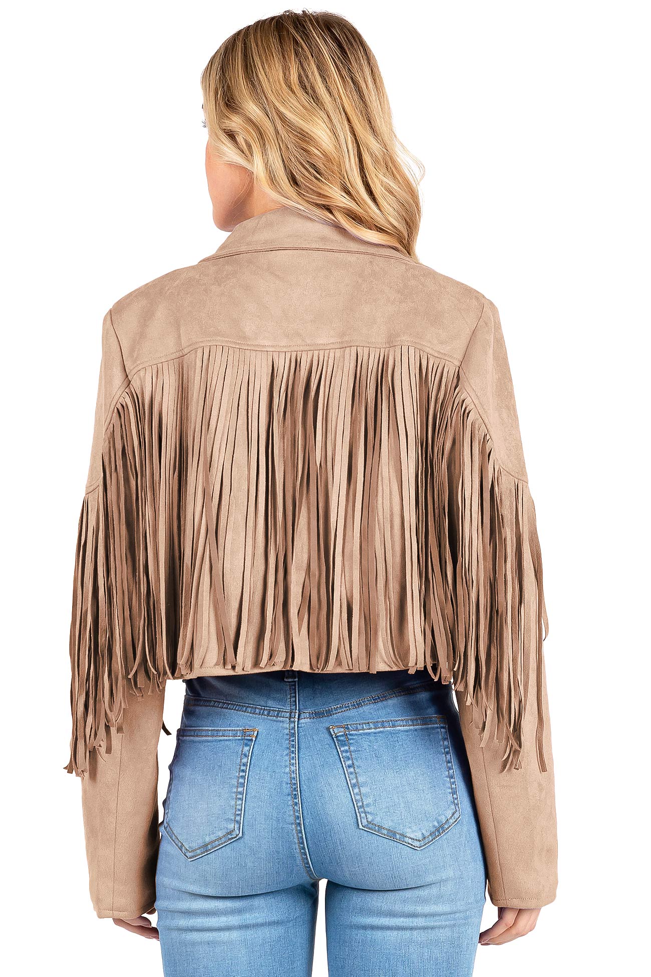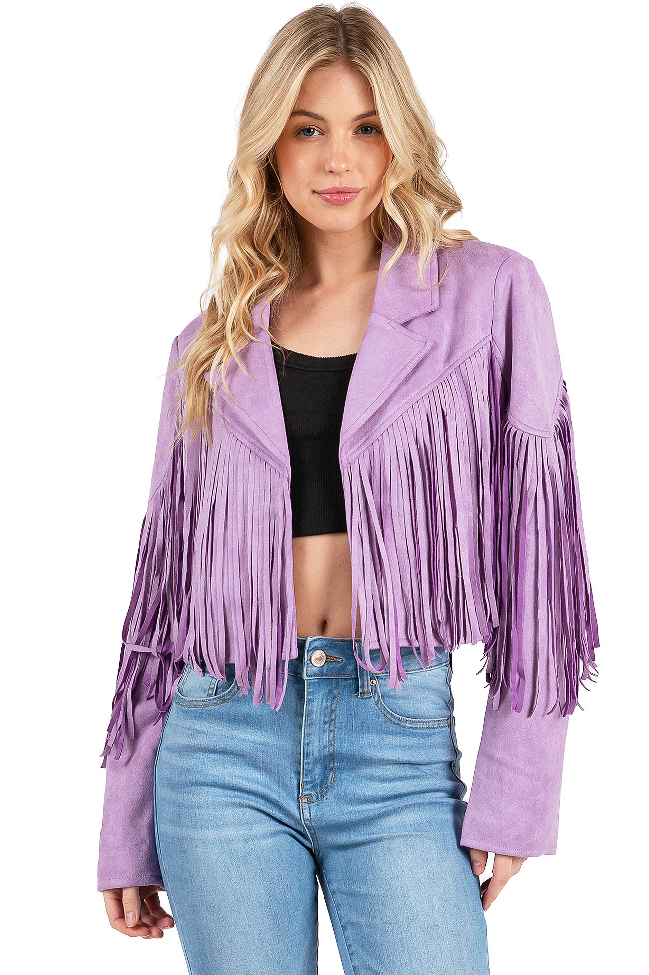 Premium faux-suede, jacket with a casual open front and fringe along the front and back. Cropped silhouette, and fully lined. Add some western vibes to any casual outfit!