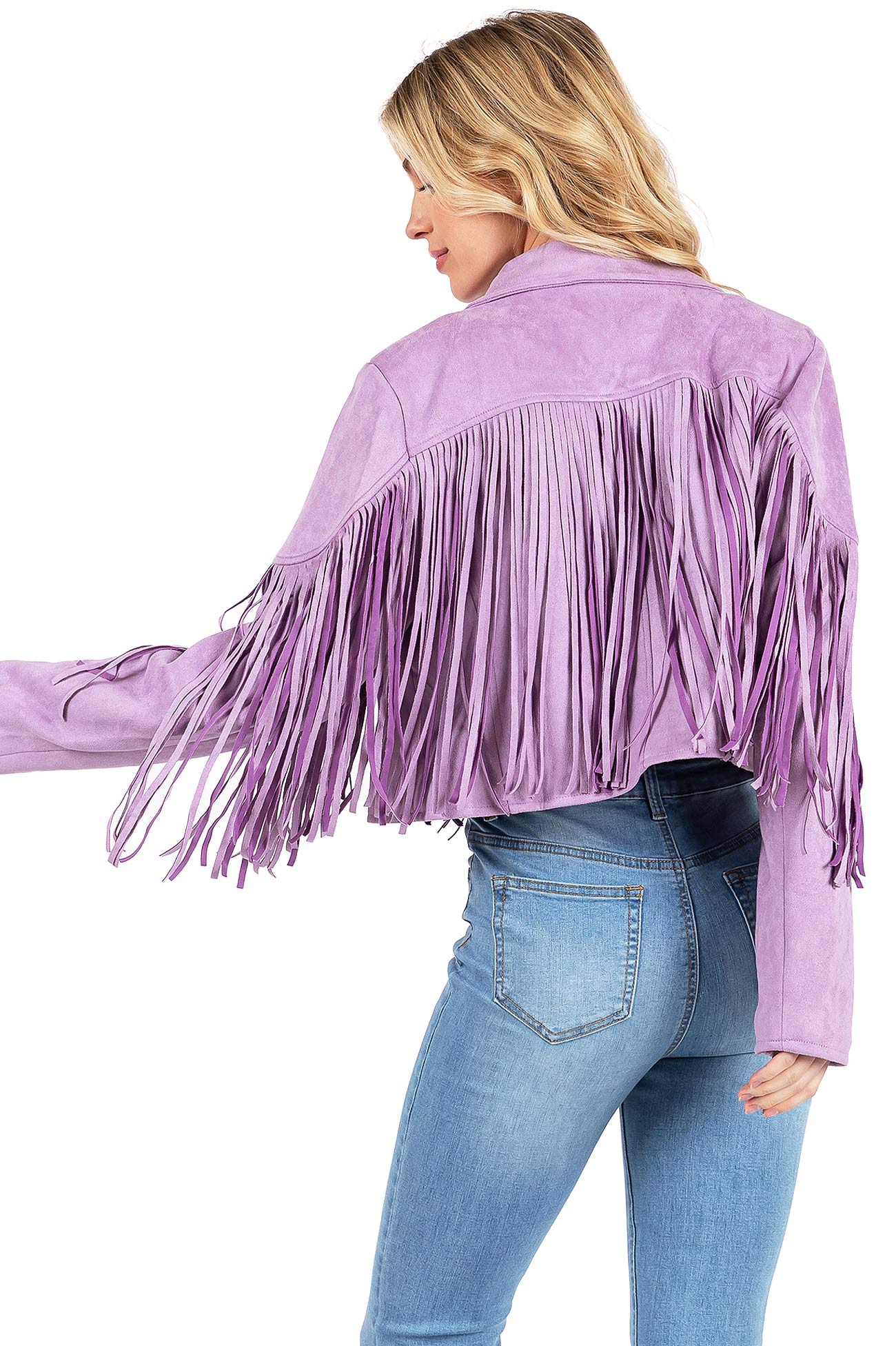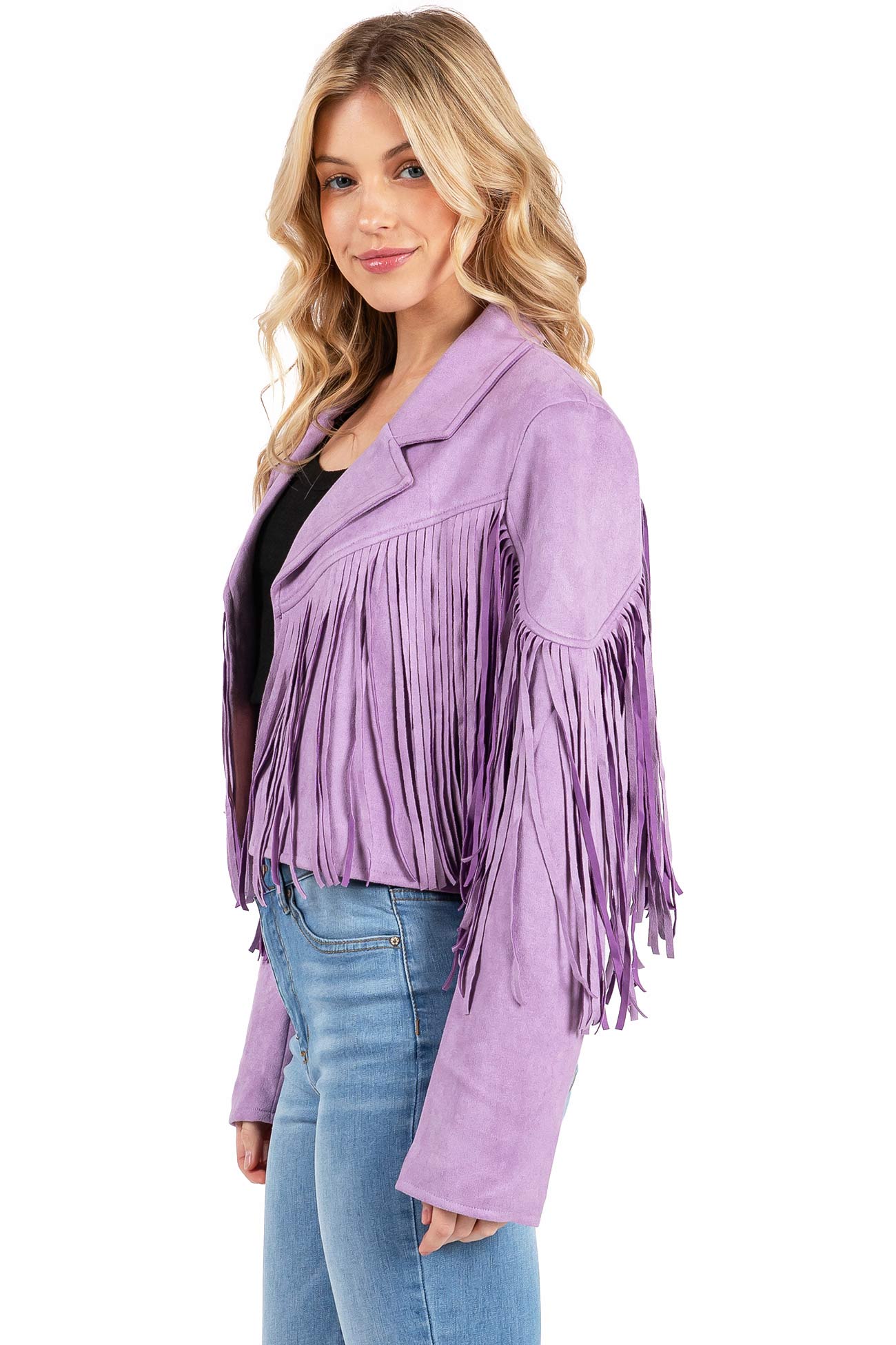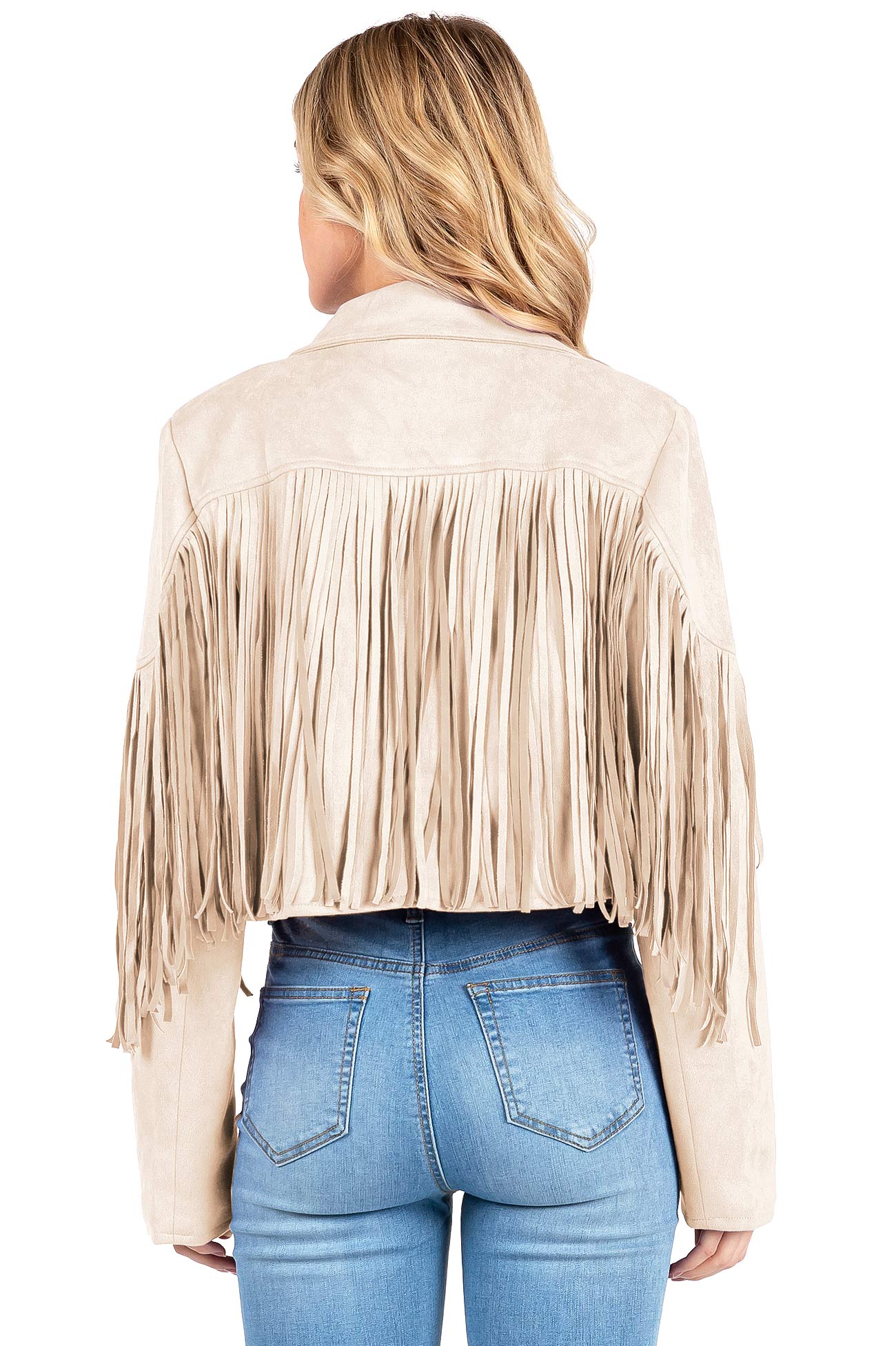 Premium faux-suede, jacket with a casual open front and fringe along the front and back. Cropped silhouette, and fully lined. Add some western vibes to any casual outfit!