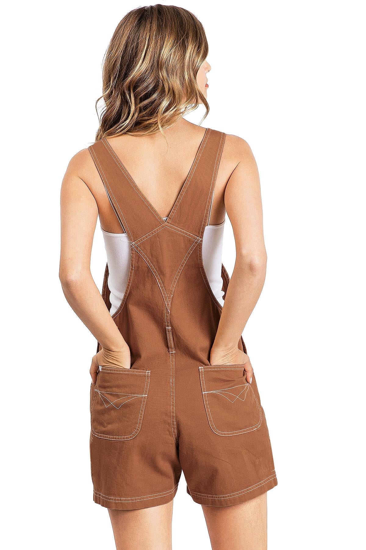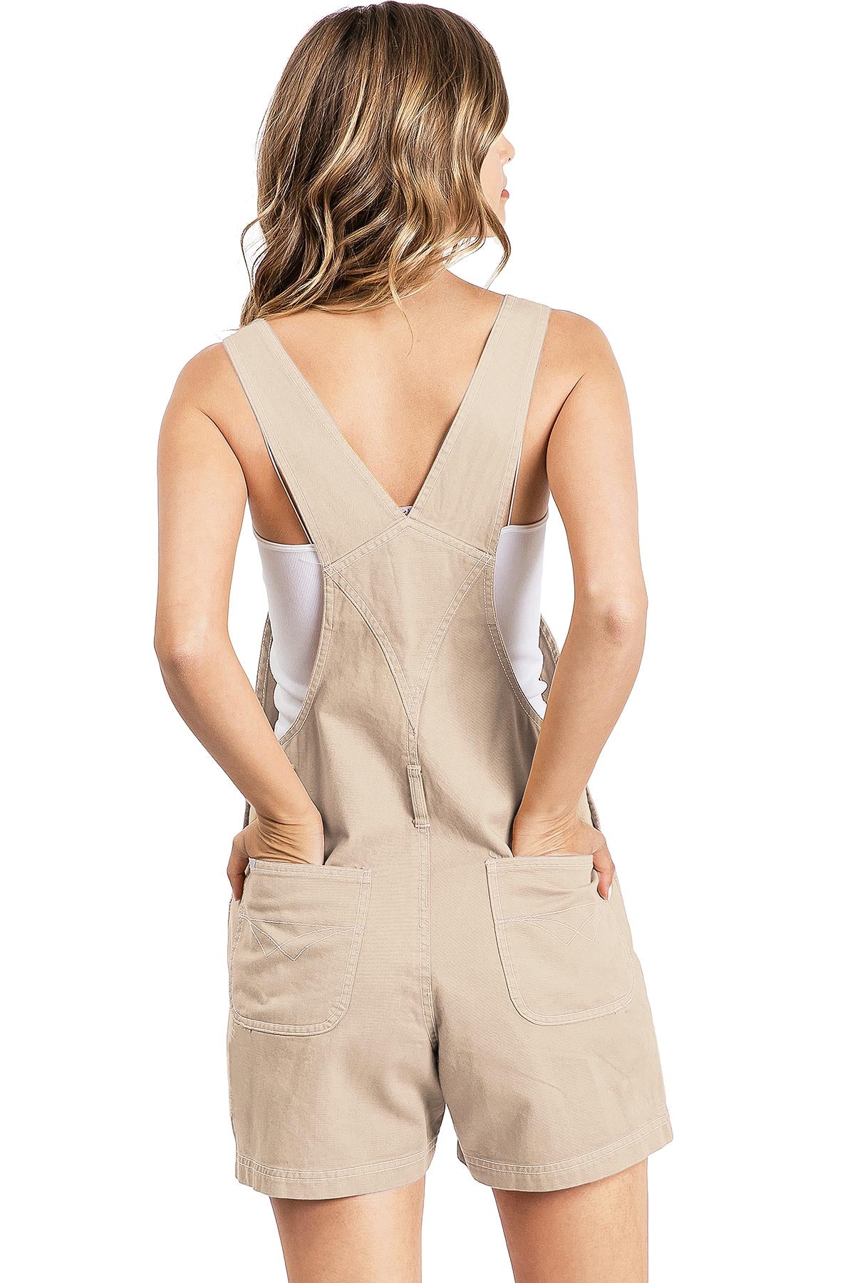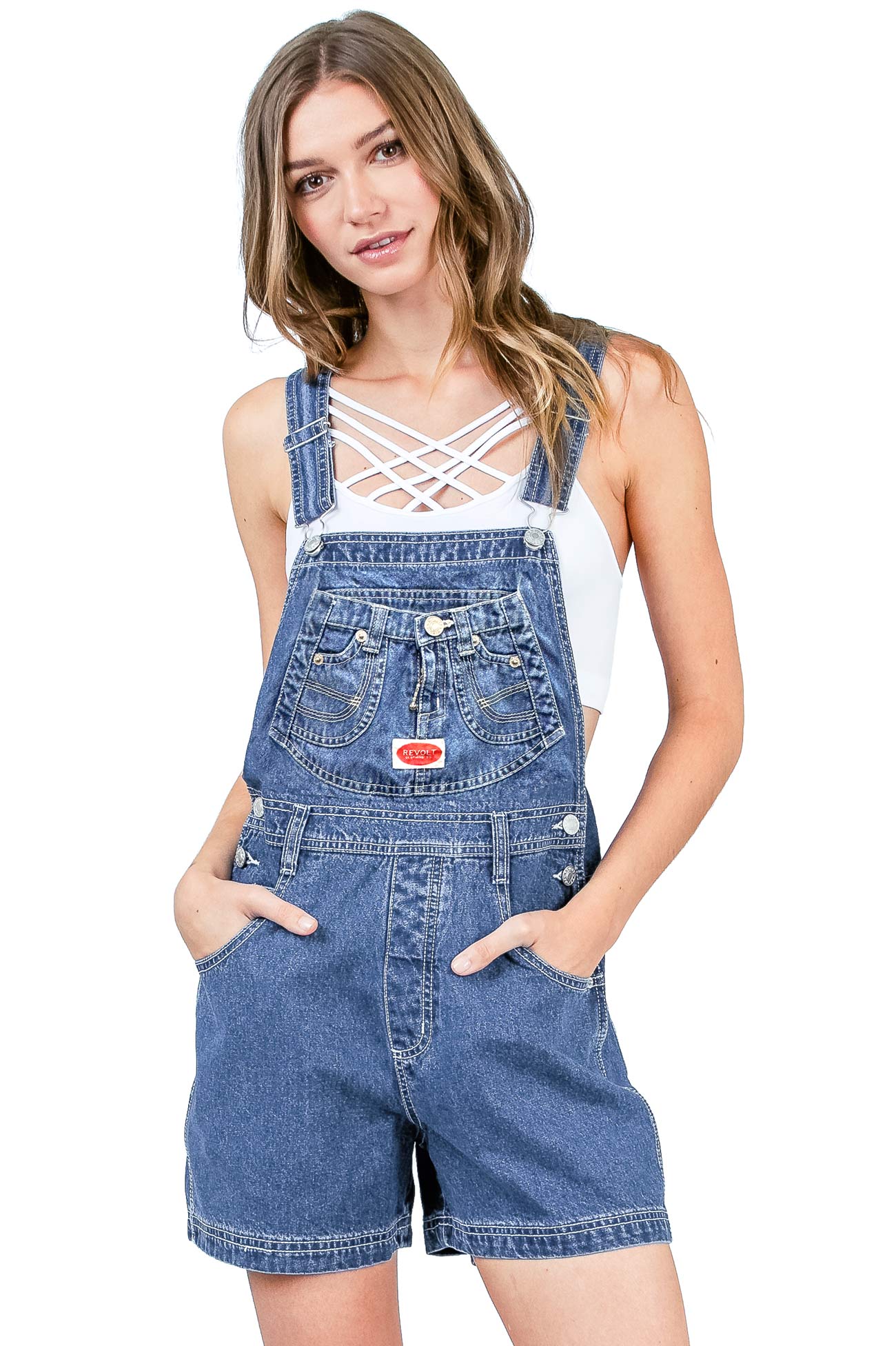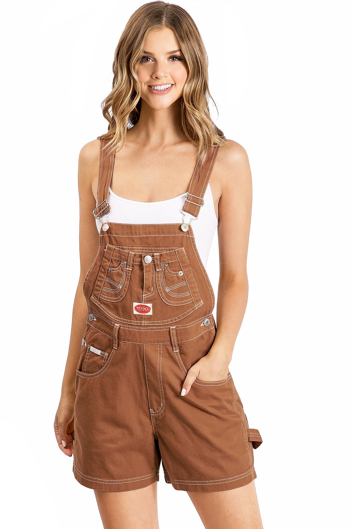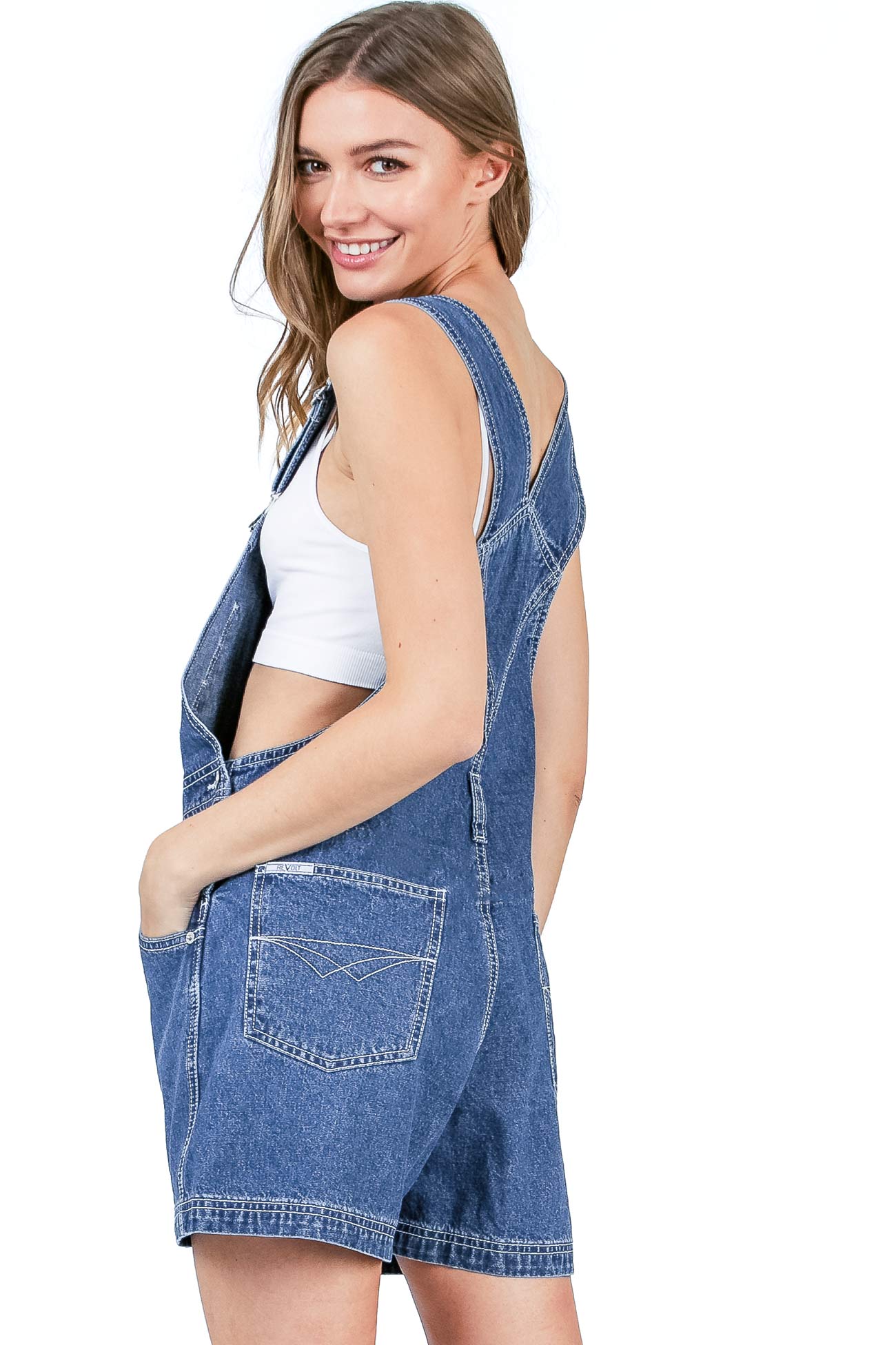 Twill or denim short overalls with a multi pocket bib and logo patch detail. Traditional straps with clasp closures. Pockets on the sides and back with button closures at the sides. Looks great paired with crop tops. No stretch.