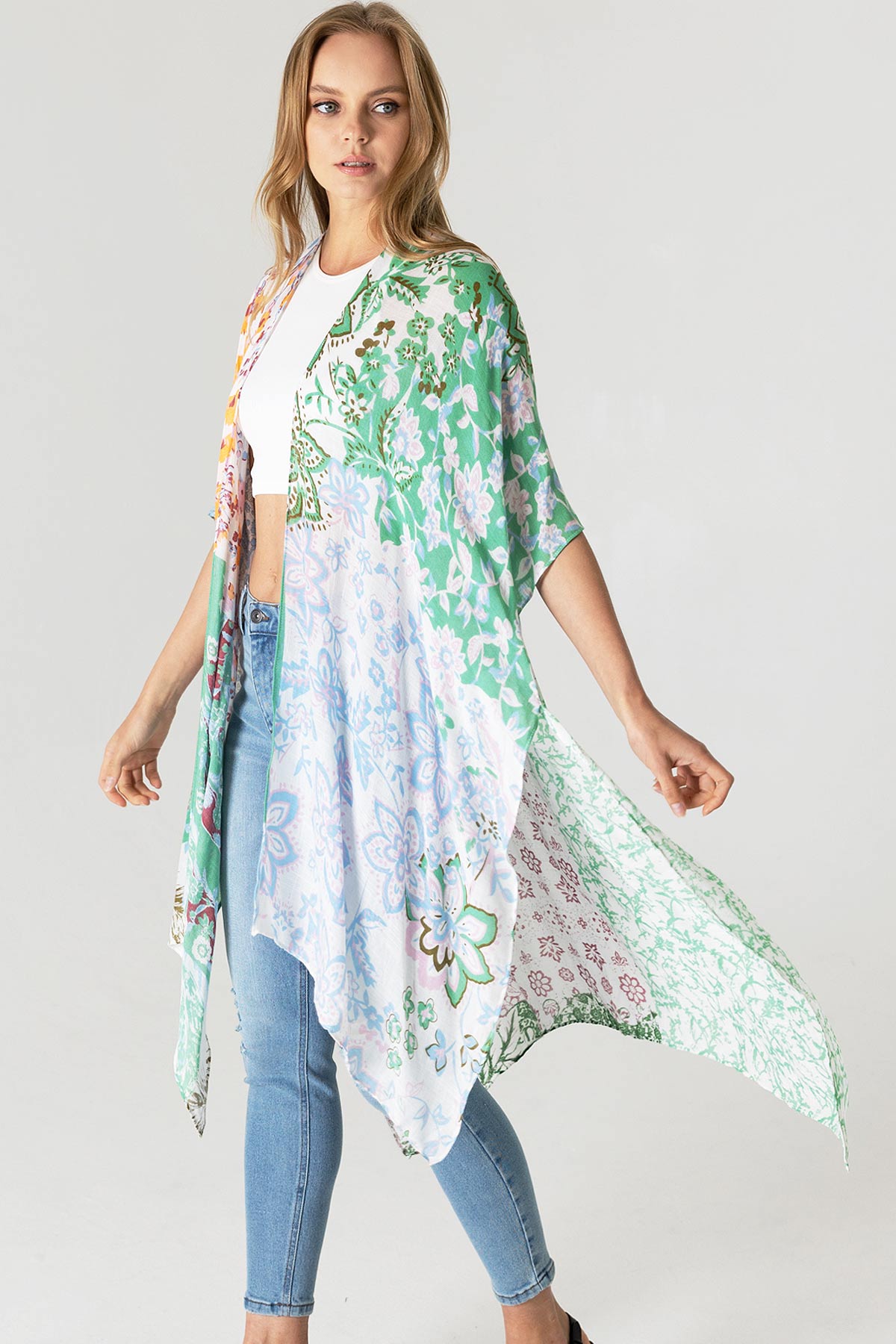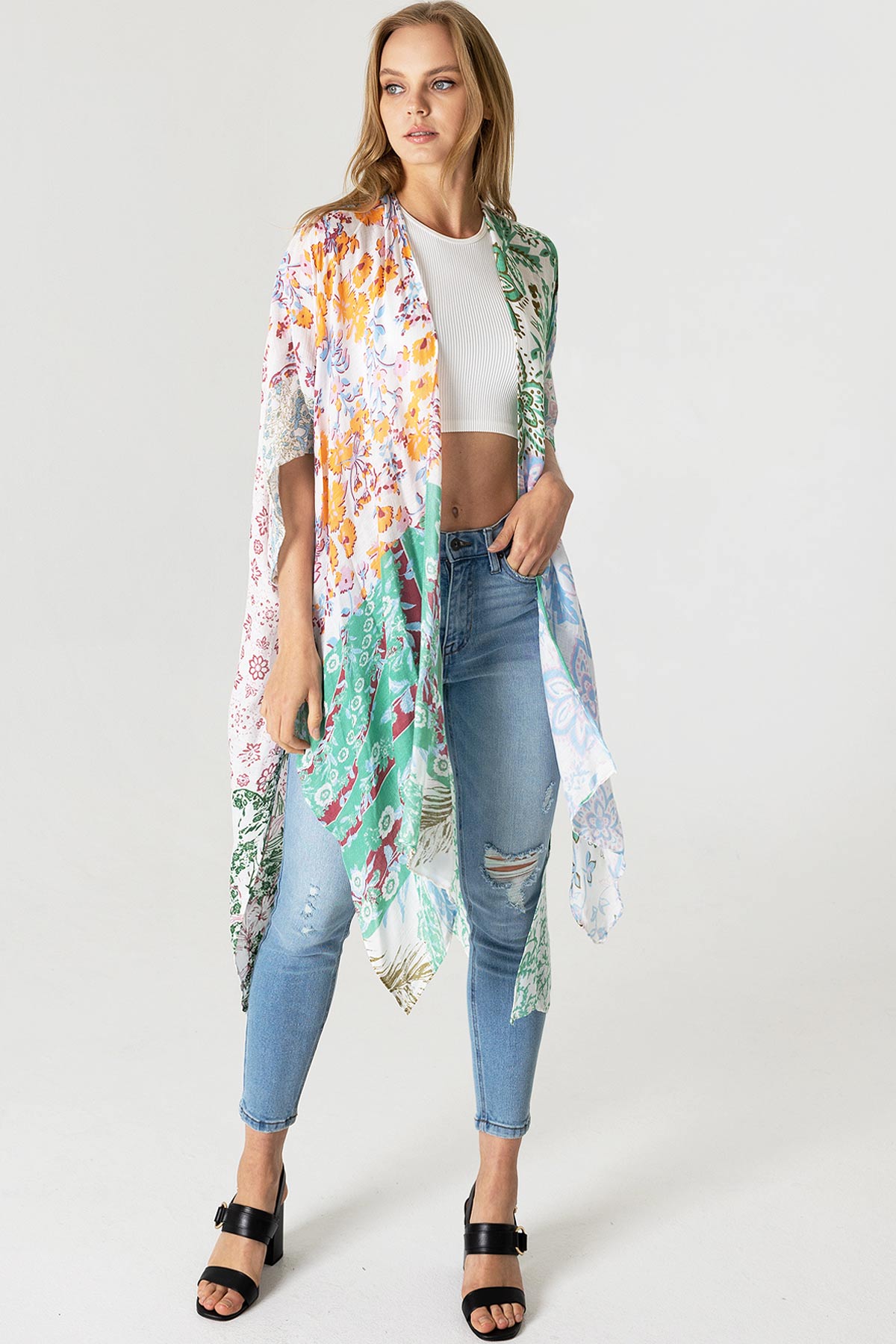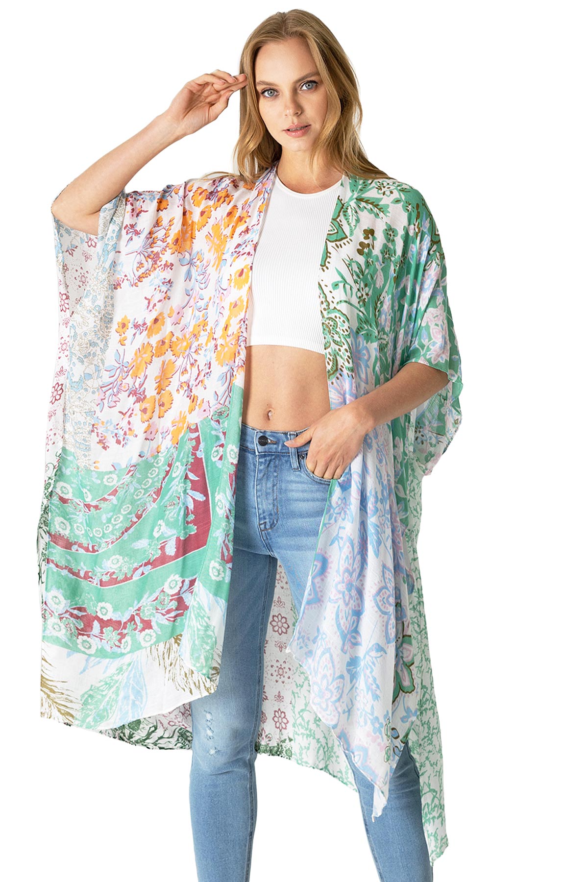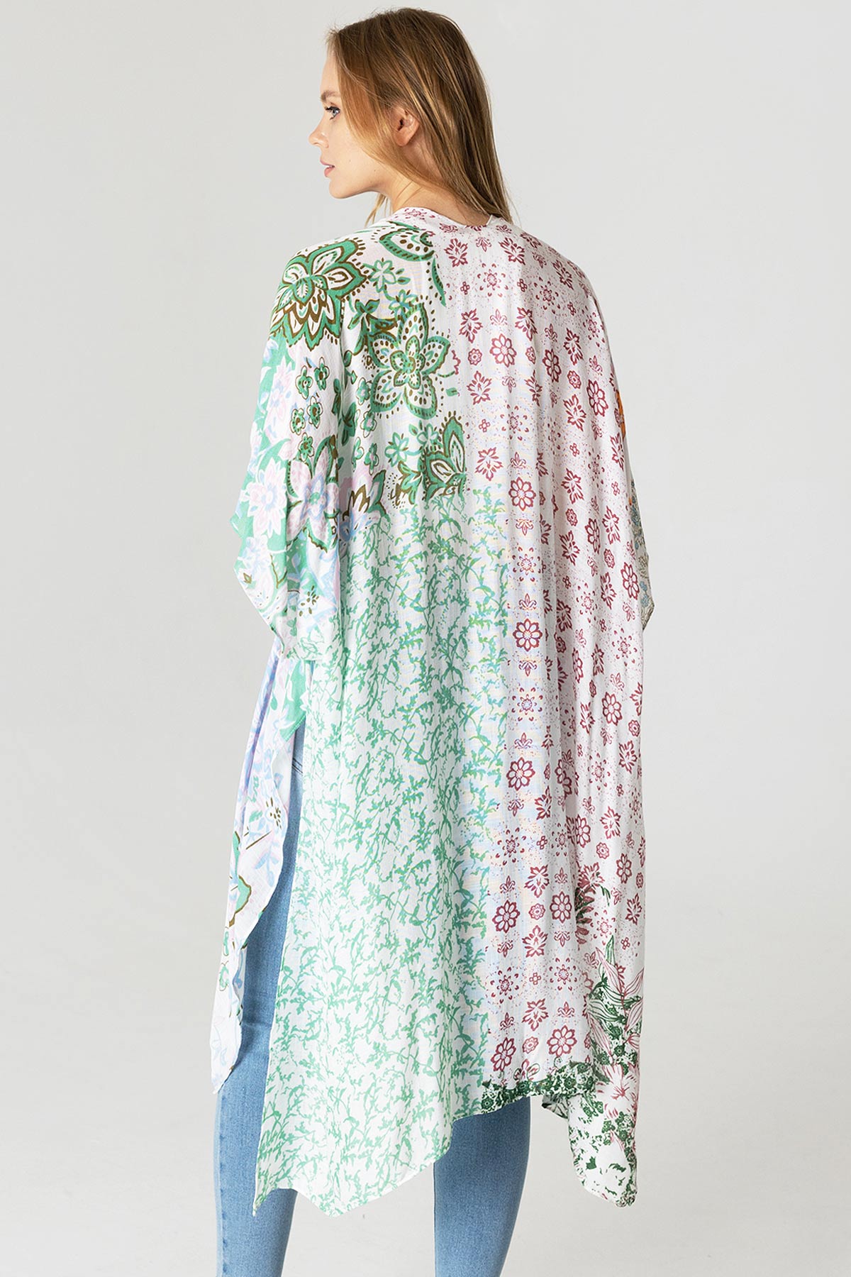 Boho print kimono with contrasting prints. Ultra light, draping open-front. Light and billowy silhouette, perfect for effortless layering.