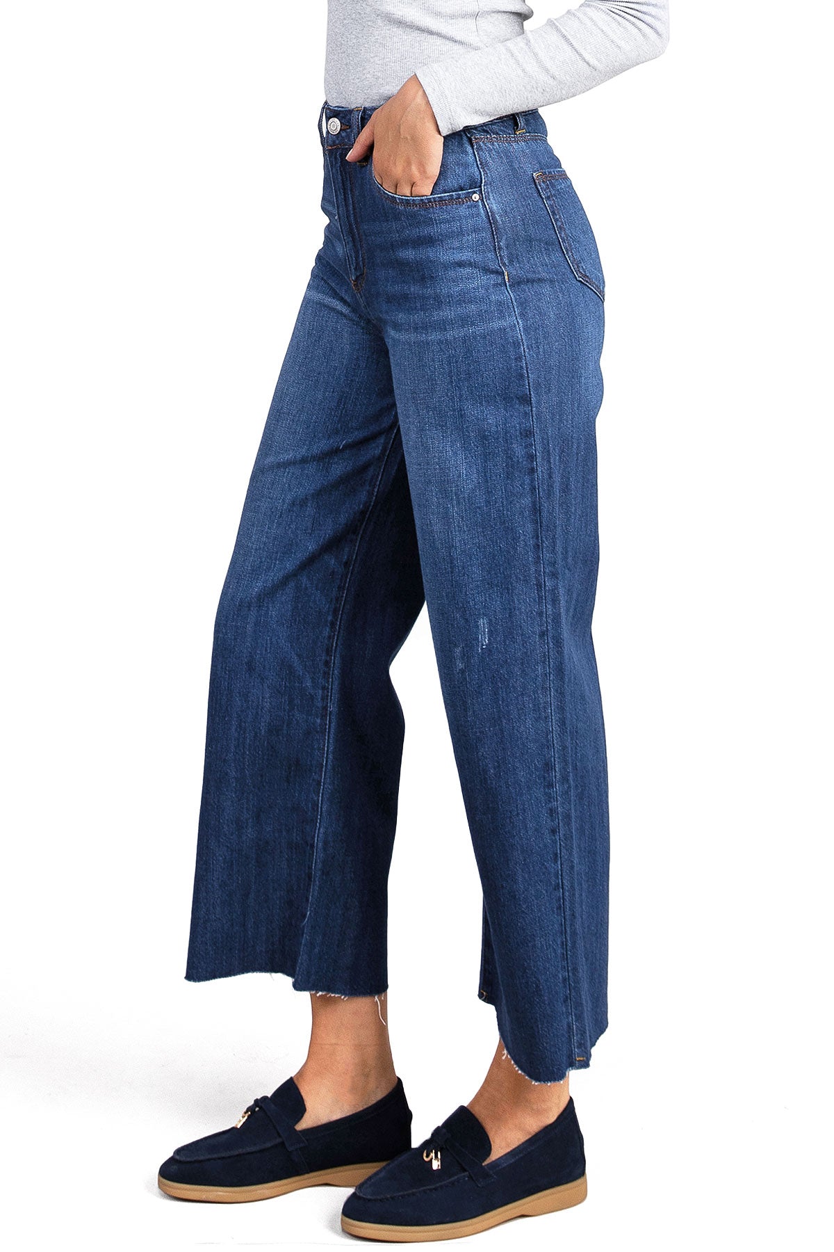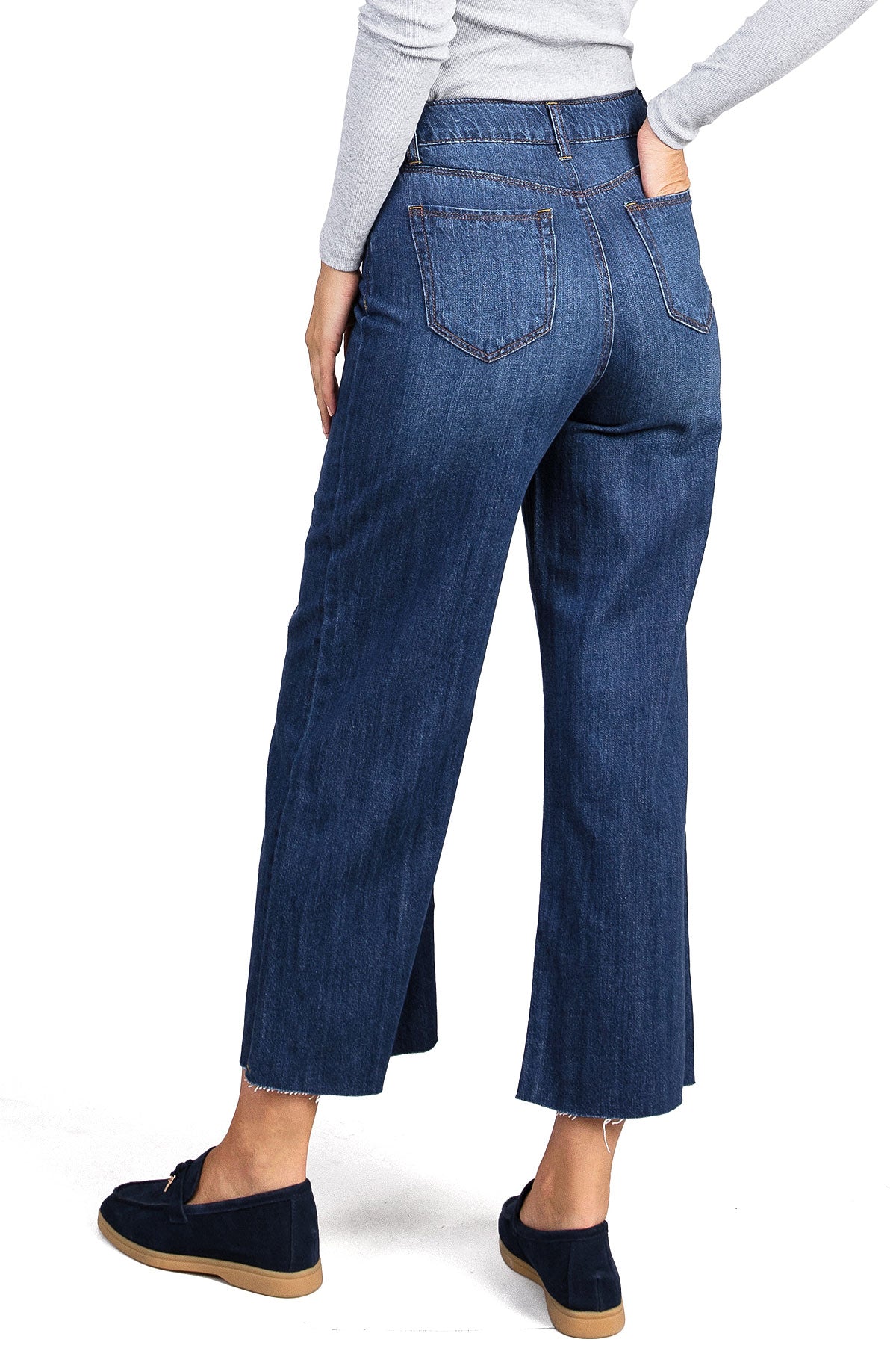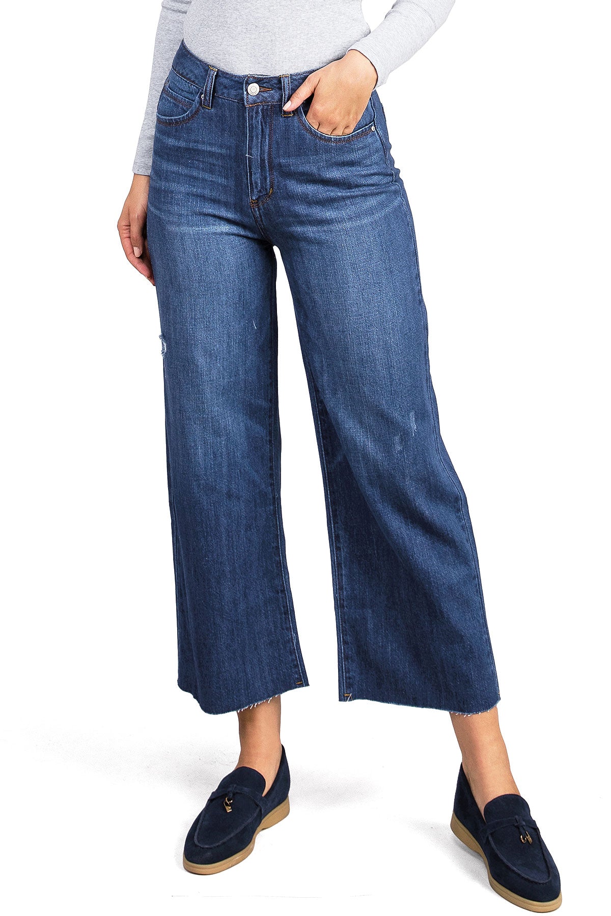 Cropped wide-leg gaucho denim pants with a high-rise fit with pockets on the front and back. Zipper fly and button closure. Pair with a bodysuit and heels for a cute and trendy look. No stretch in denim. Size up recommended!