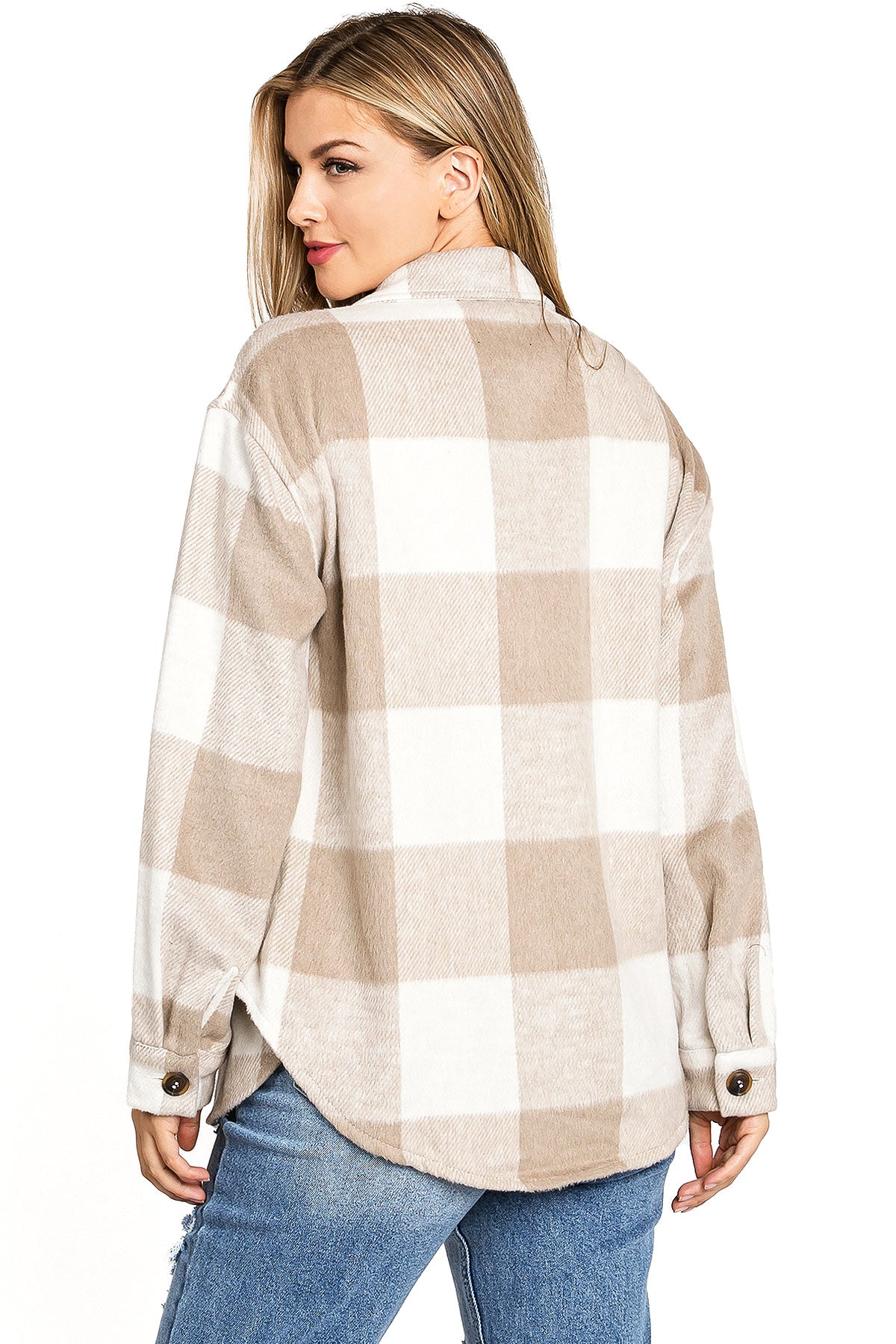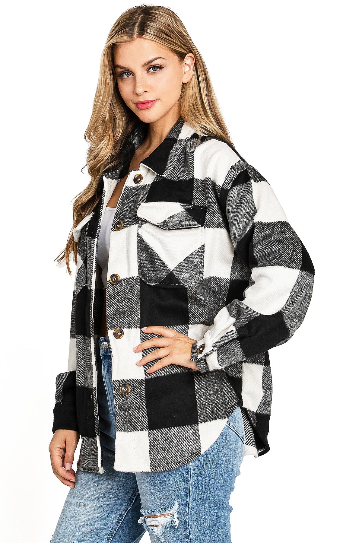 Trendy plaid coat with a classic button down closure with flap pockets on the chest. Cozy with an oversize fit, perfect for layering over any casual outfit!