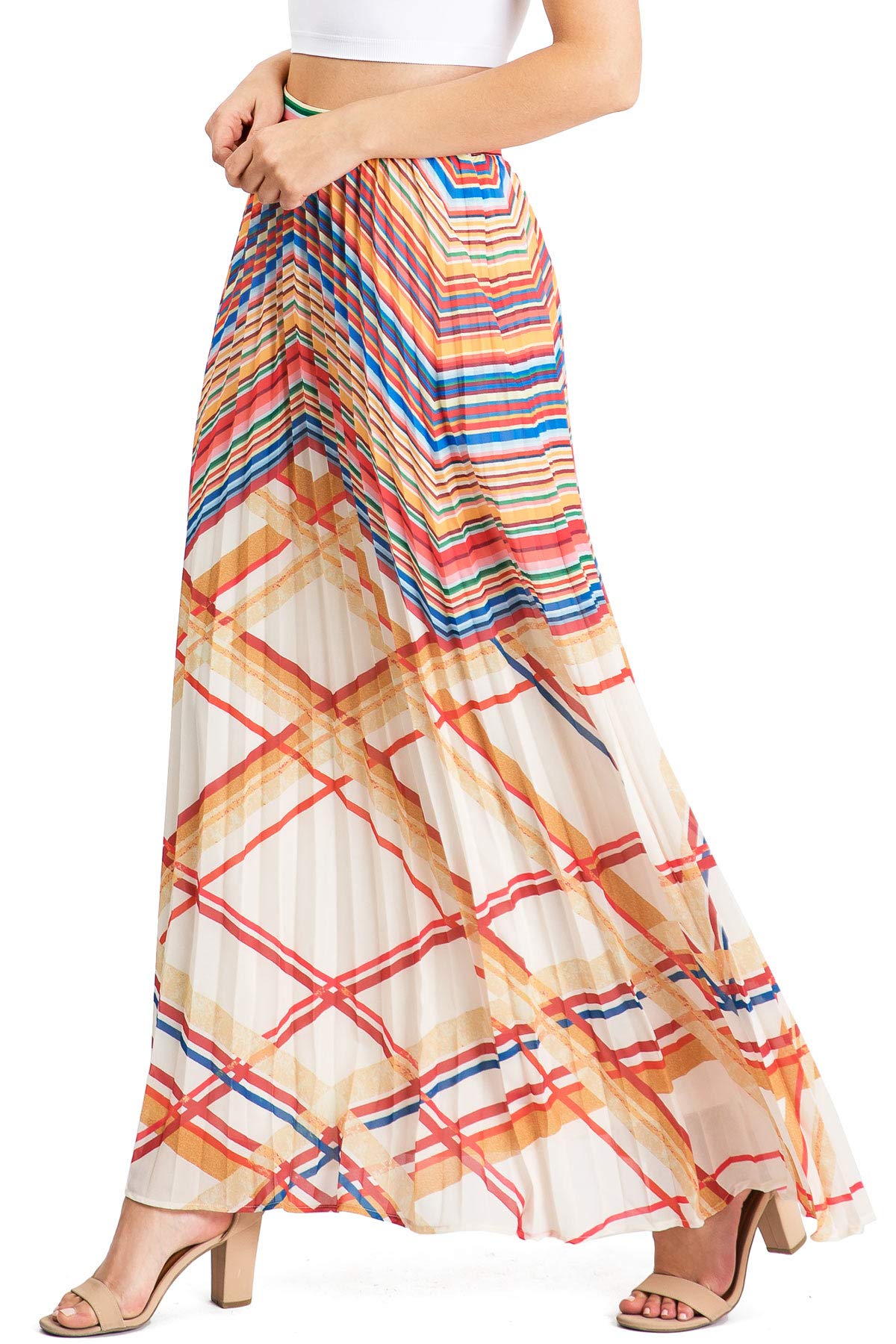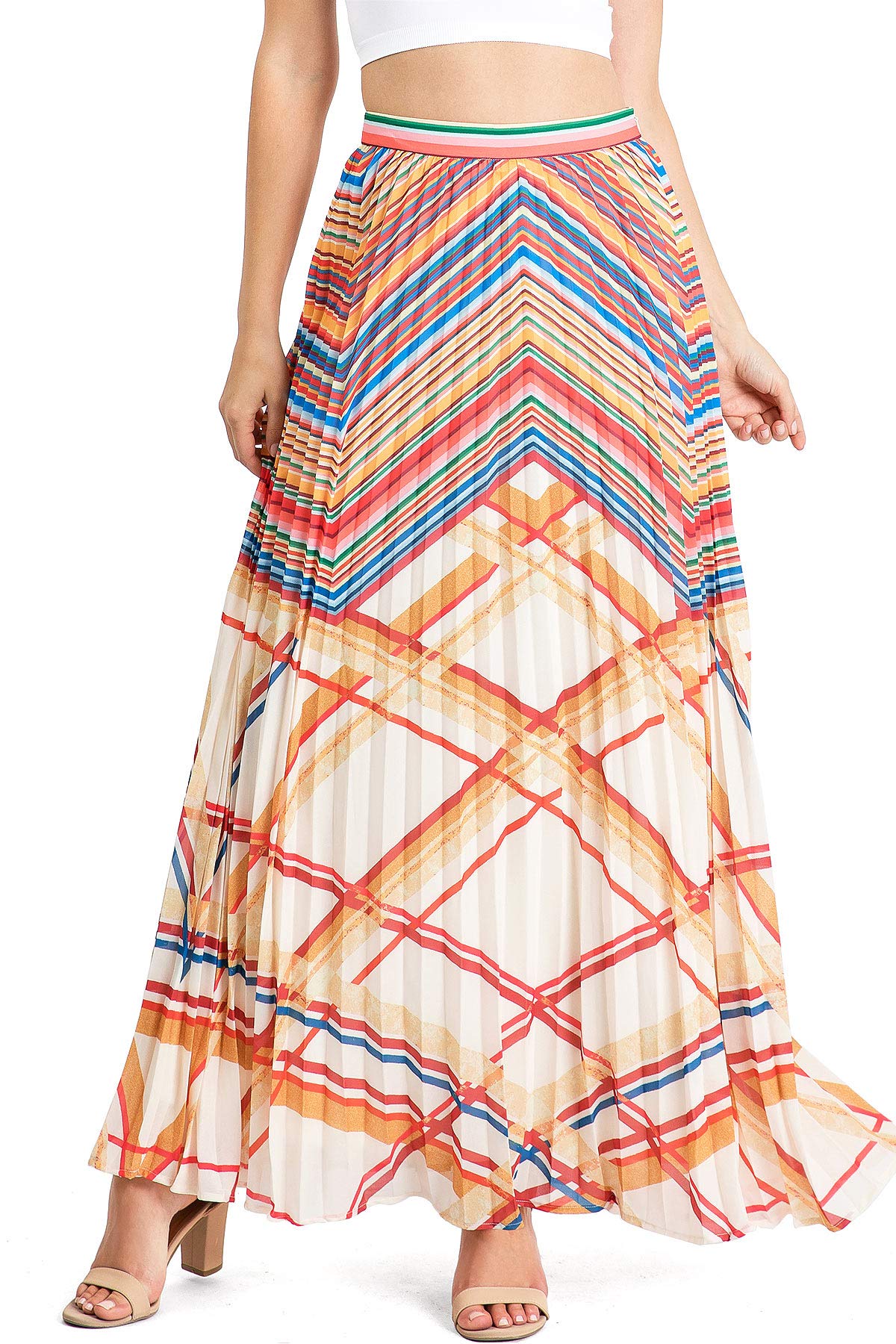 - Woven, pleated maxi skirt with a fitted high rise fit. Retro, geometric print. Looks great with a bodysuit or trendy crop top!