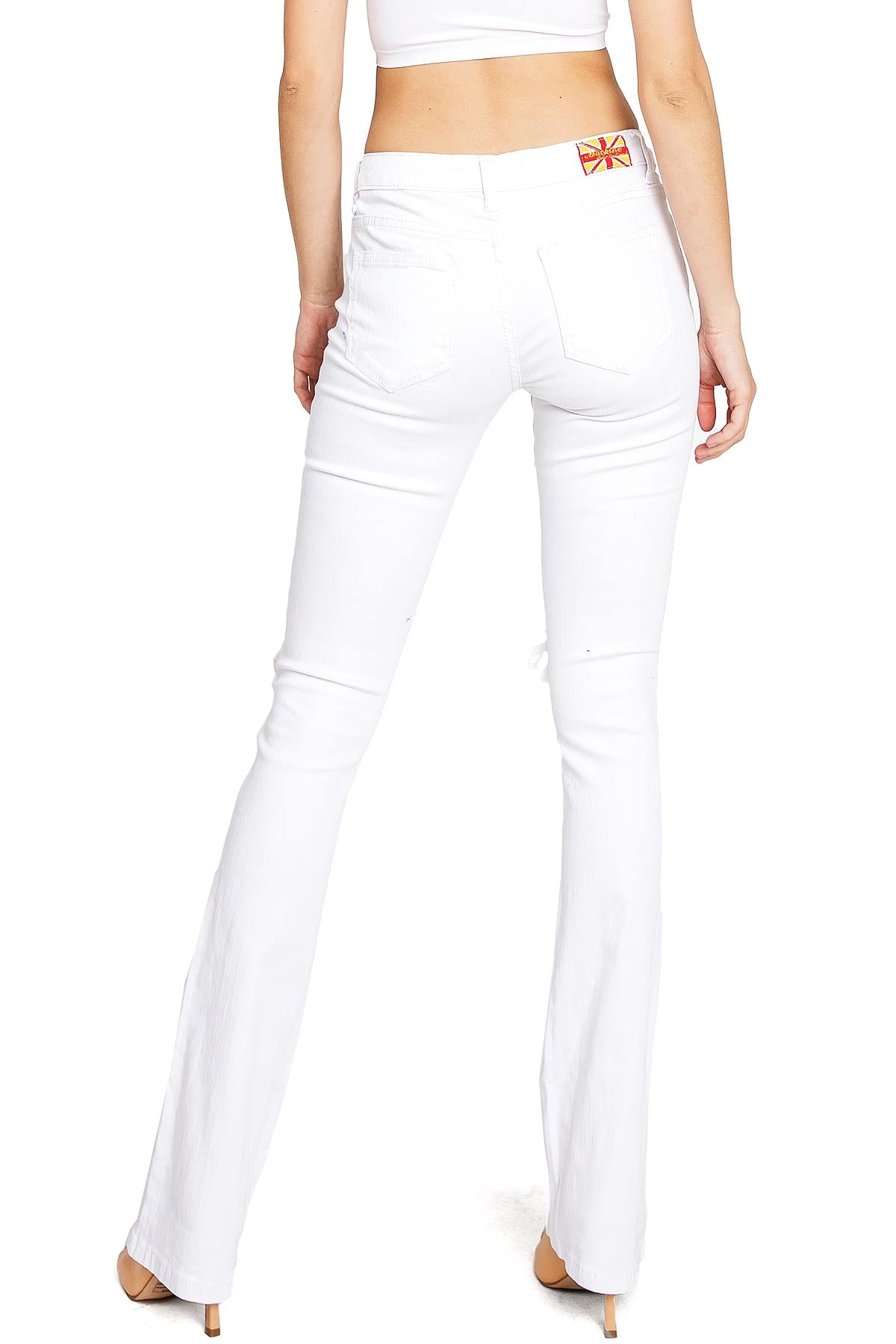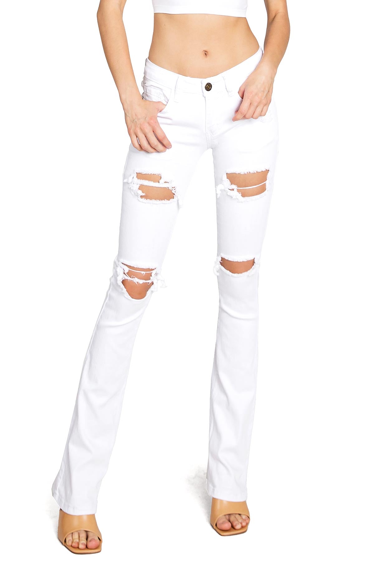 Low-rise bootcut jeans with a slim-fit and heavy distressing down the front and a classic button and zip fly closure. Slightly faded wash down the center with traditional 5 pocket construction.