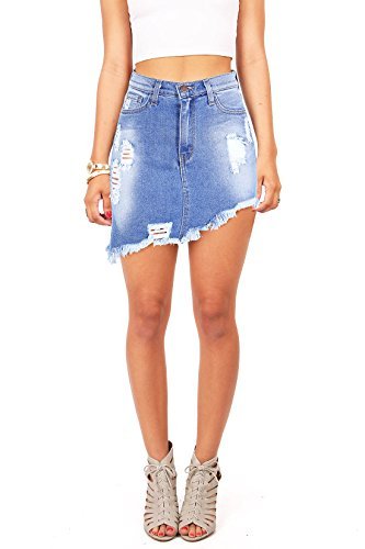 Denim pencil skirt with distressing and fraying at the edge. Button and zip fly closure with traditional five pockets. Pair with tees and wedges for a casual look or dress it up with a blouse and heels. Runs a bit tight with no stretch.