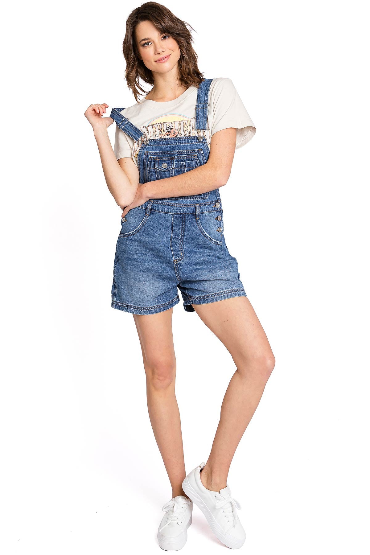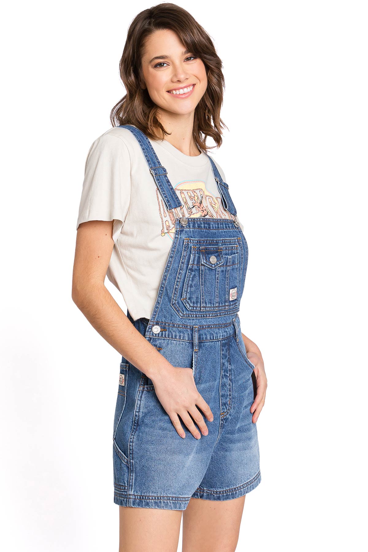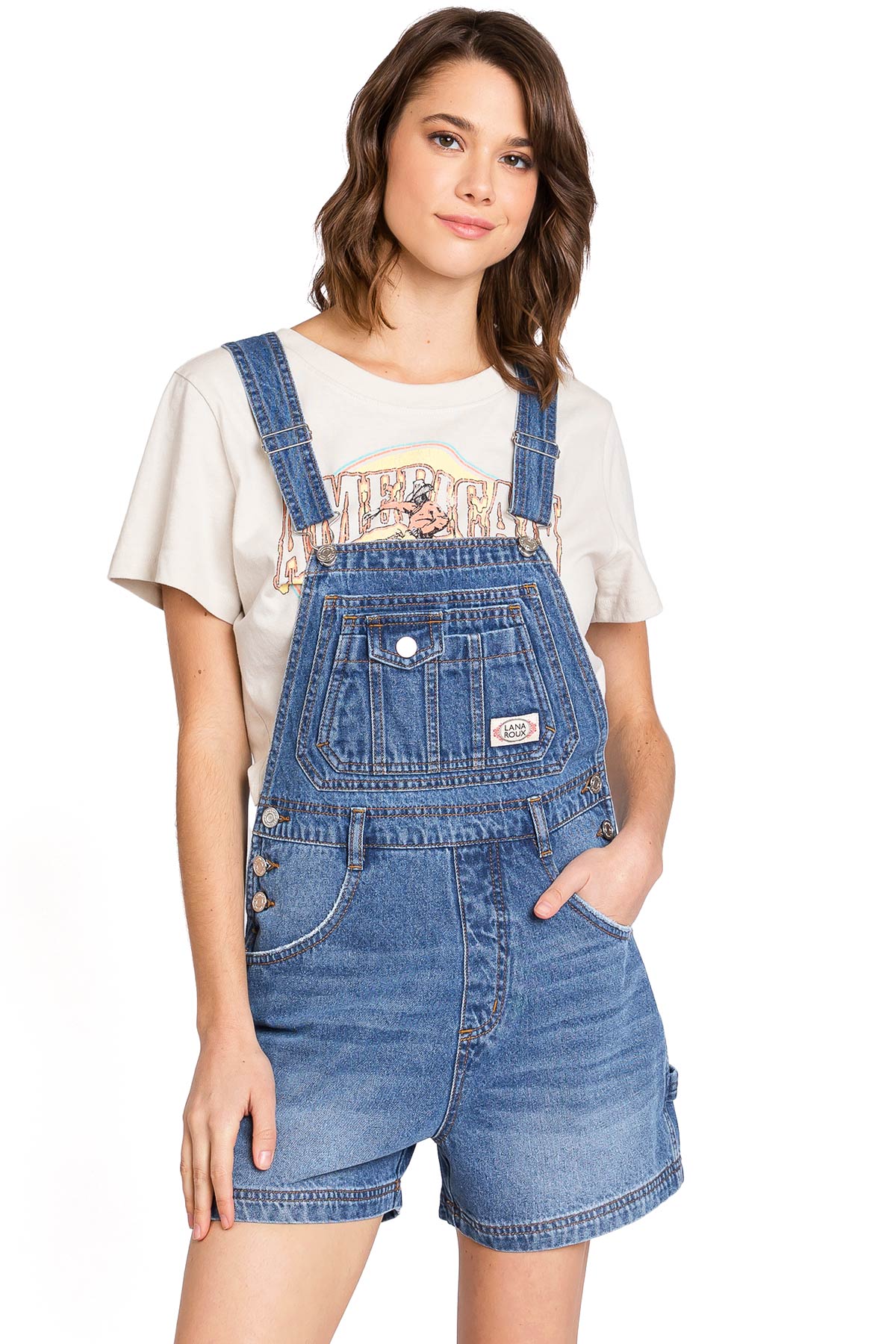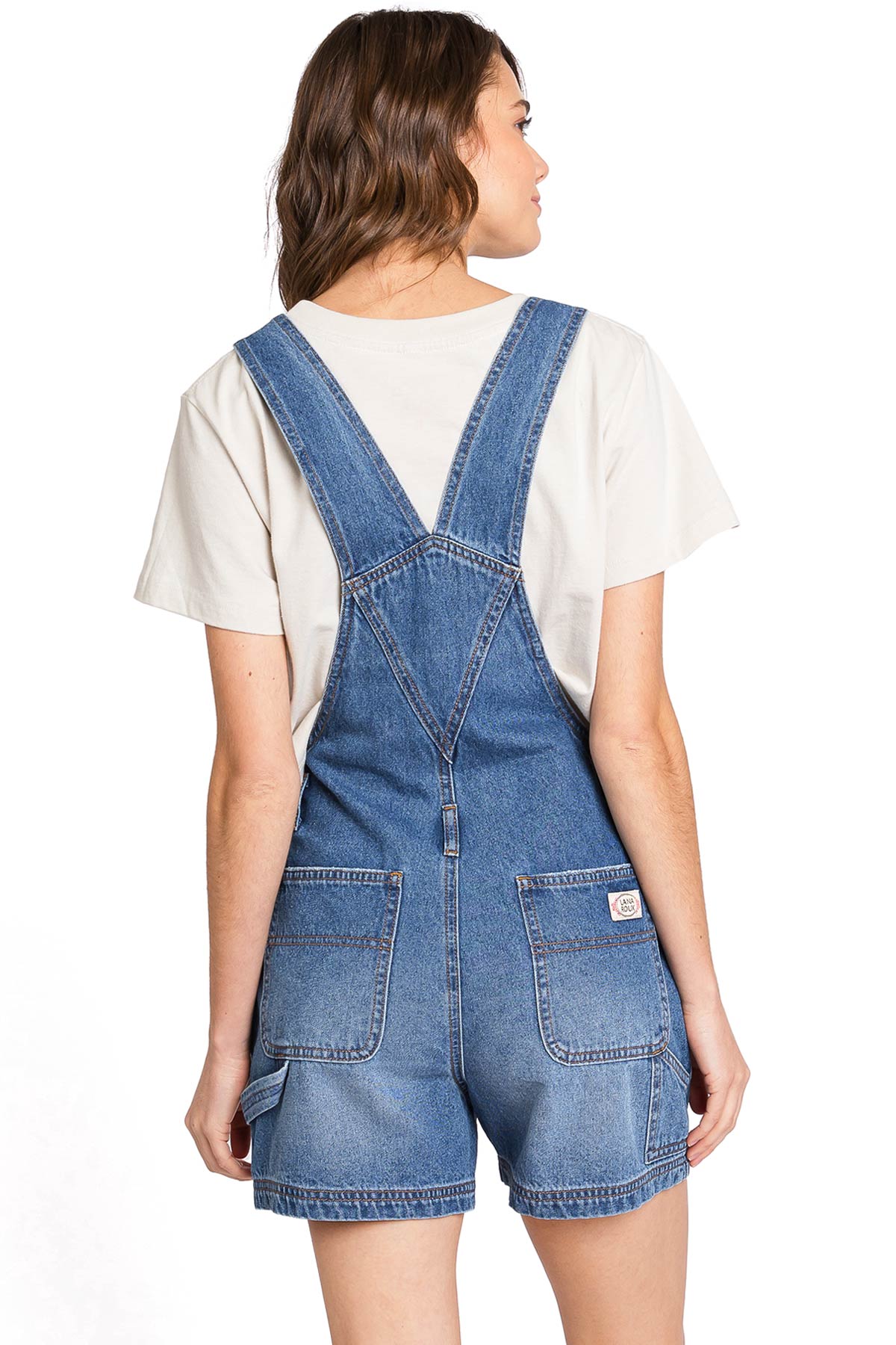 Short, bib-and-brace overalls with a 90s inspired silhouette. Adjustable, thick racerback straps connect to a functional, multi-pocket bib with a Lana Roux logo patch. High cut, rigid waist with button closures on both sides. Relax fit, with a 5-pocket construction and tool loop detail.