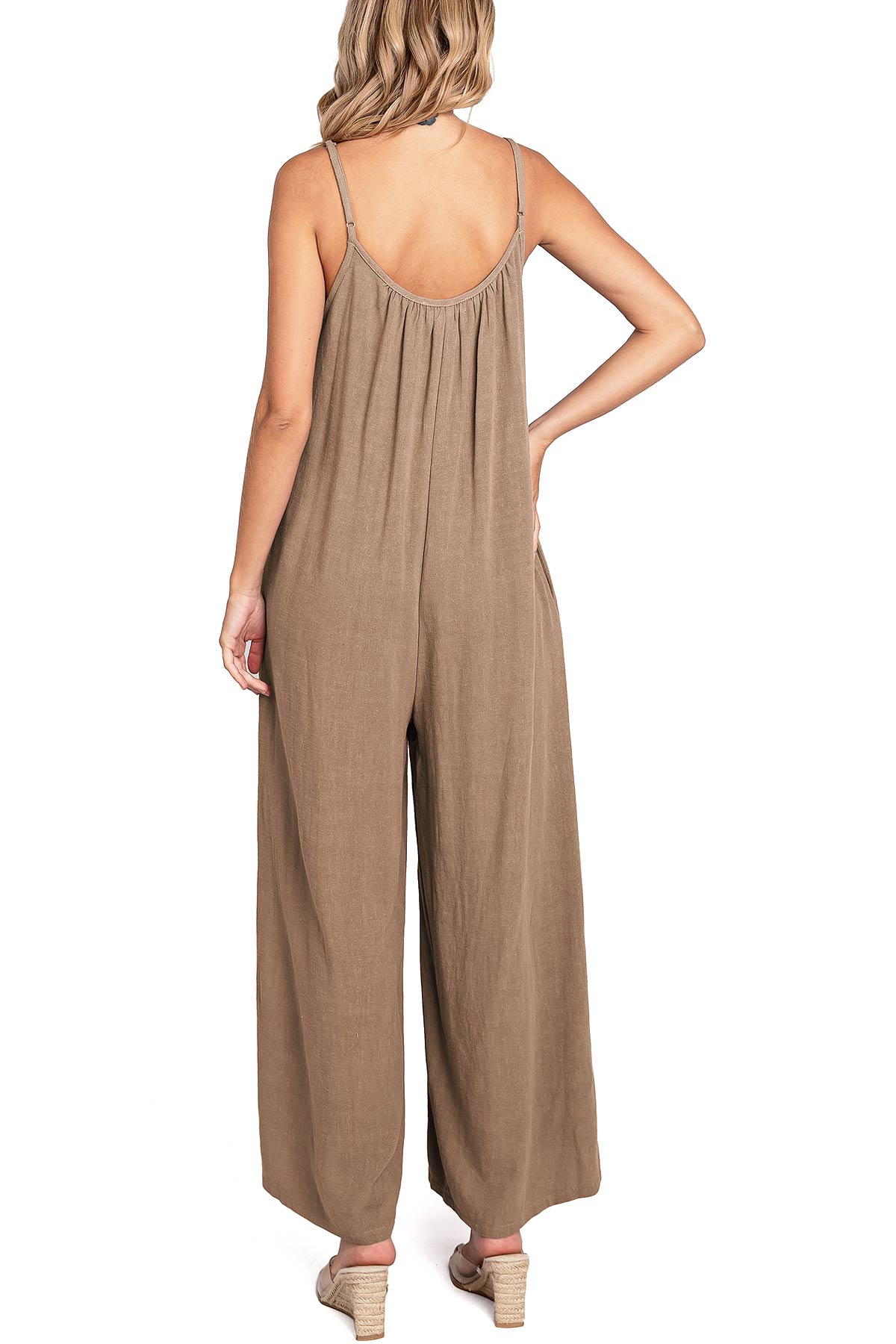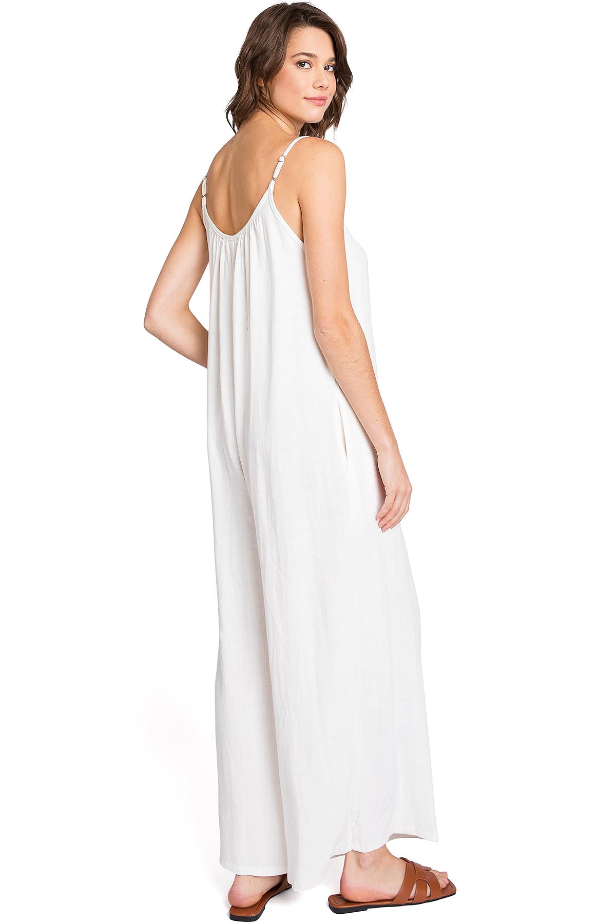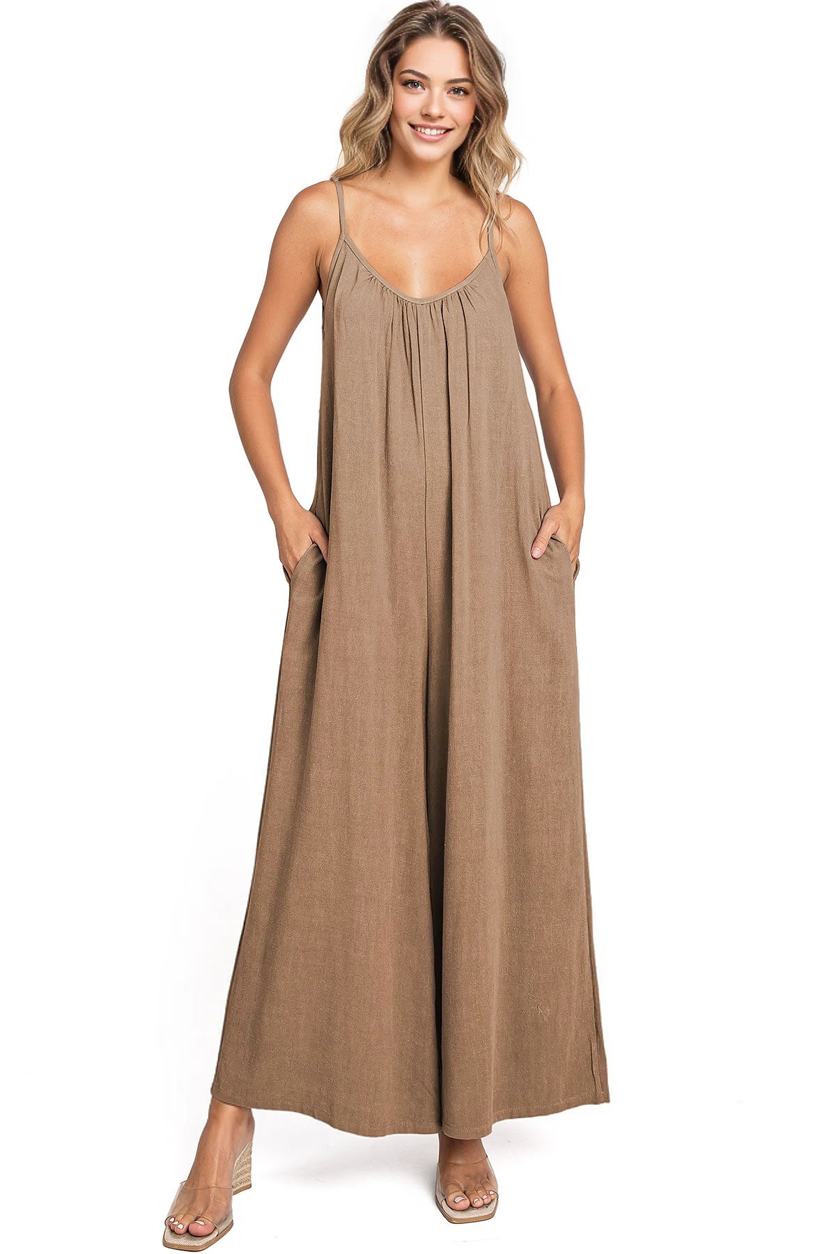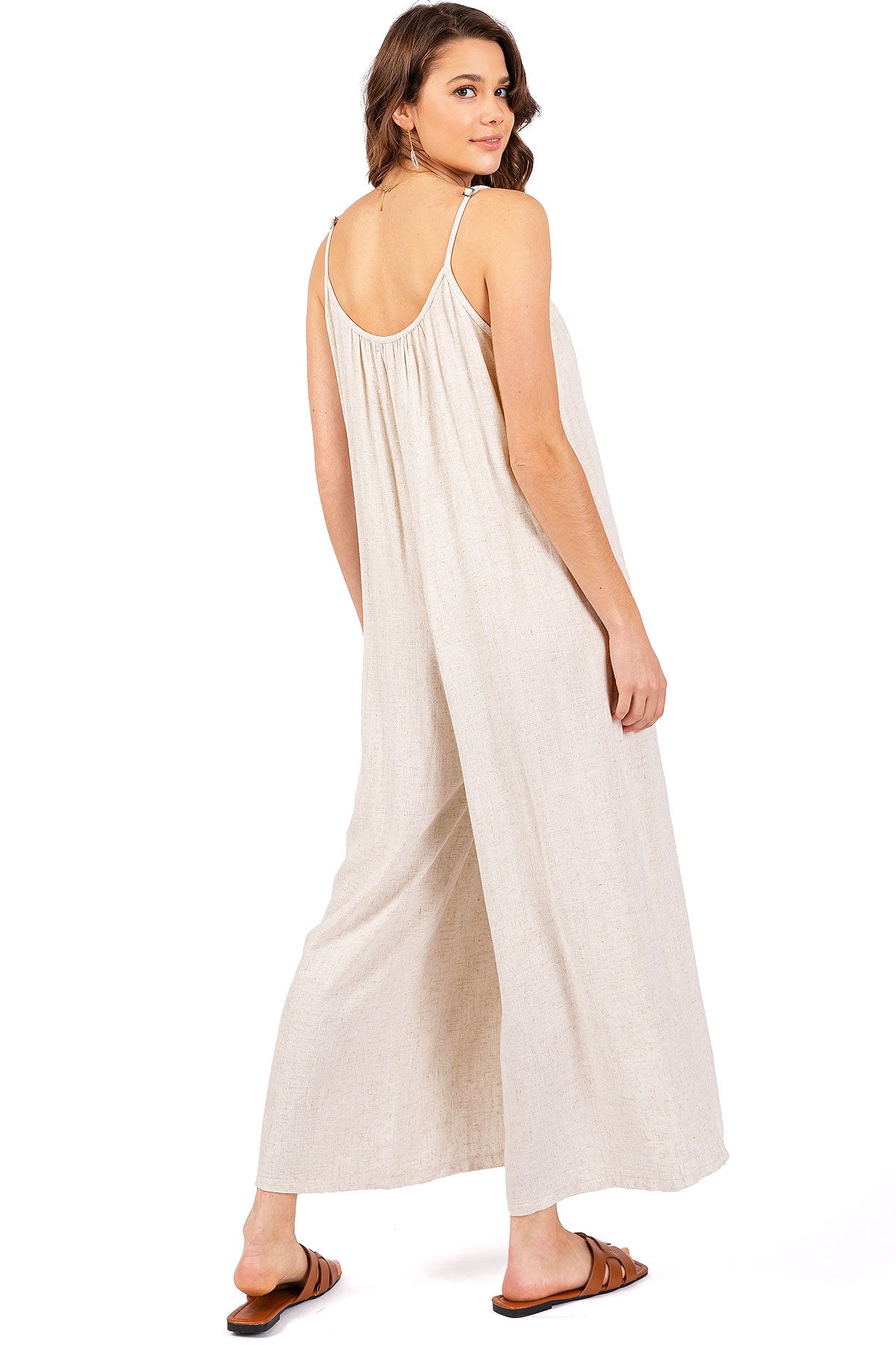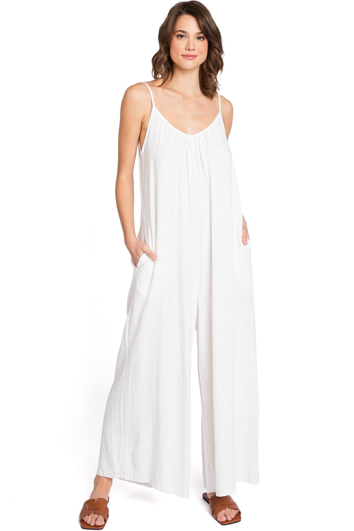 Casual linen jumpsuit with a scoop neckline and and adjustable cami straps. Loose and oversized silhouette with a cropped length and side-seam pockets on the hips.