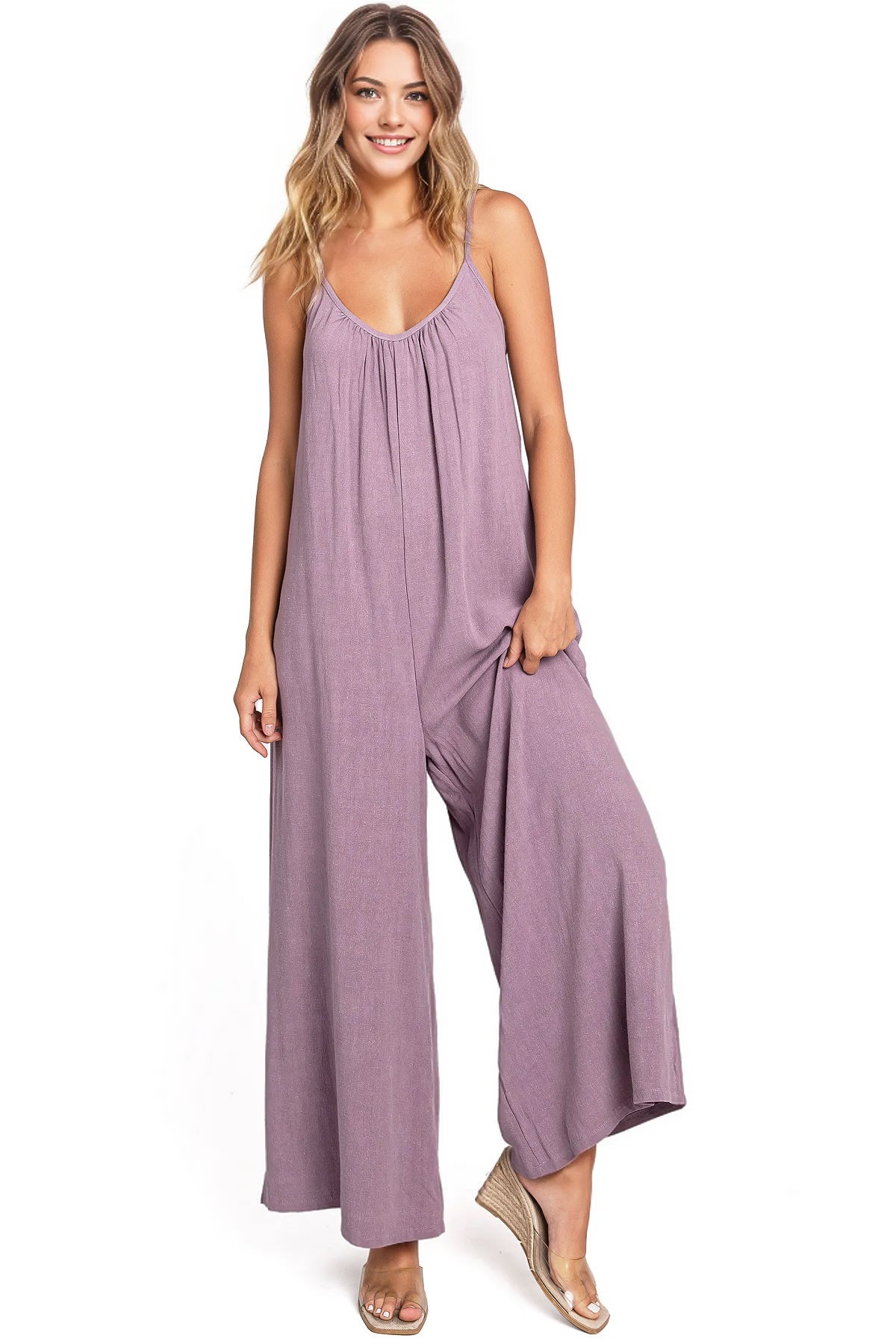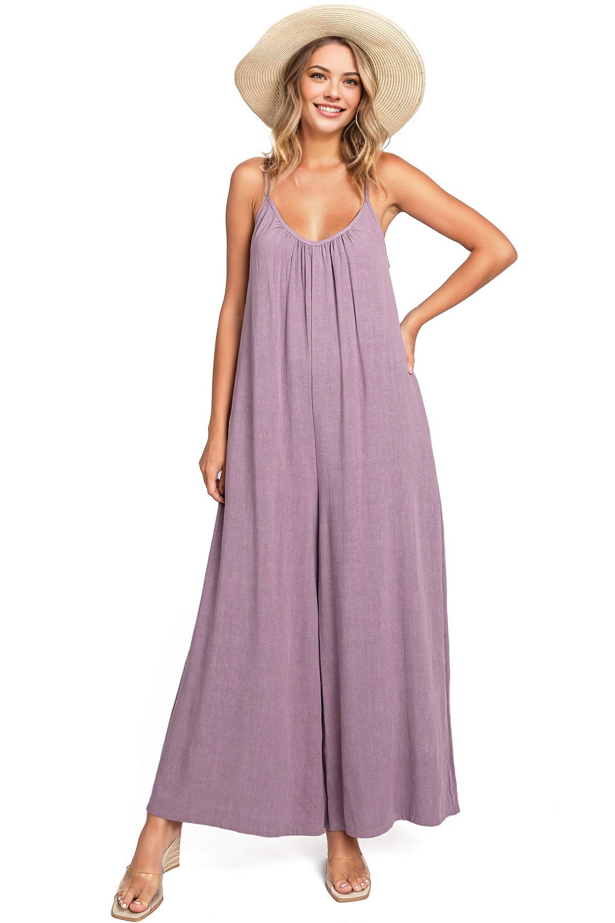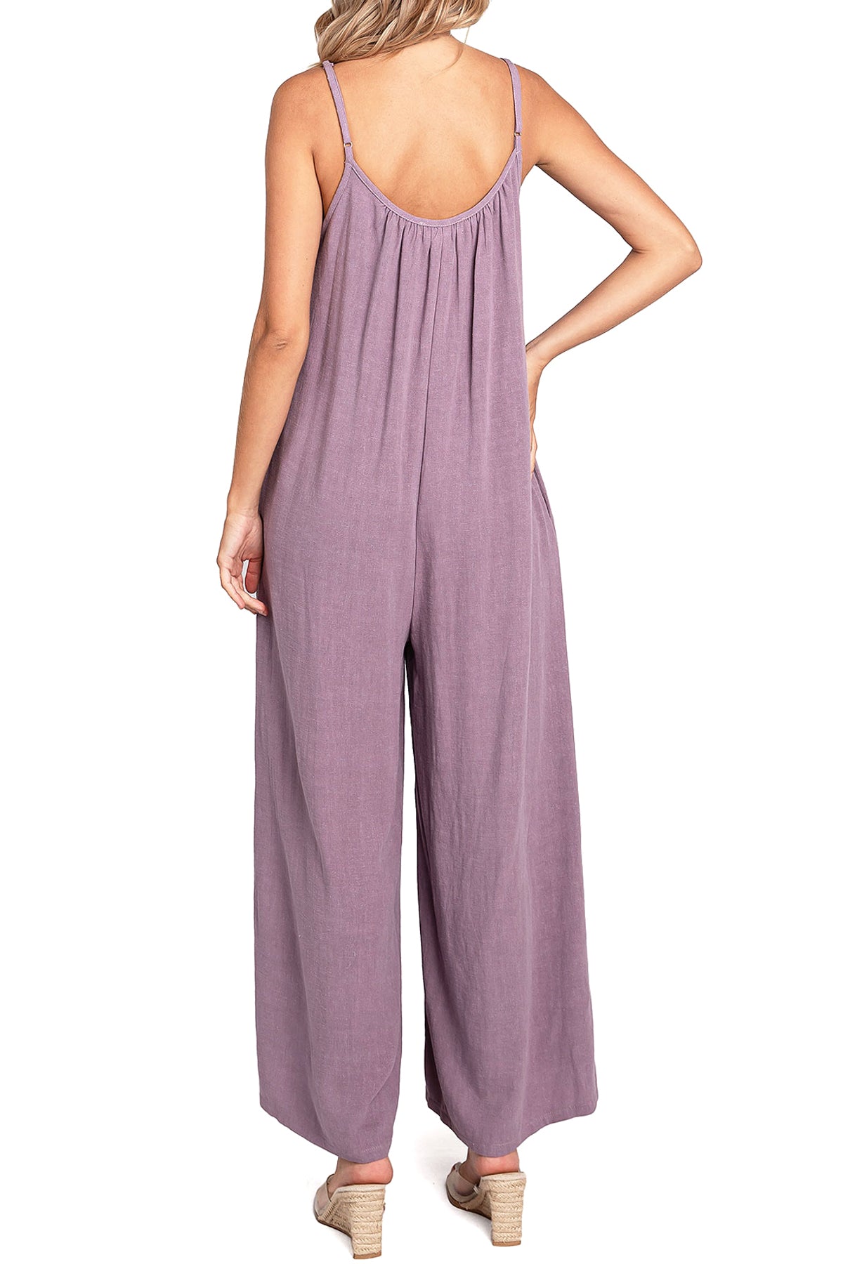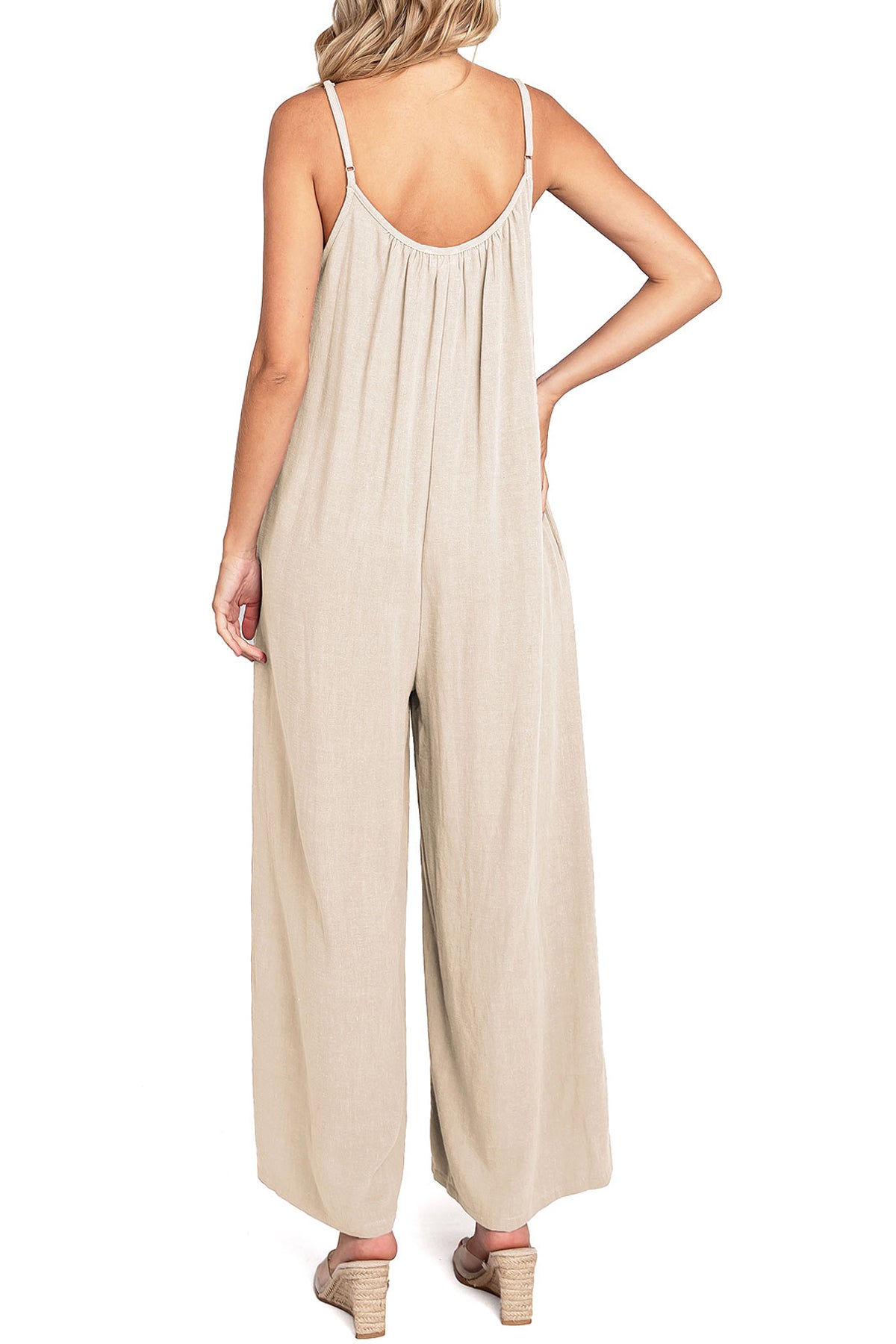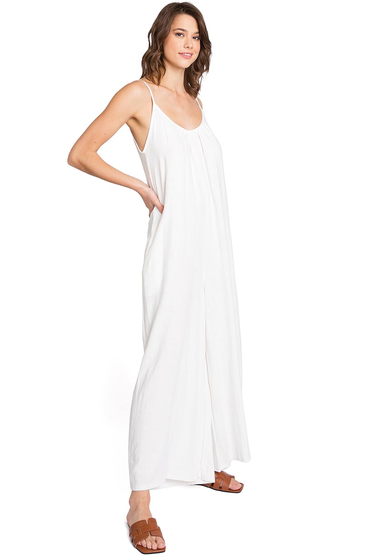 Casual linen jumpsuit with a scoop neckline and and adjustable cami straps. Loose and oversized silhouette with a cropped length and side-seam pockets on the hips.