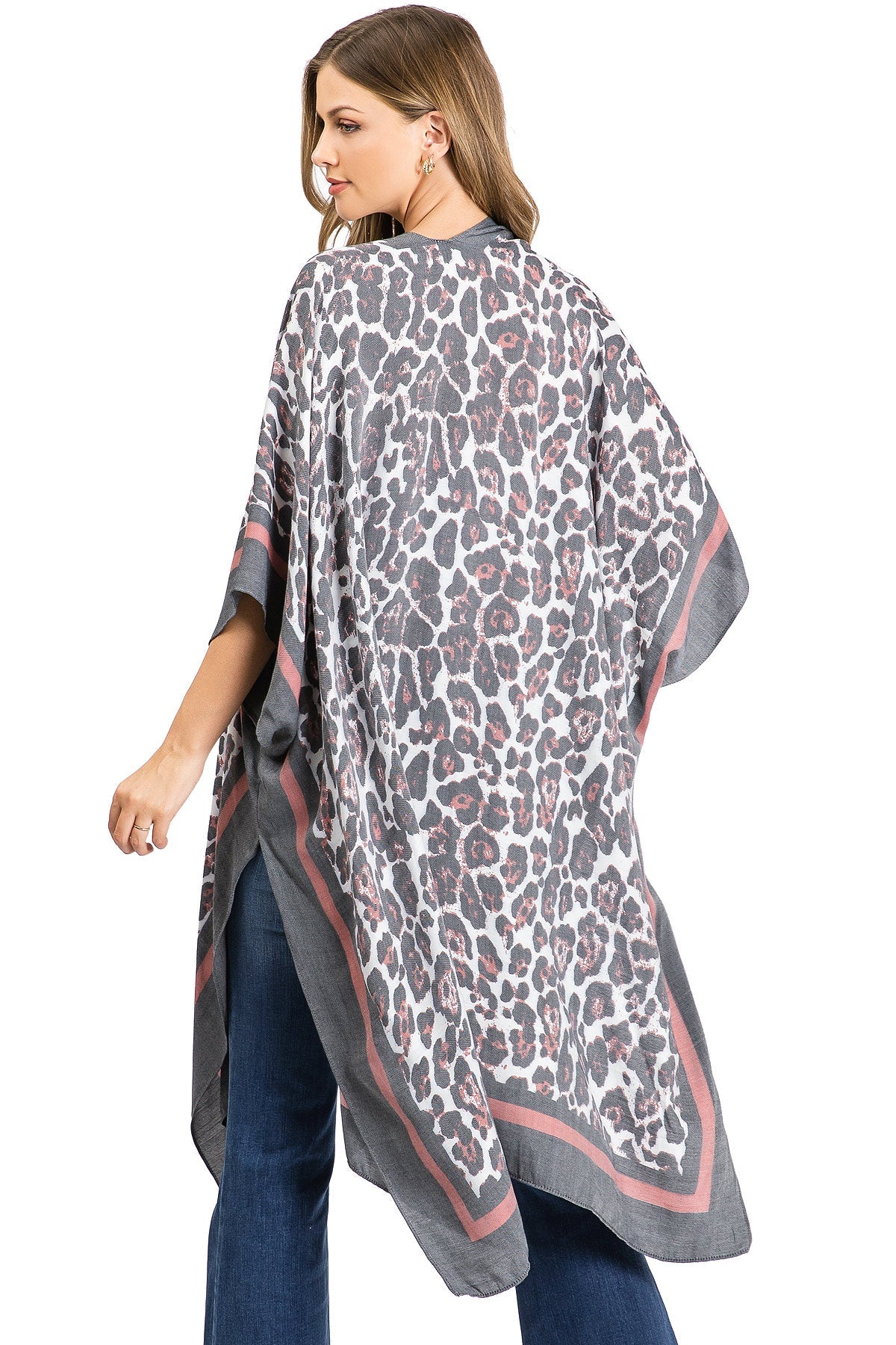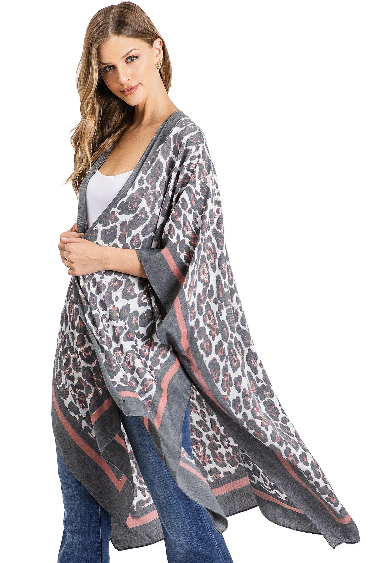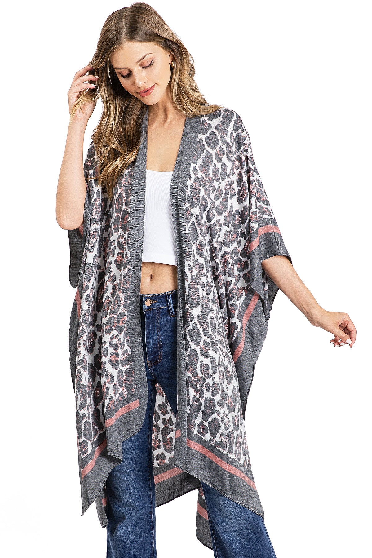 Bold leopard printed cardigan with an open-front kimono silhouette. Light fabric is great for layering over casual outfits or as a cover-up.