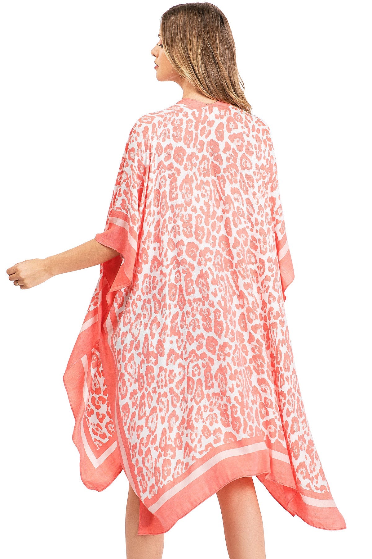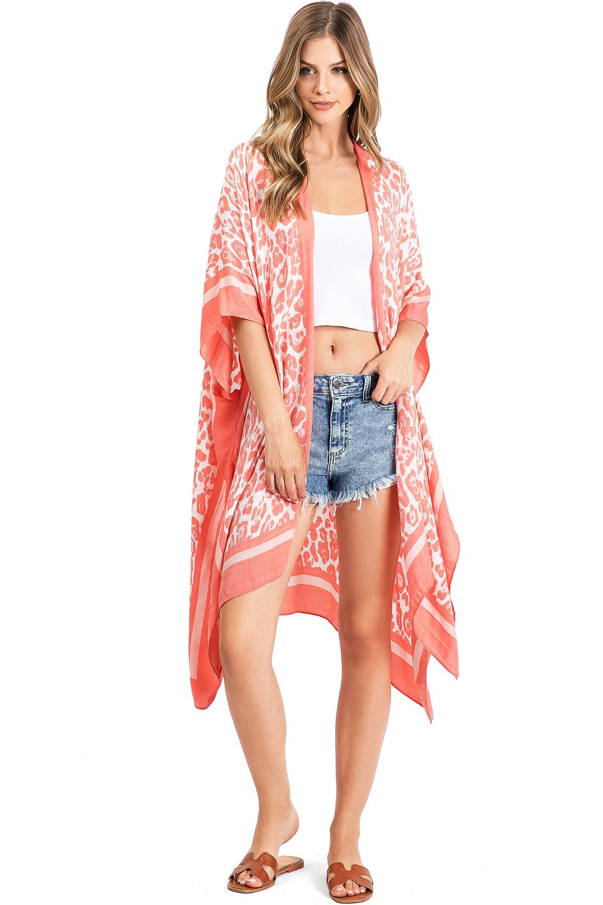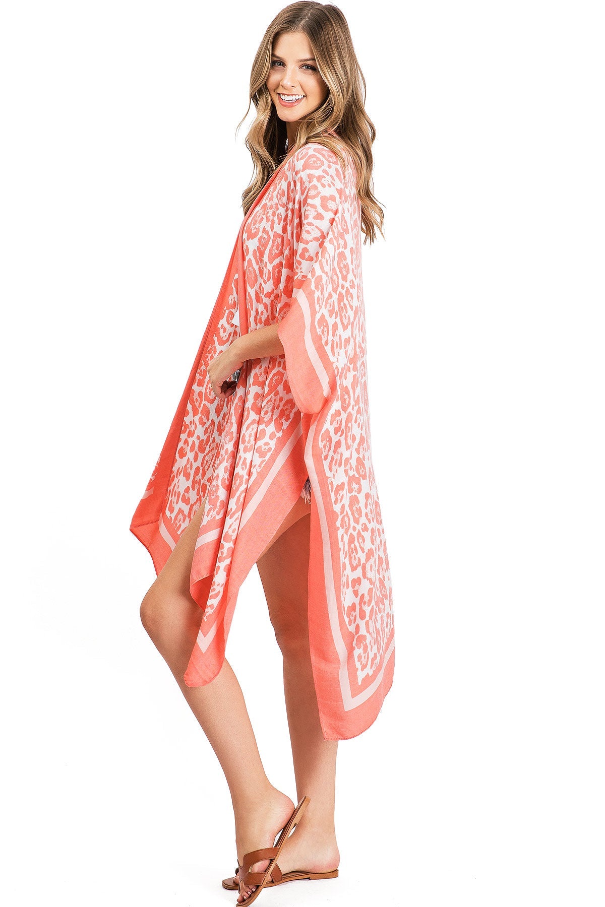 Bold leopard printed cardigan with an open-front kimono silhouette. Light fabric is great for layering over casual outfits or as a cover-up.