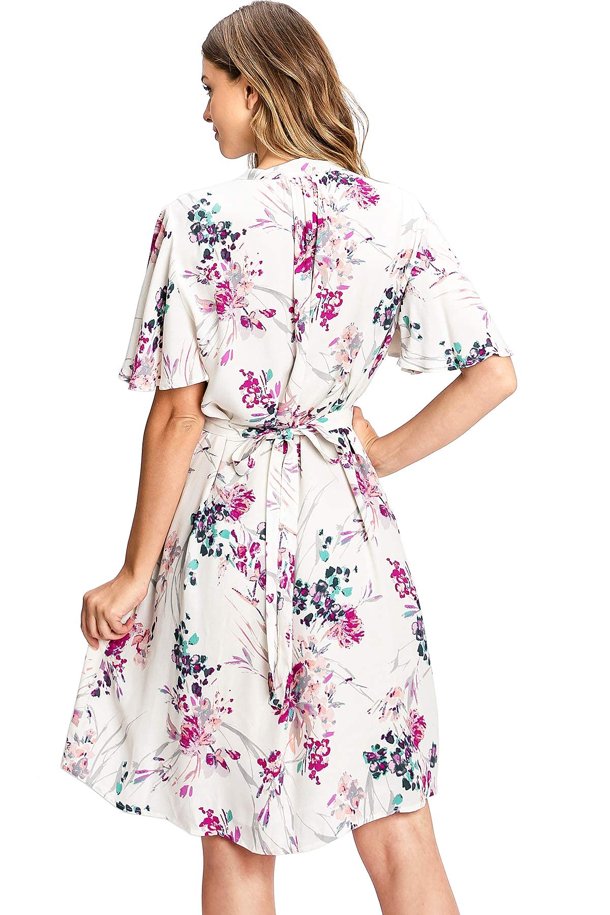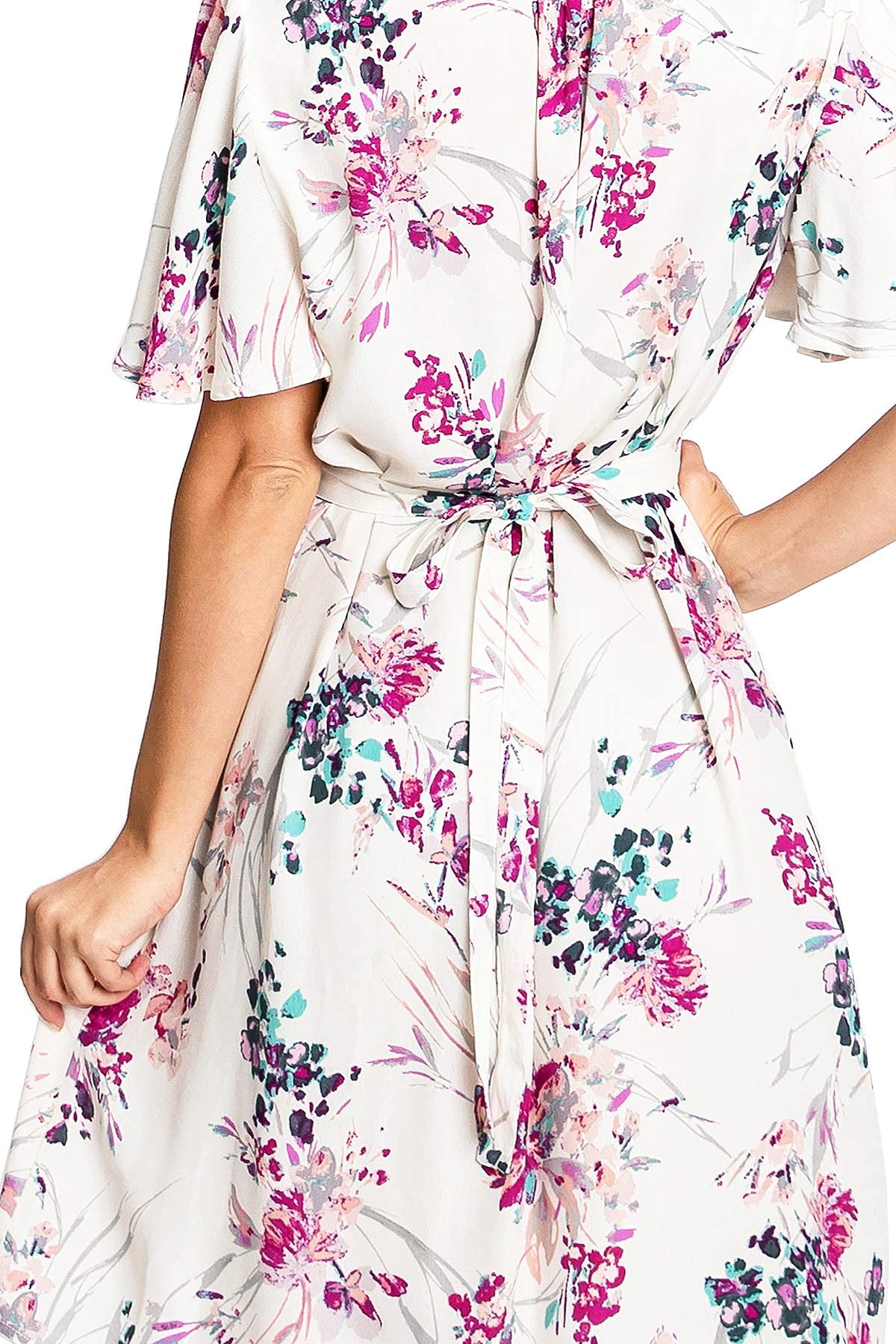 Feminine, floral dress with a flat-collar V-neckline and short flutter sleeves. Flowy silhouette with a self-tie belt at the waist that can adjust the fit. Knee length with pockets on the sides. Nude slip lining included underneath.
