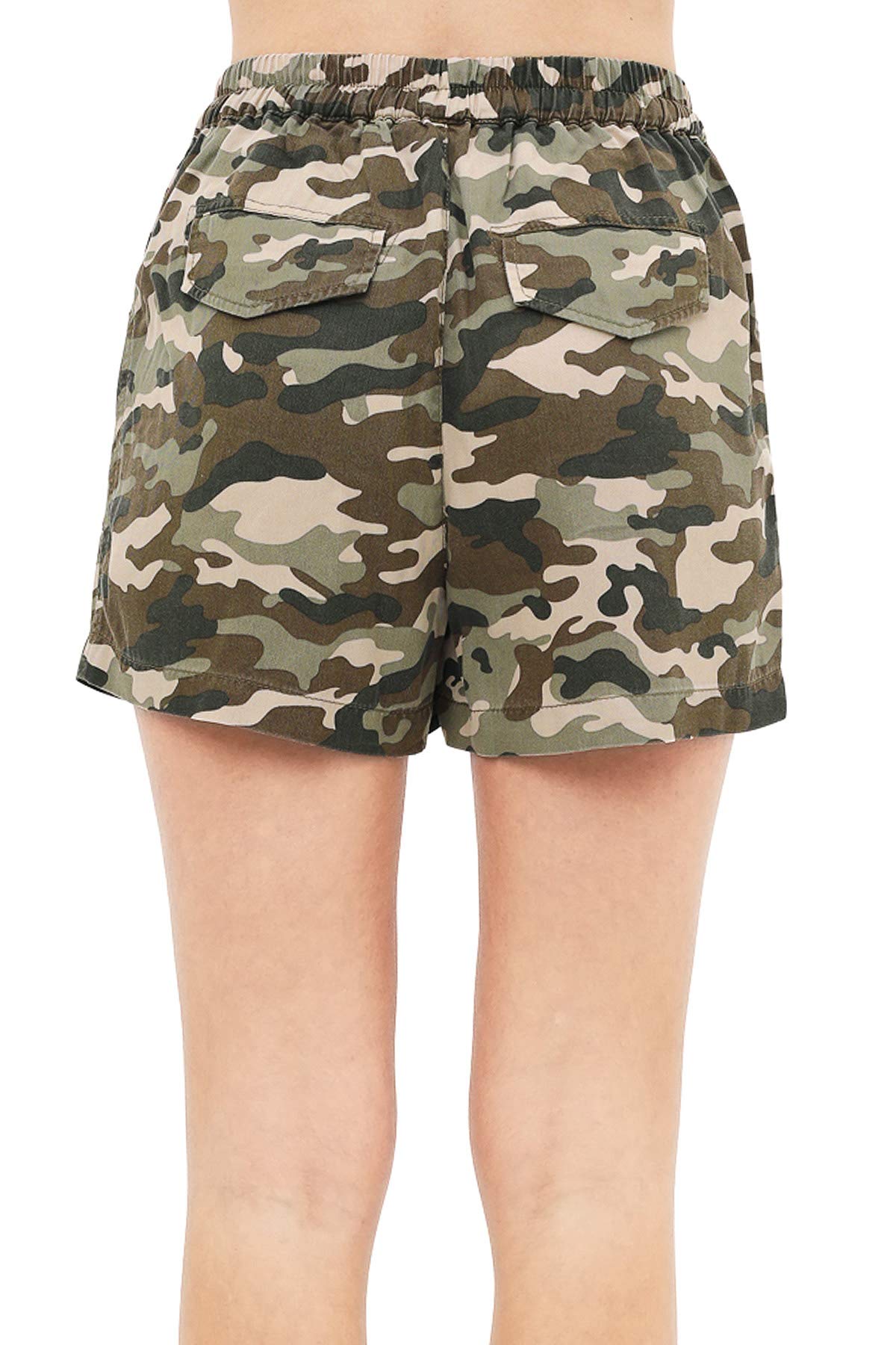 High rise woven shorts featuring a thick elasticized, drawstring waist. Front pork chop style pockets and a cuffed hem. Light fabric with a relaxed and comfortable fit, for every day wear.