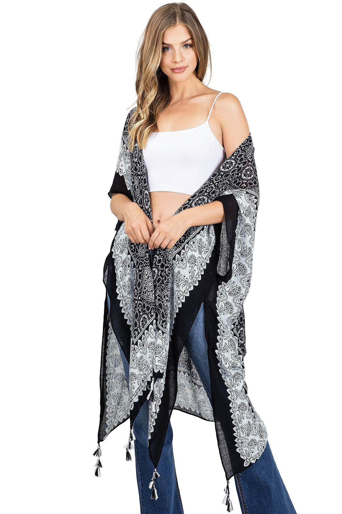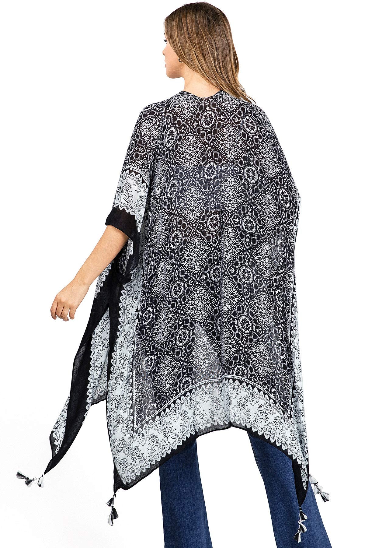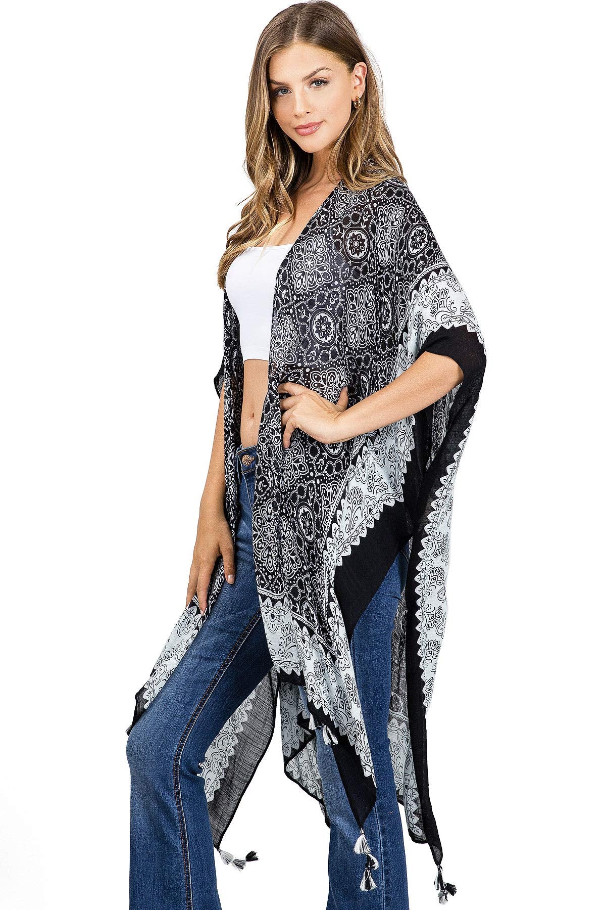 Kimono cardigan with an open-front silhouette and small tassel details on the ends. Light thin fabric with a trendy bohemian print, perfect for layering over casual outfits or using as a cover-up.