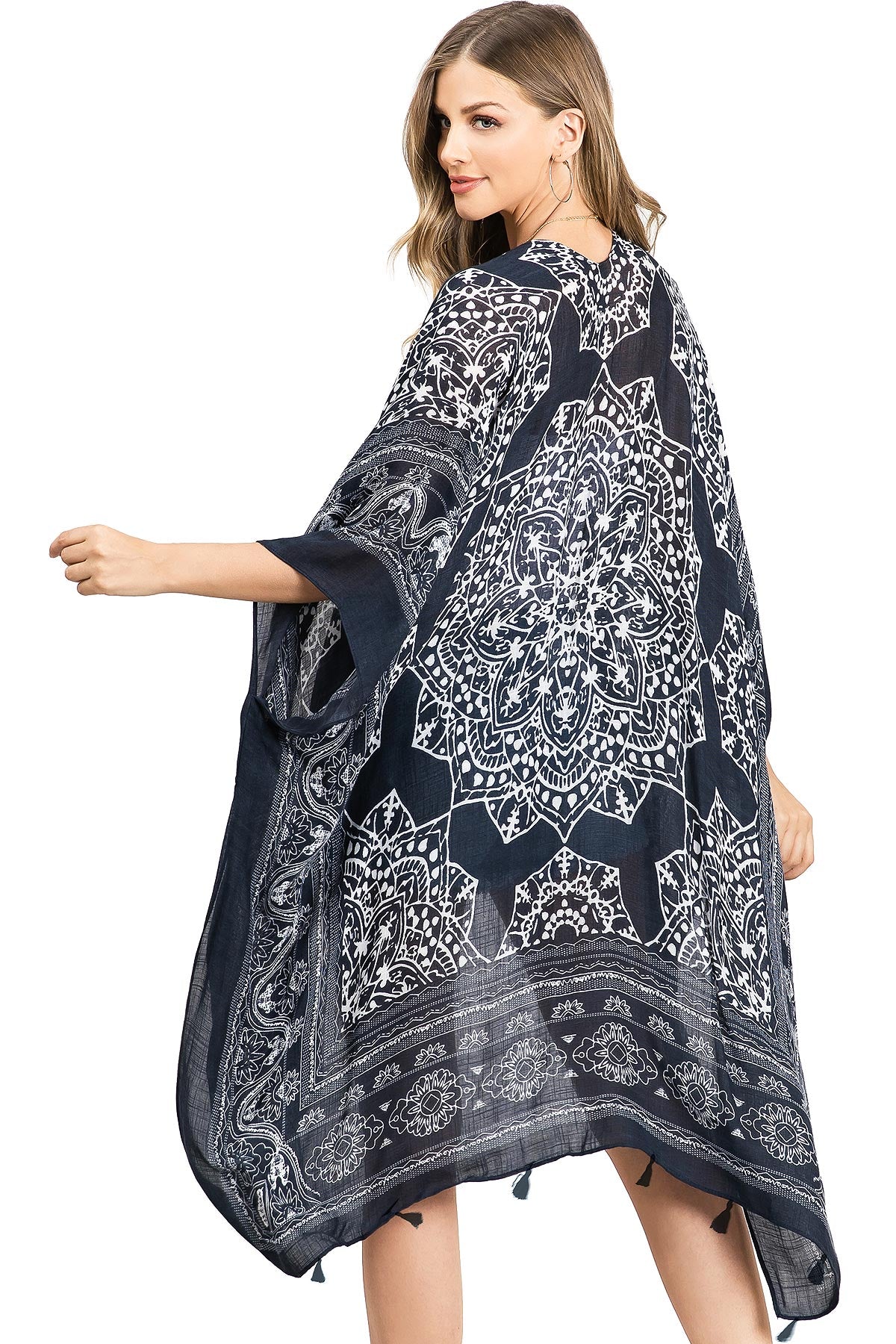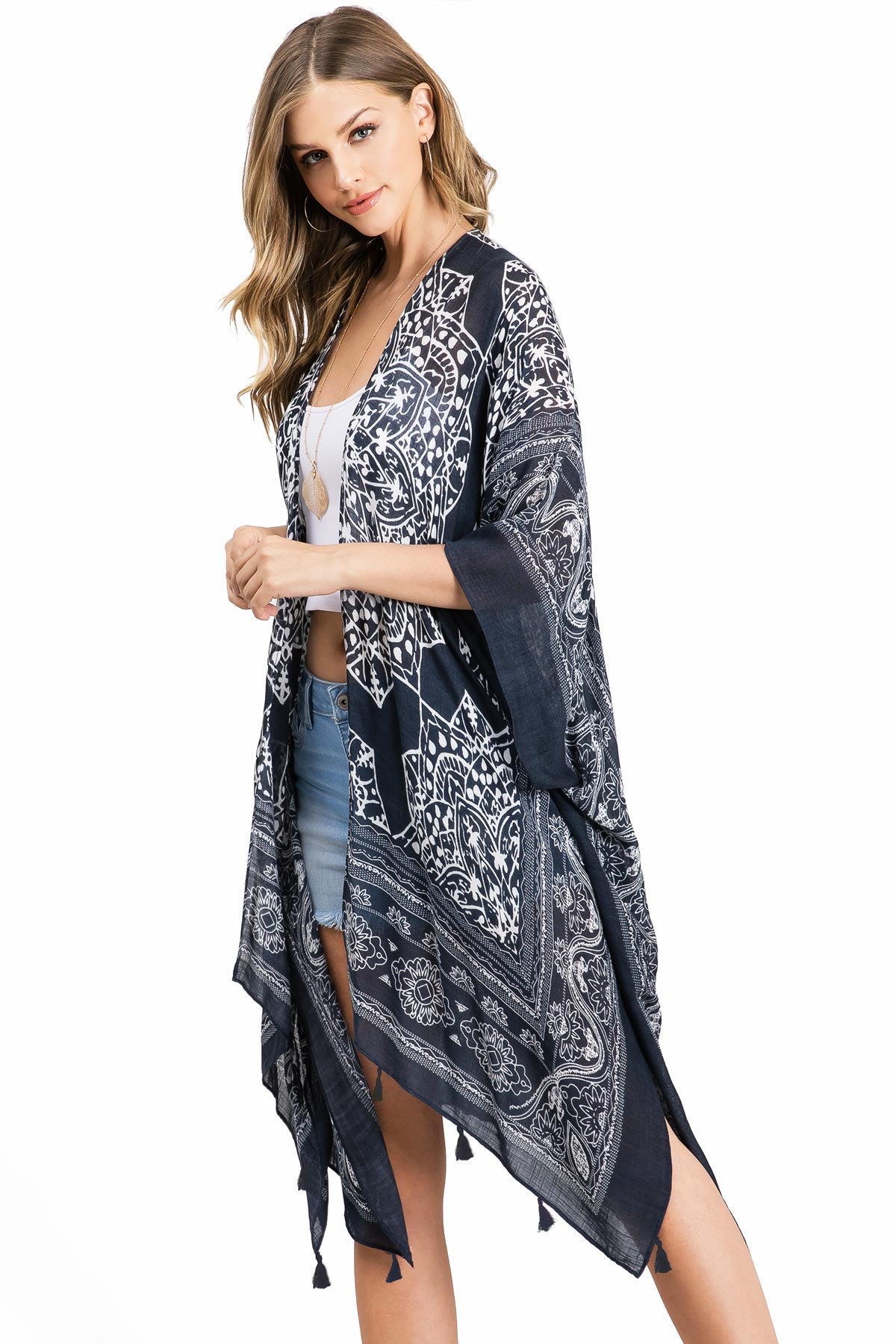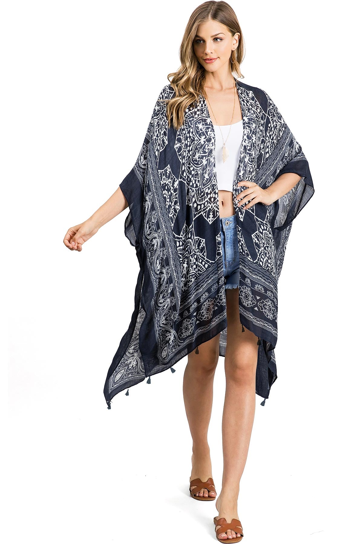 Semi sheer, printed kimono cardigan a small tassel trim along the bottom edge. Light, thin fabric is great for layering over casual outfits or as a swimsuit cover-up.