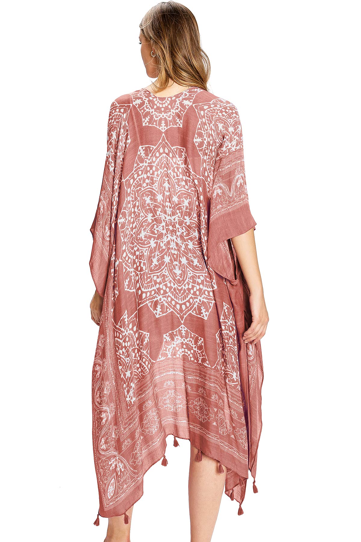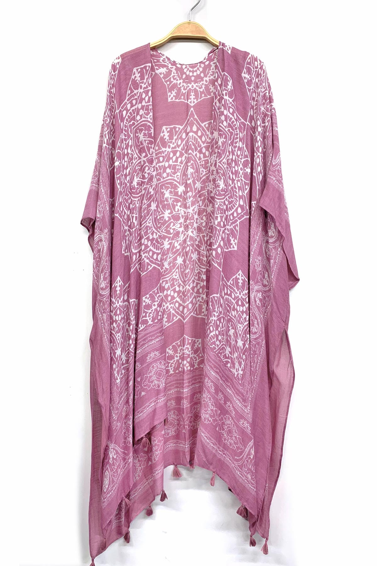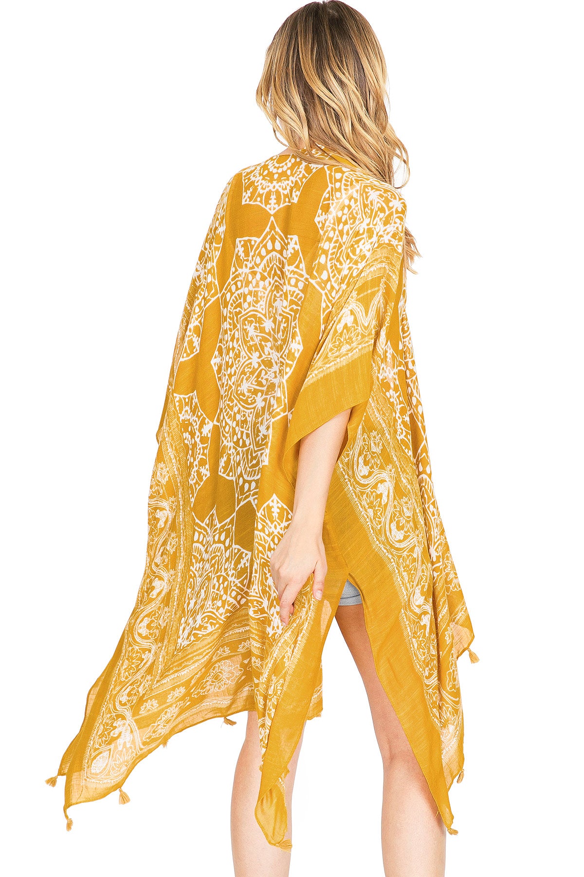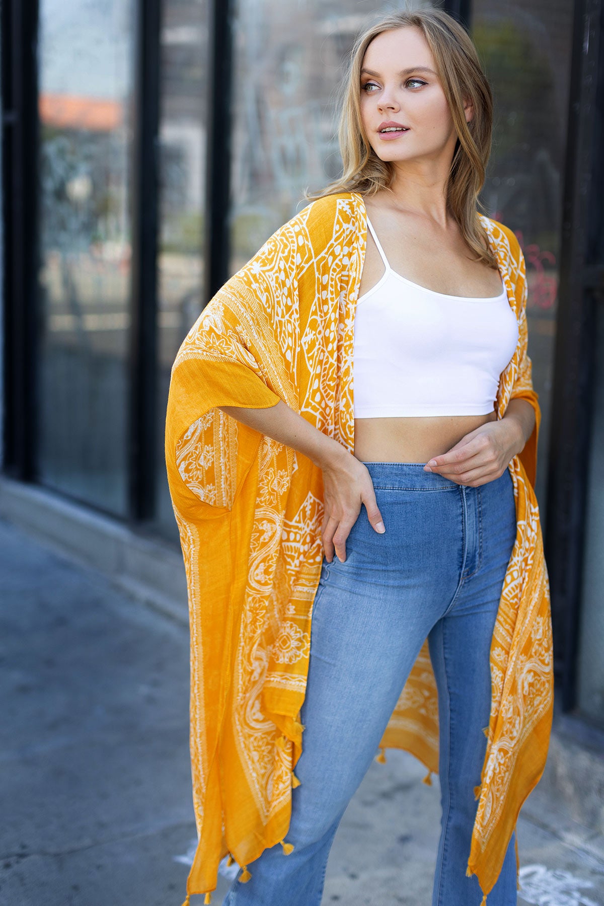Semi sheer, printed kimono cardigan a small tassel trim along the bottom edge. Light, thin fabric is great for layering over casual outfits or as a swimsuit cover-up.