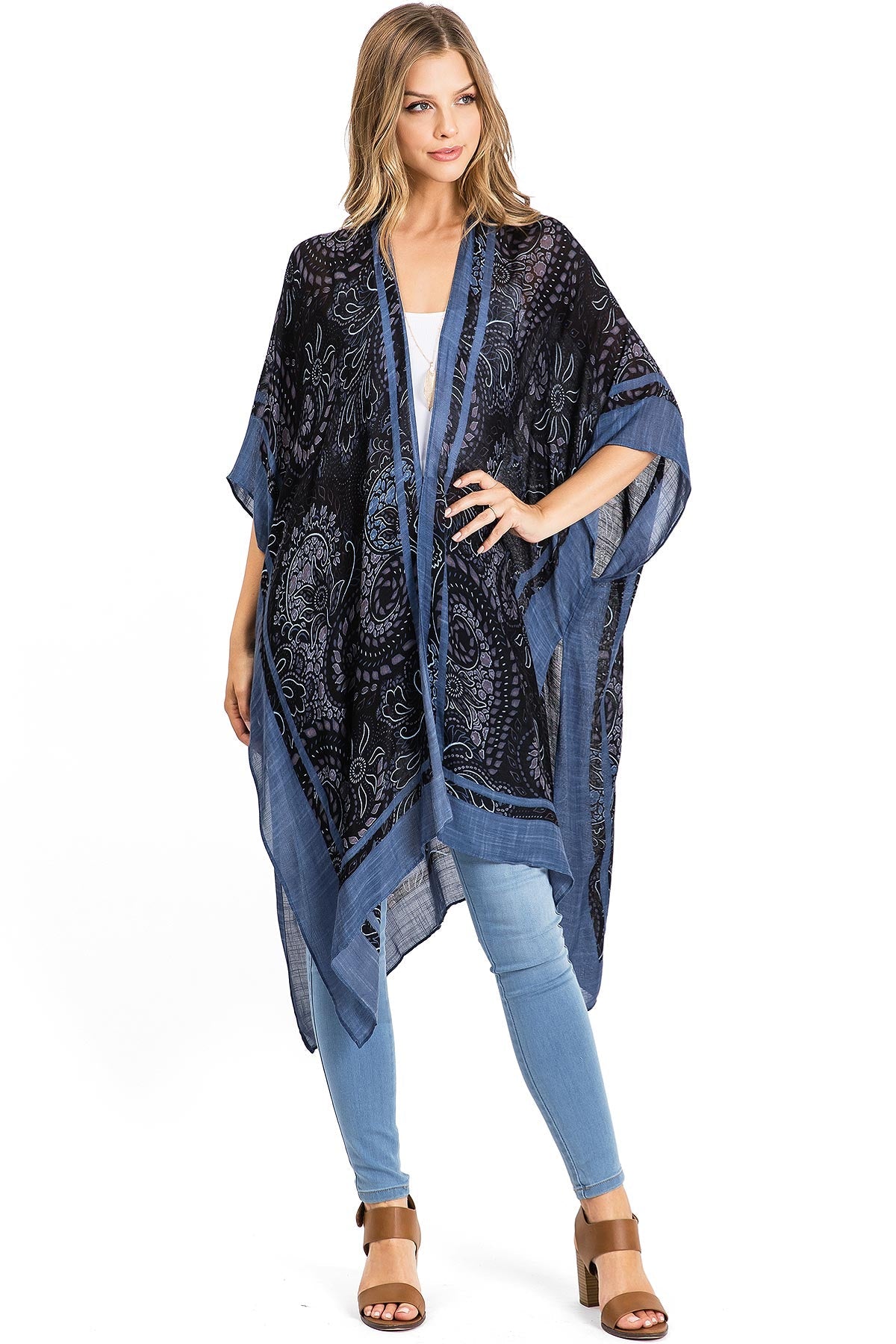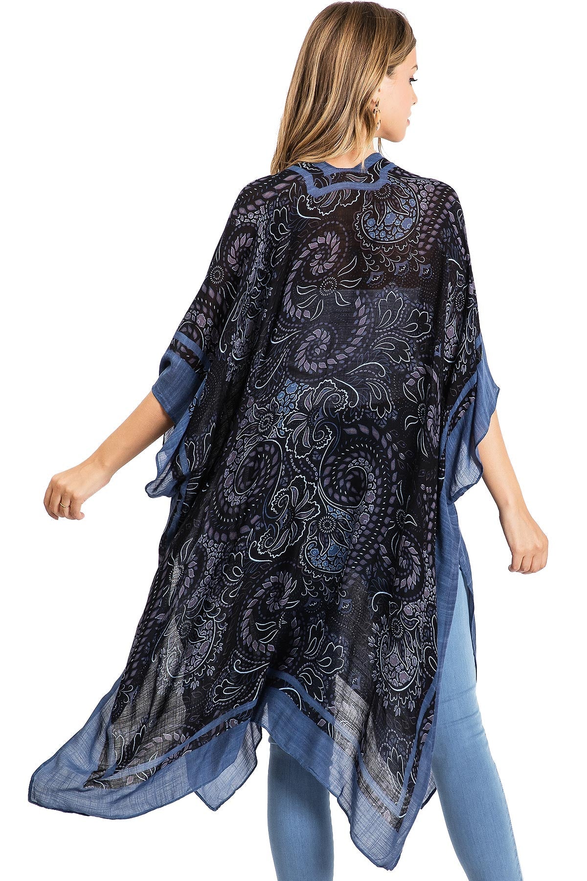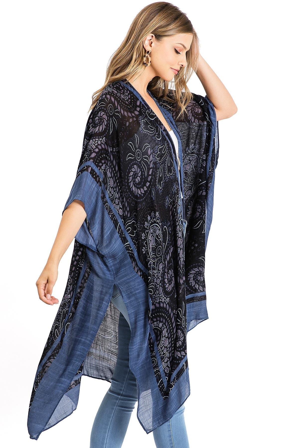 Beautiful boho printed cardigan with an open-front kimono silhouette. Light and sheer fabric is great for layering over casual outfits or as a cover-up.