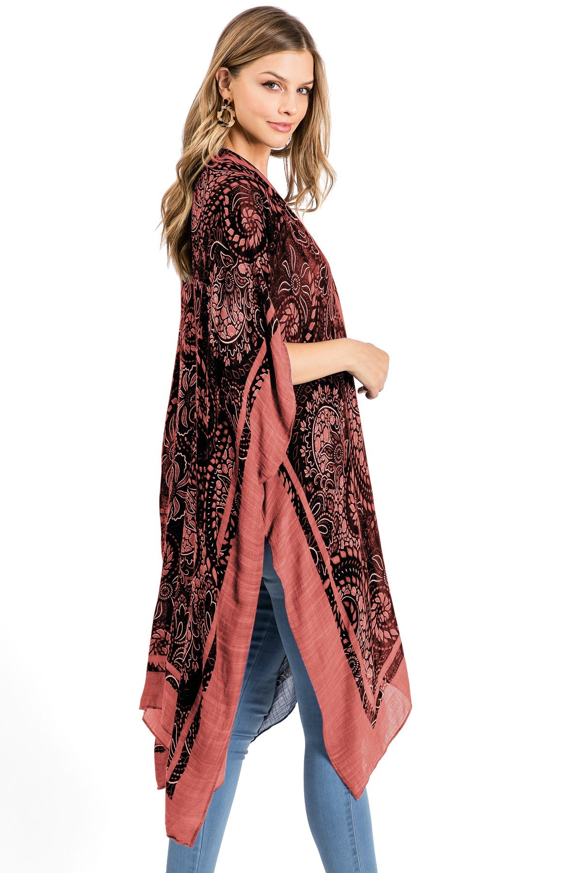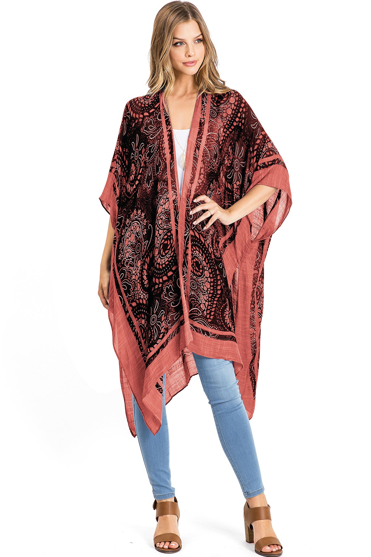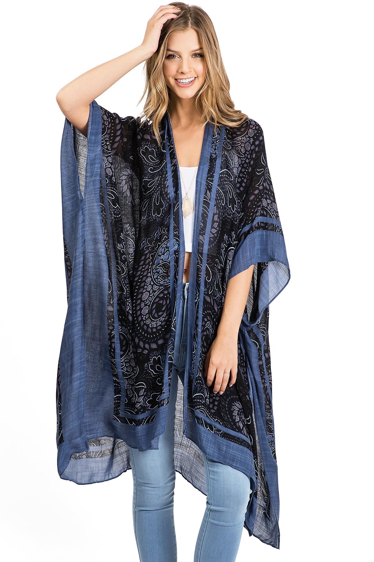 Beautiful boho printed cardigan with an open-front kimono silhouette. Light and sheer fabric is great for layering over casual outfits or as a cover-up.