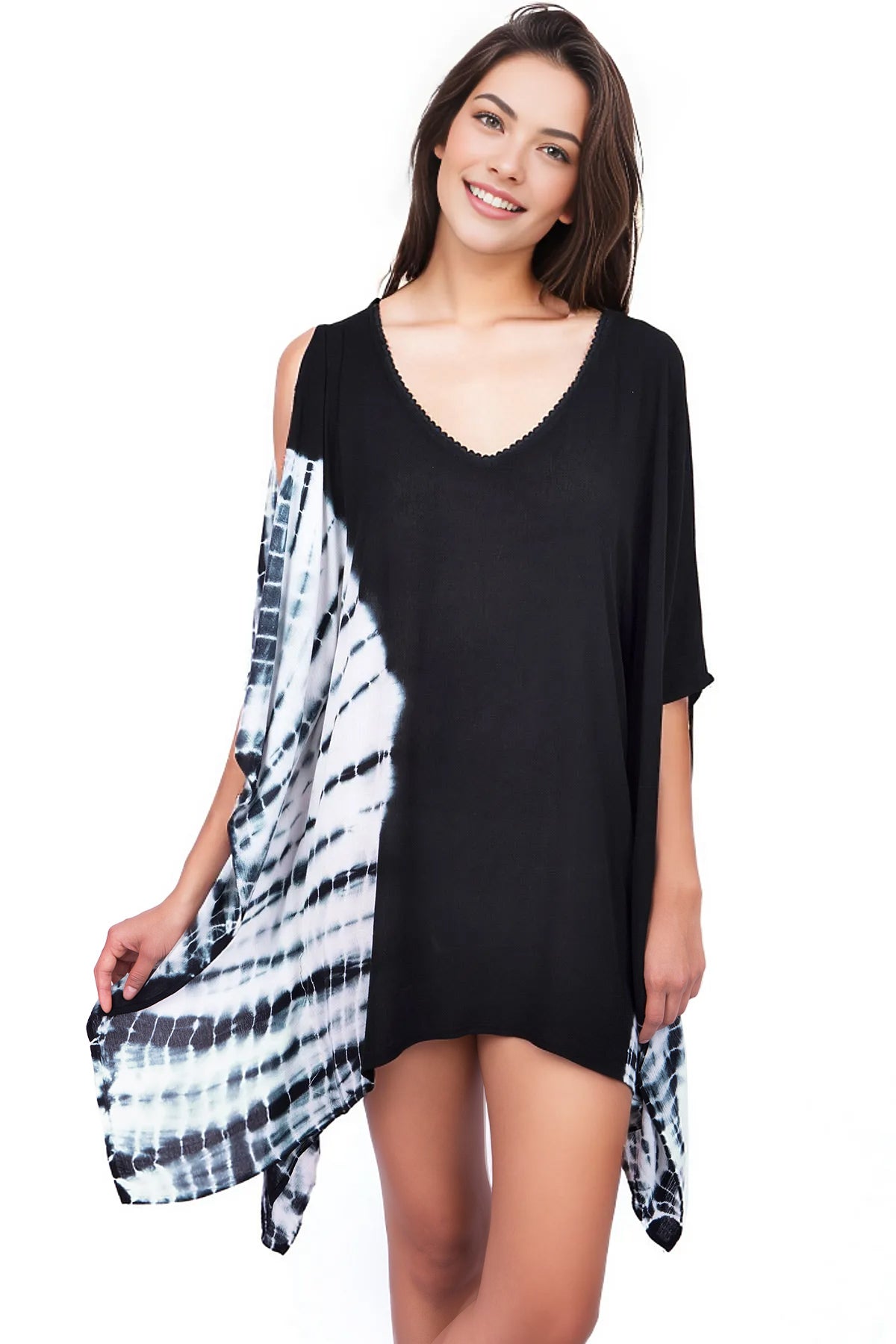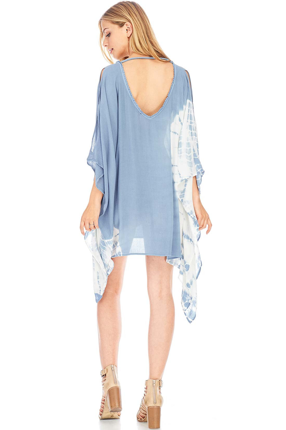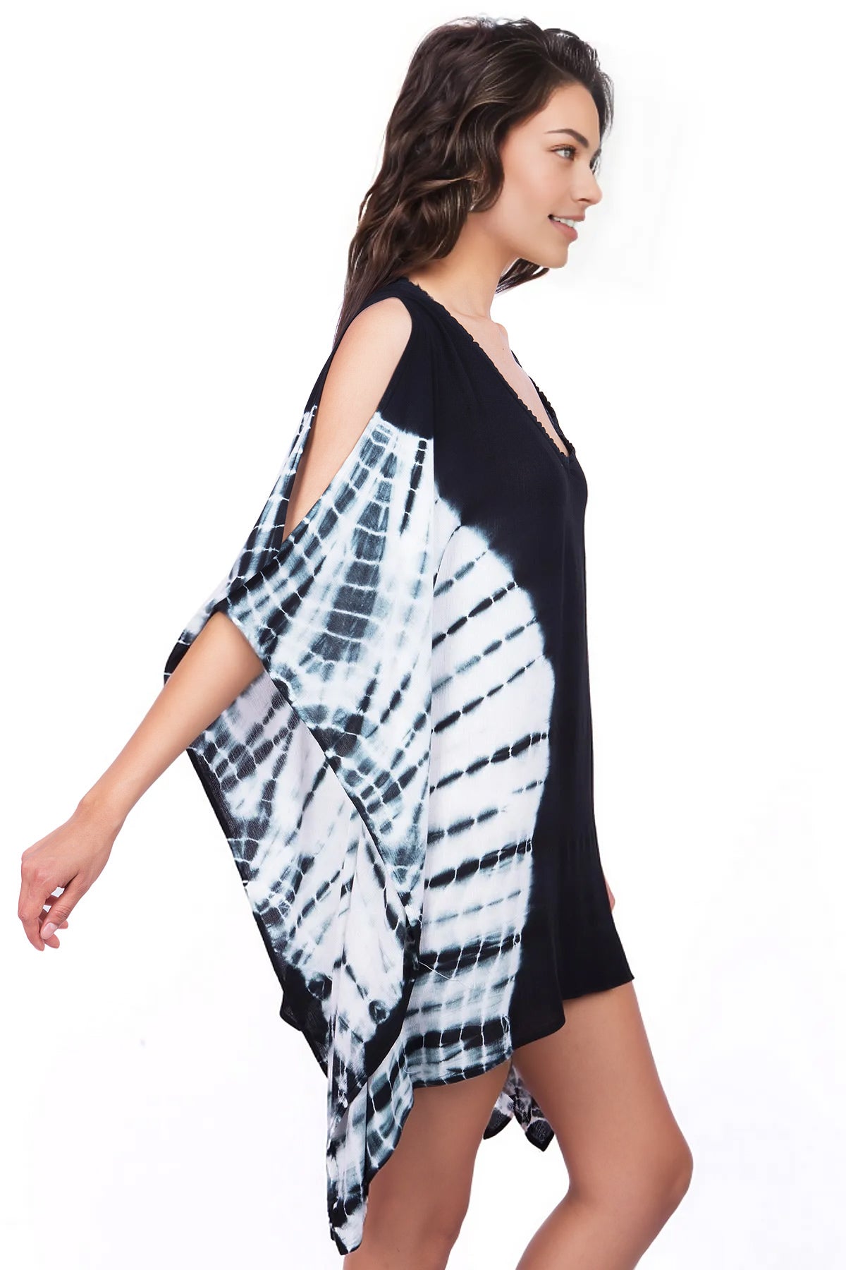 Beautiful tie dye dress with wide kimono sleeves and V-neckline. Cut out designs on the shoulder and soft comfortable fit when worn. Statement dress that still has a casual feel.
